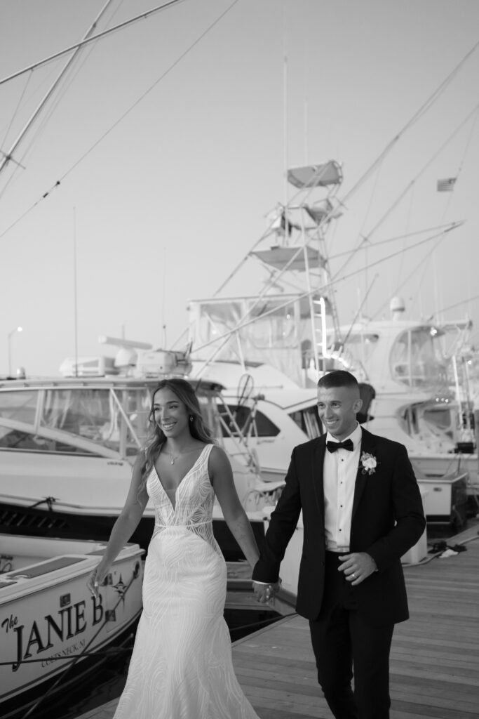 Shore Vibes: “We wanted to have beachy aspects to our wedding but did not want to necessarily have a wedding on the beach,” says Mia. They loved Mallard Island Yacht Club’s open, elegant feel, the chapel sitting on a pier that overlooks the bay, and the fact that you can rent out the entire venue overnight for accommodations for friends and/or family.