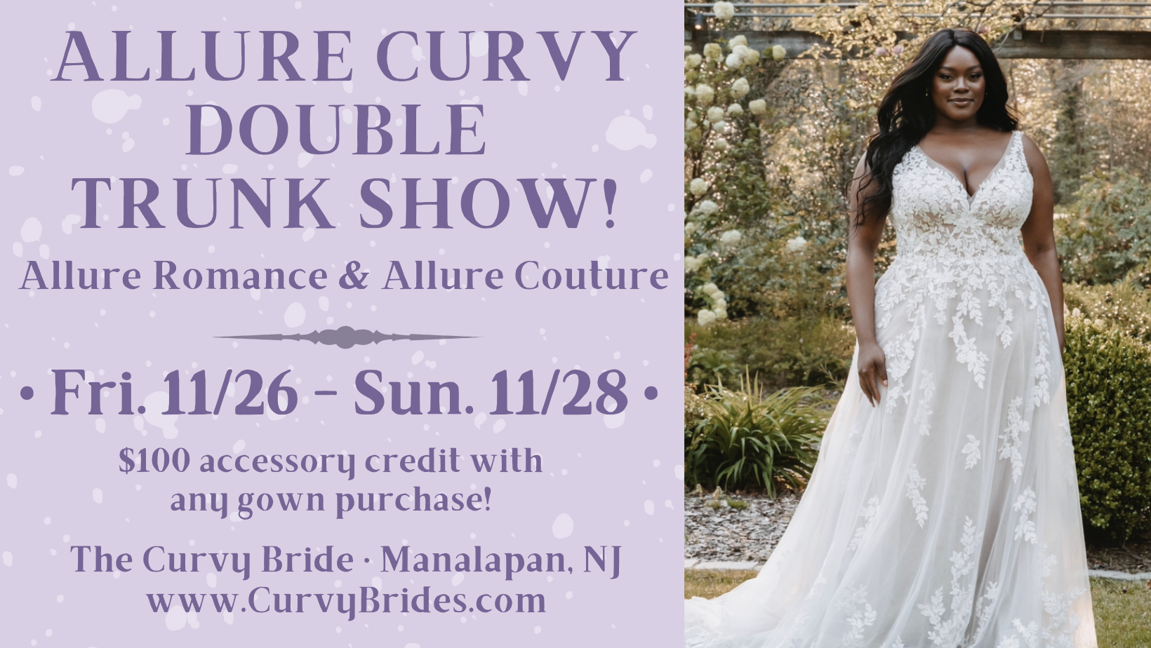 Exciting news! We are having our first ever DOUBLE trunk show for Black Friday Weekend, Nov. 26th – Nov. 28th! Featuring both Allure Couture and Allure Romance lines! In addition to getting an amazing deal on these drop dead gorgeous gowns, we are also offering a $100 accessory credit with any gown purchase! Brides, these appointments will go fast! Schedule yours today! Visit our website www.curvybrides.com to schedule your private appointment!