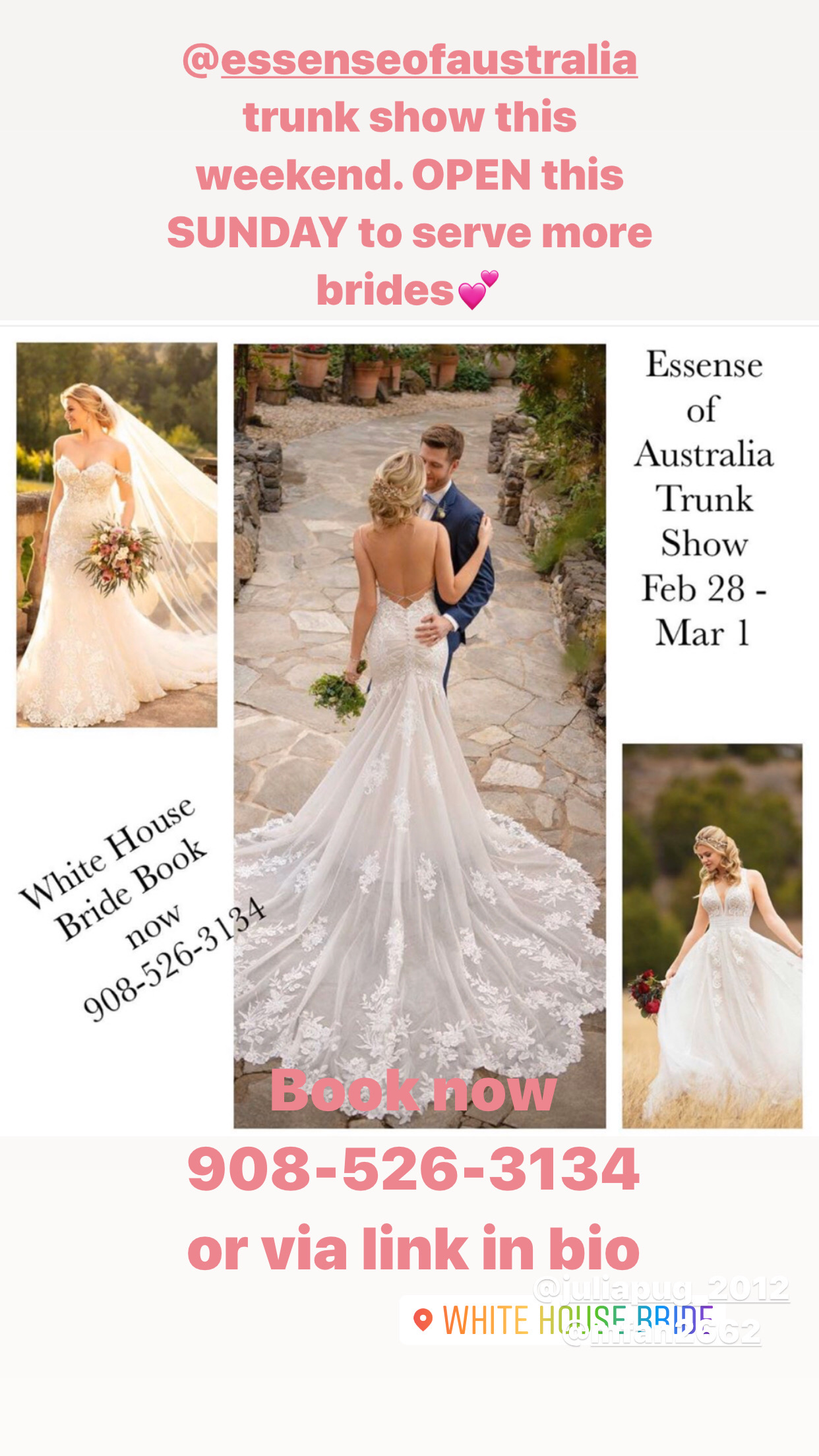 White House Bride will have the latest collection from Essense of Australia in our boutique this weekend. Receive 10% off any veil or accessories with purchase. Book now: 908-526-3134 or online at: https://whitehousebride.com/white-carpet-experiences/#appointment