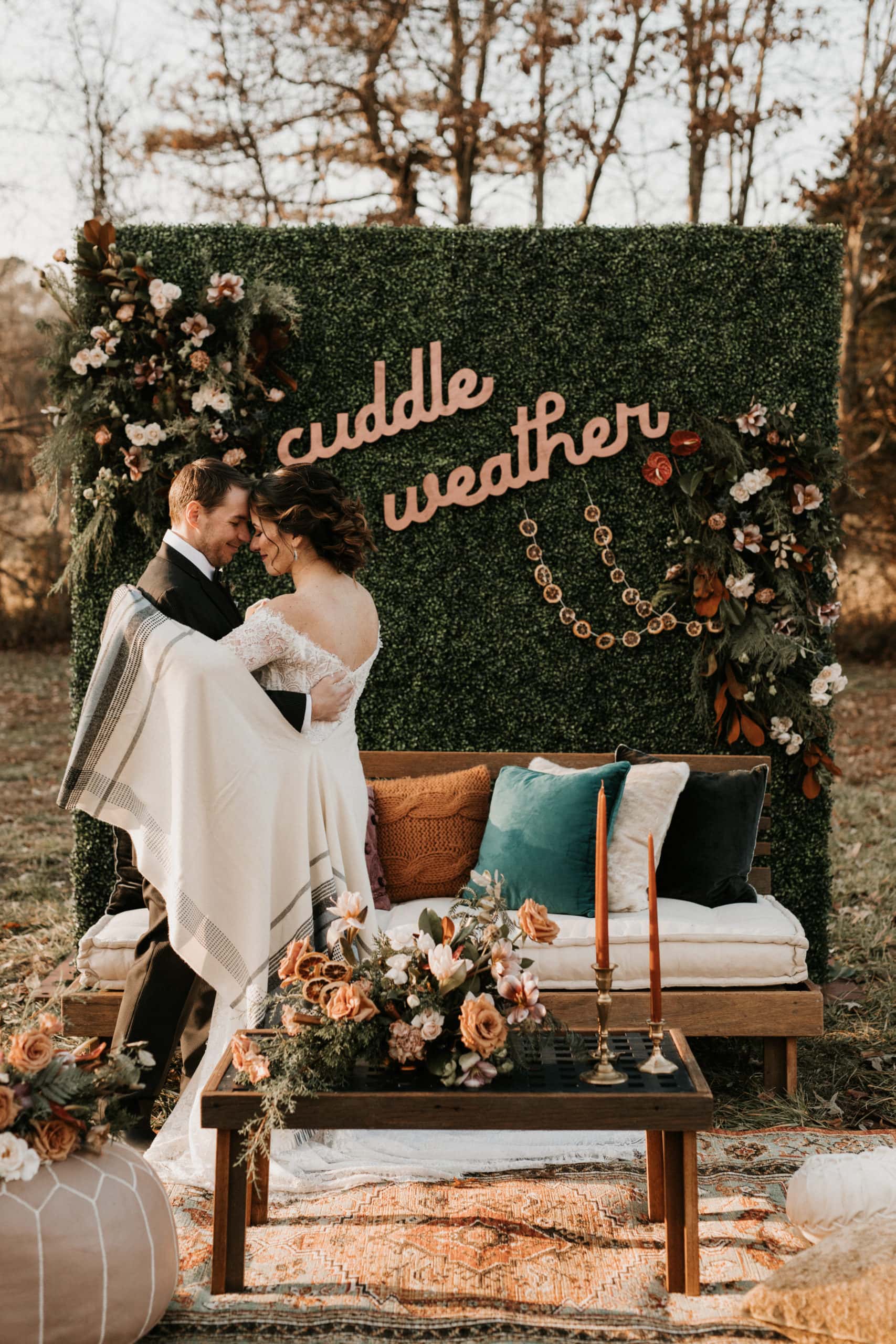 The perfect boxwood backdrop for your reception lounge area. From Rustic Drift on Long Beach Island.