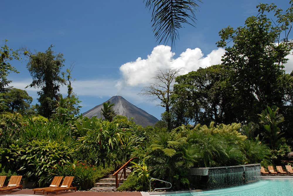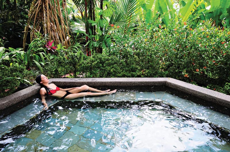 At check in, you’ll see guests milling about wearing bathrobes—don’t be alarmed. This is the wardrobe of choice for many who spend their days in and out of the property’s mesmerizing mineral springs—a short downhill stroll from the lodging. Walk or take the shuttle to be there in a jiffy. Amid Tabacon’s lush landscape are rushing arteries of natural thermal waters, reined into waterfalls, they pour into dipping ponds and secluded swimming areas. As soon as you see the winding springs cascading among the flora, you will understand the robes and the temptation to stay in swimwear all the daylong. The guests-only, adults-only section of the springs is actually called Shangri-La Gardens. (Yes, please!) It will be hard to tear yourself away, but there are don’t-miss excursions nearby (the front desk will happily assist in setting these up).