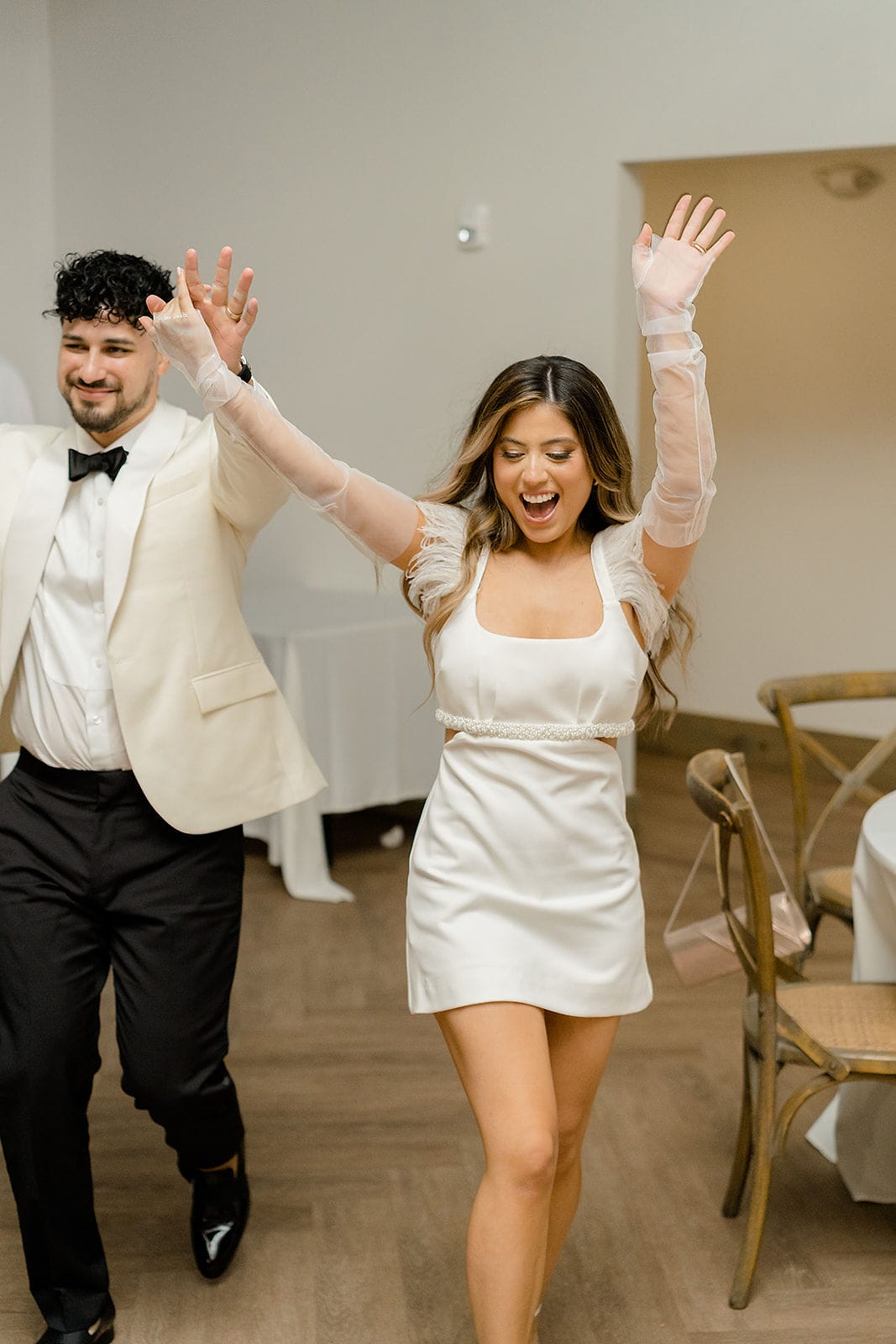 Why We Love It: This bride had so much fun in this short satin dress with an embellished waist and a fringe shoulder—and it shows. Plus, she slipped on sheer gloves for an added personal touch.