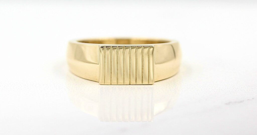 The custom Blake ring is a powerful statement, perfect as a men’s band or unisex wedding band. Available in 14K white, yellow and rose gold and platinum; $1,970 at taylorcustomrings.com.
