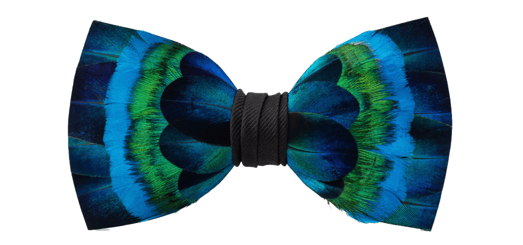 The Chisolm bow tie is painstakingly made from individual, hand-selected and trimmed peacock feathers with a black grosgrain center wrap; $225 at brackish.com.