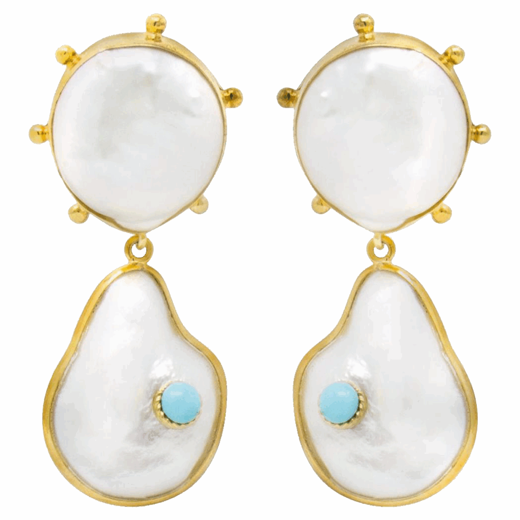 Elegant Rebel Rebel pearl and turquoise drop earrings are ideal for a beach bride. 18-karat gold-plated silver with lightweight baroque pearls; $216 at 1stdibs.com.
