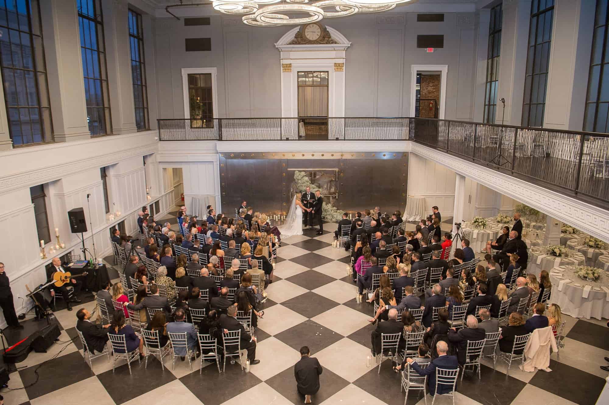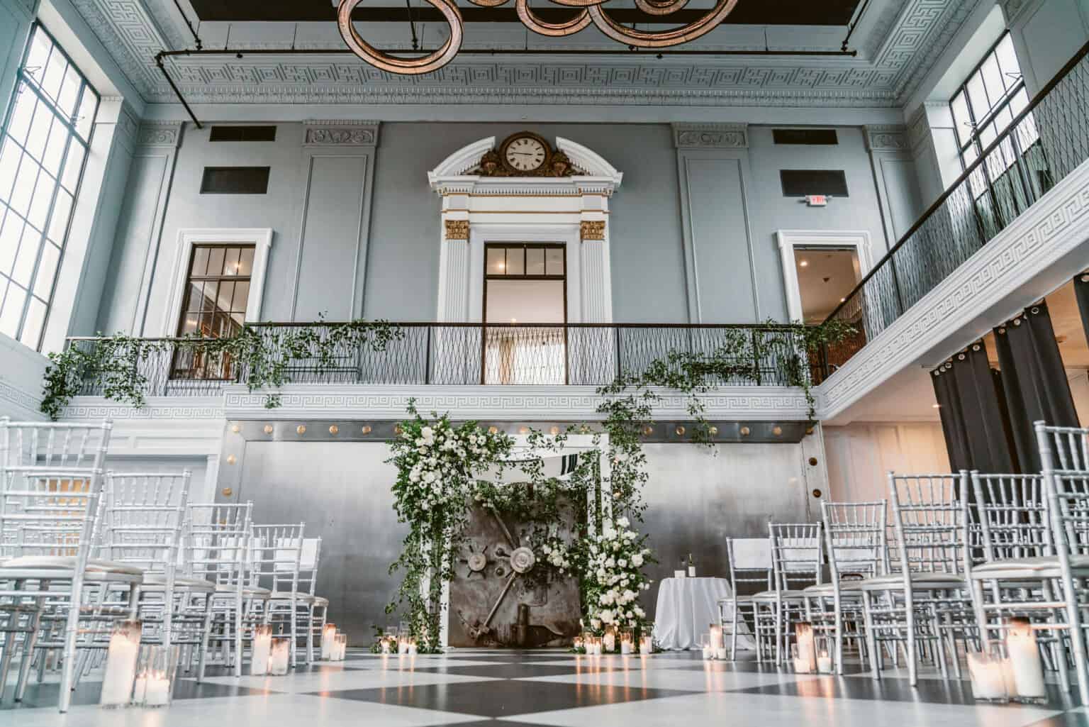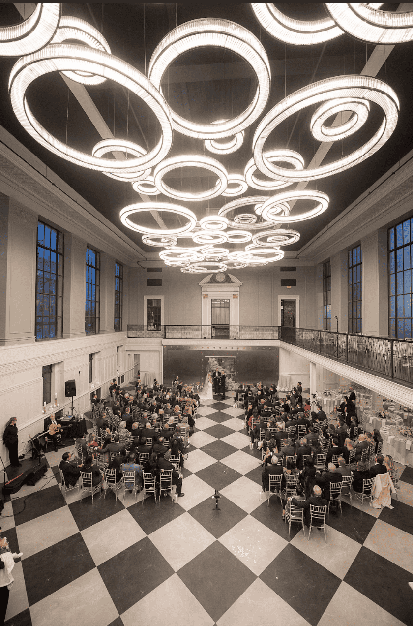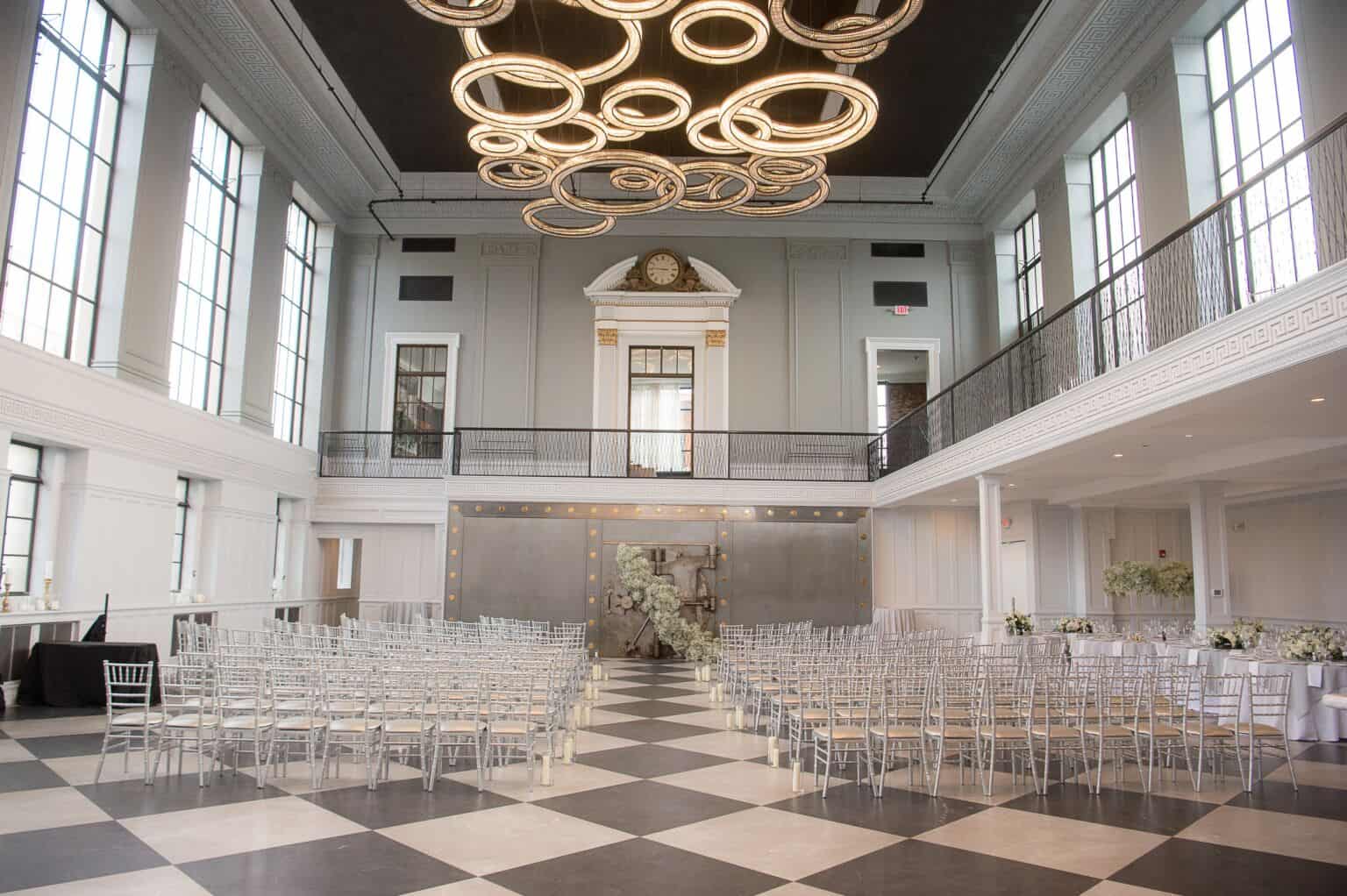 This neoclassical bank space features marble columns, soaring windows, towering ceilings, and a wraparound mezzanine for cocktail hour. Elements of brass, marble, the iconic Bank Vault Door, and the floating chandelier sculpture combine to impress and delight the senses, promising celebrations never to be forgotten.