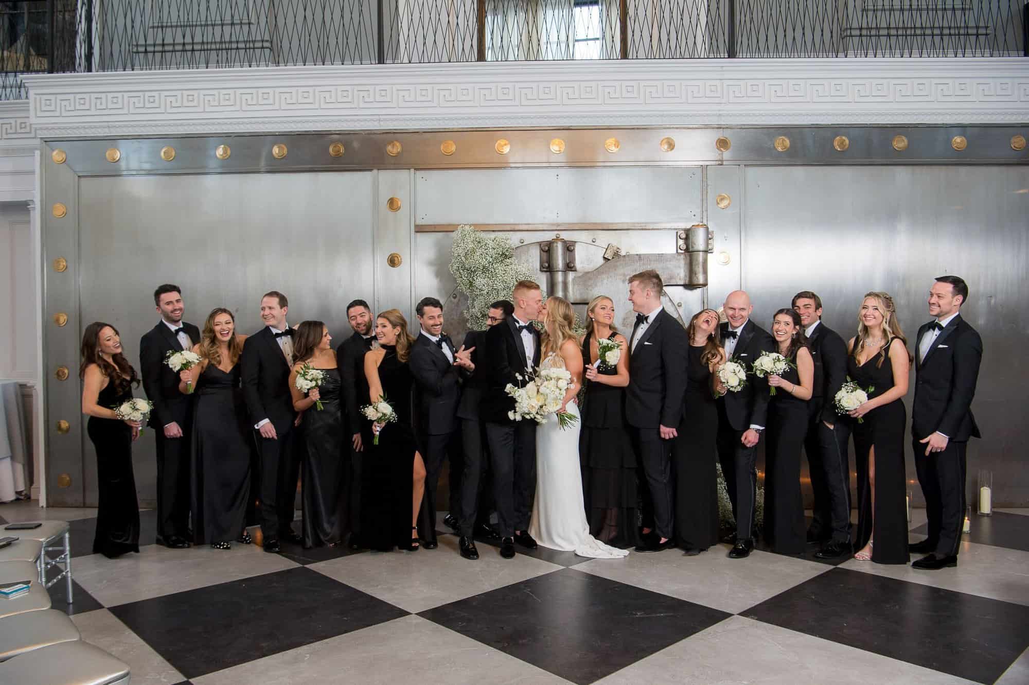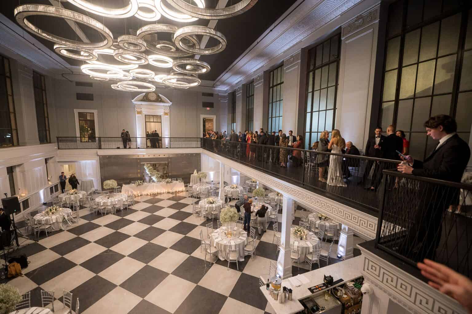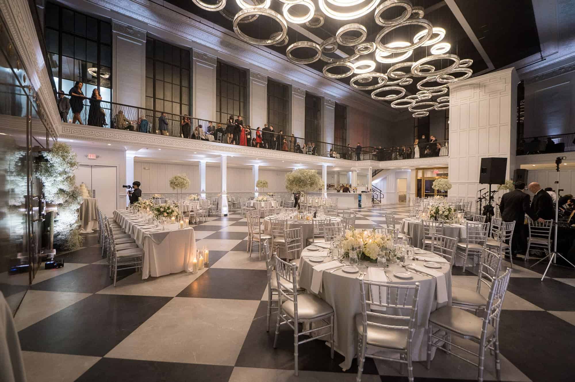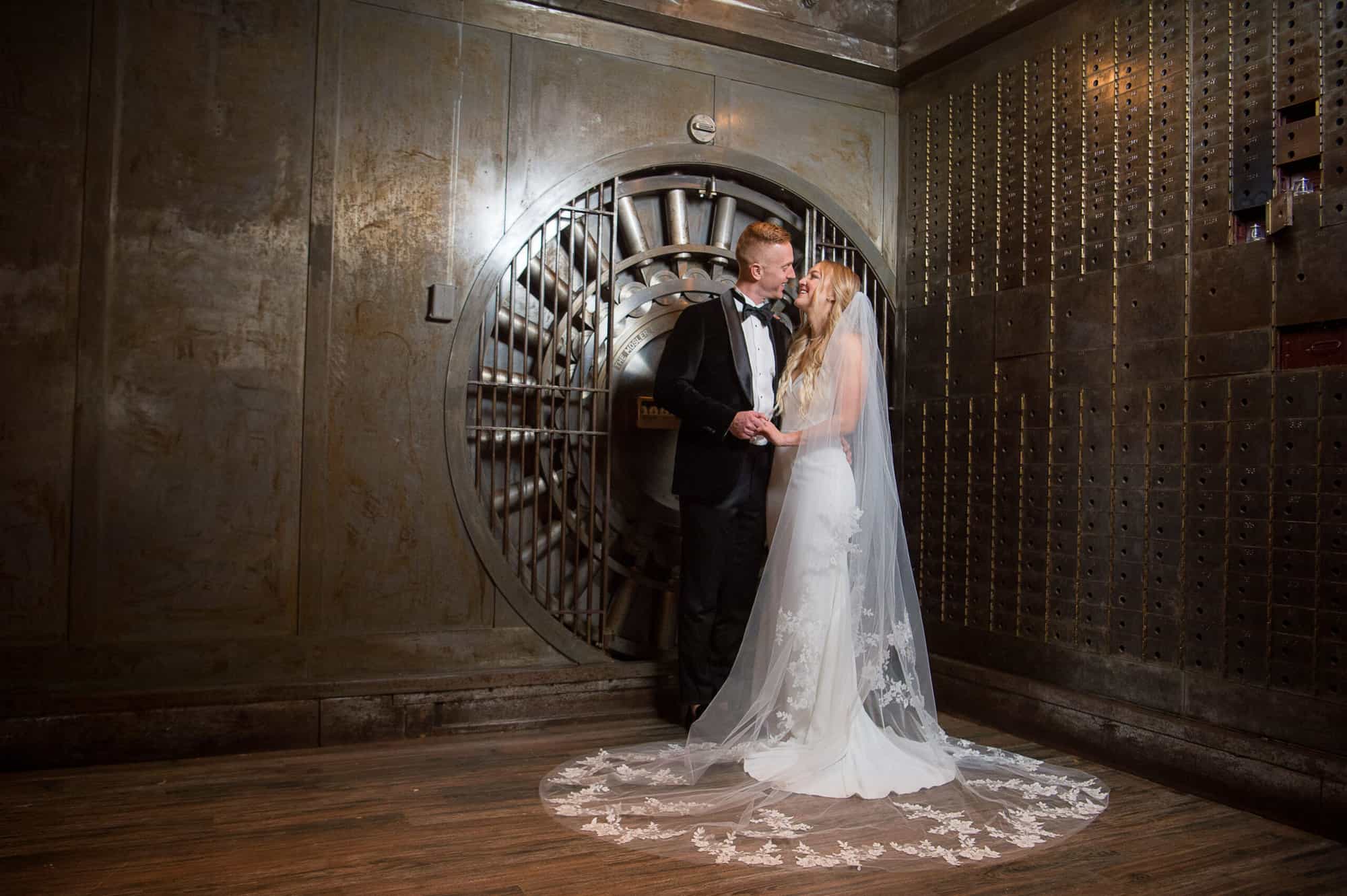 This neoclassical bank space features marble columns, soaring windows, towering ceilings, and a wraparound mezzanine for cocktail hour. Elements of brass, marble, the iconic Bank Vault Door, and the floating chandelier sculpture combine to impress and delight the senses, promising celebrations never to be forgotten.