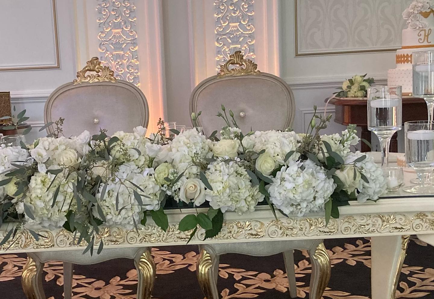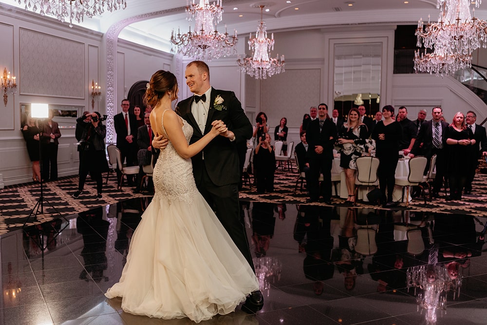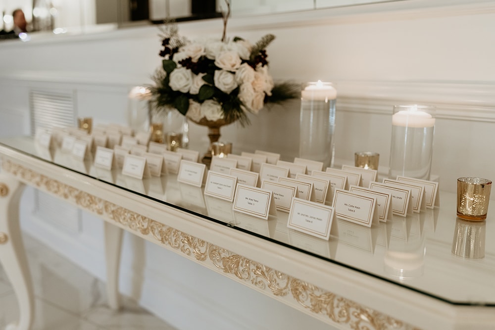 Once the cocktail hour is completed, the doors will open into the grand ballroom. The couple will make their first appearance as a married couple as they descend the elegant, curved mahogany staircase into the ballroom. Awaiting them are their honored guests and a fabulous five-course culinary experience. Macaluso’s is known for their elaborate Venetian room displays where a confectionery concerto of taste-tempting sweets awaits.