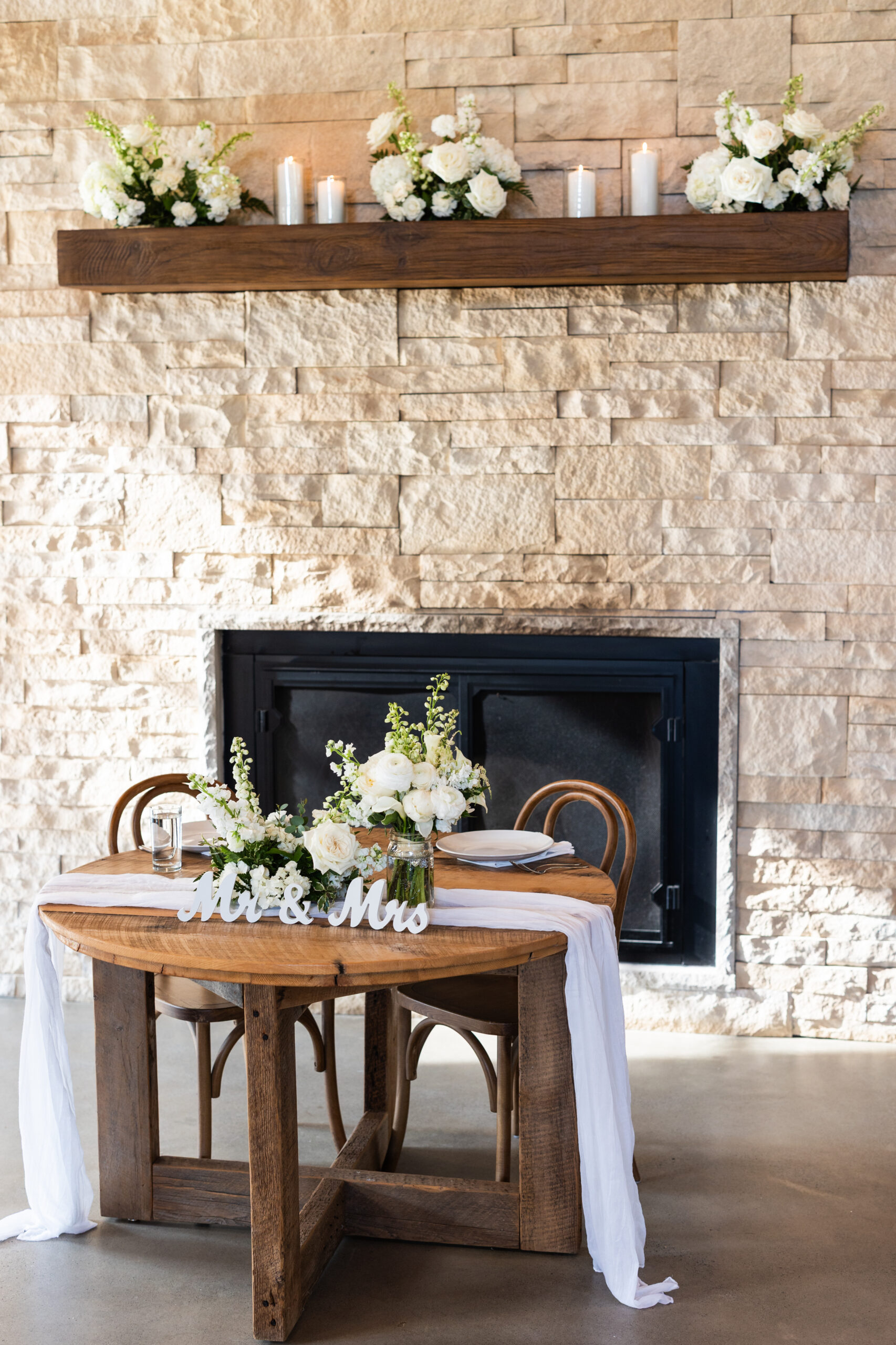 - Handcrafted farmhouse tables, wooden bentwood chairs, and a glowing fireplace create a cozy yet sophisticated setting