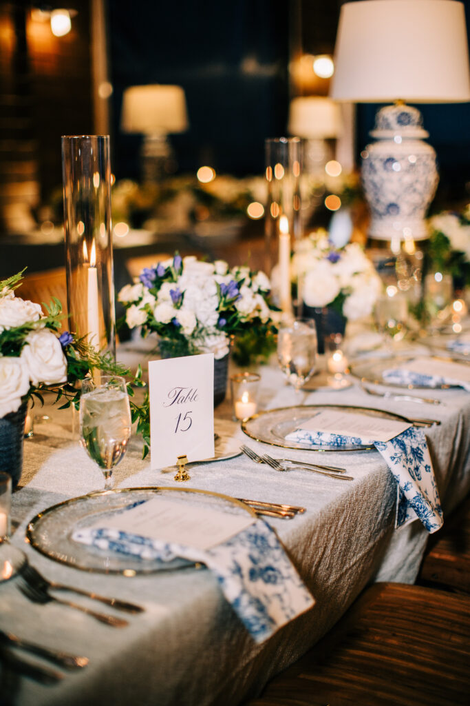 A Cozy November Wedding with Blue and White Accents, Like Lamp Centerpieces