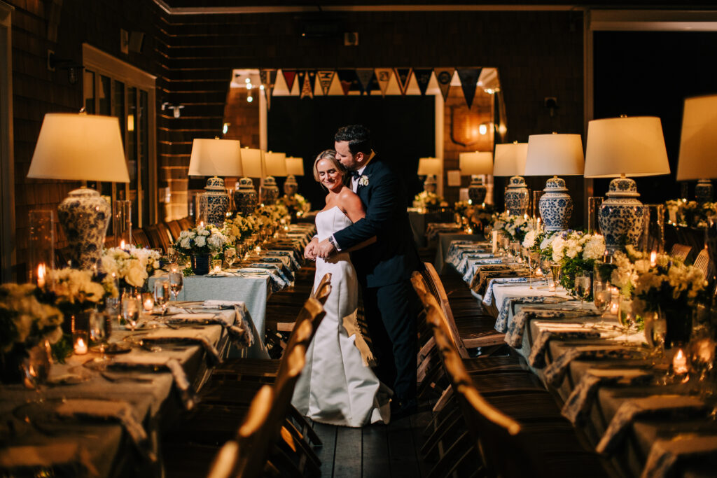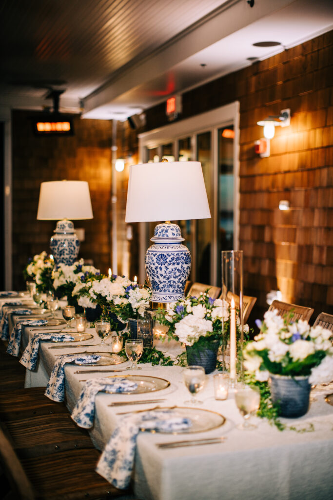 “Dim lighting, an abundance of candles, and blue-and-white accents perfectly complemented the cedar shake building.”