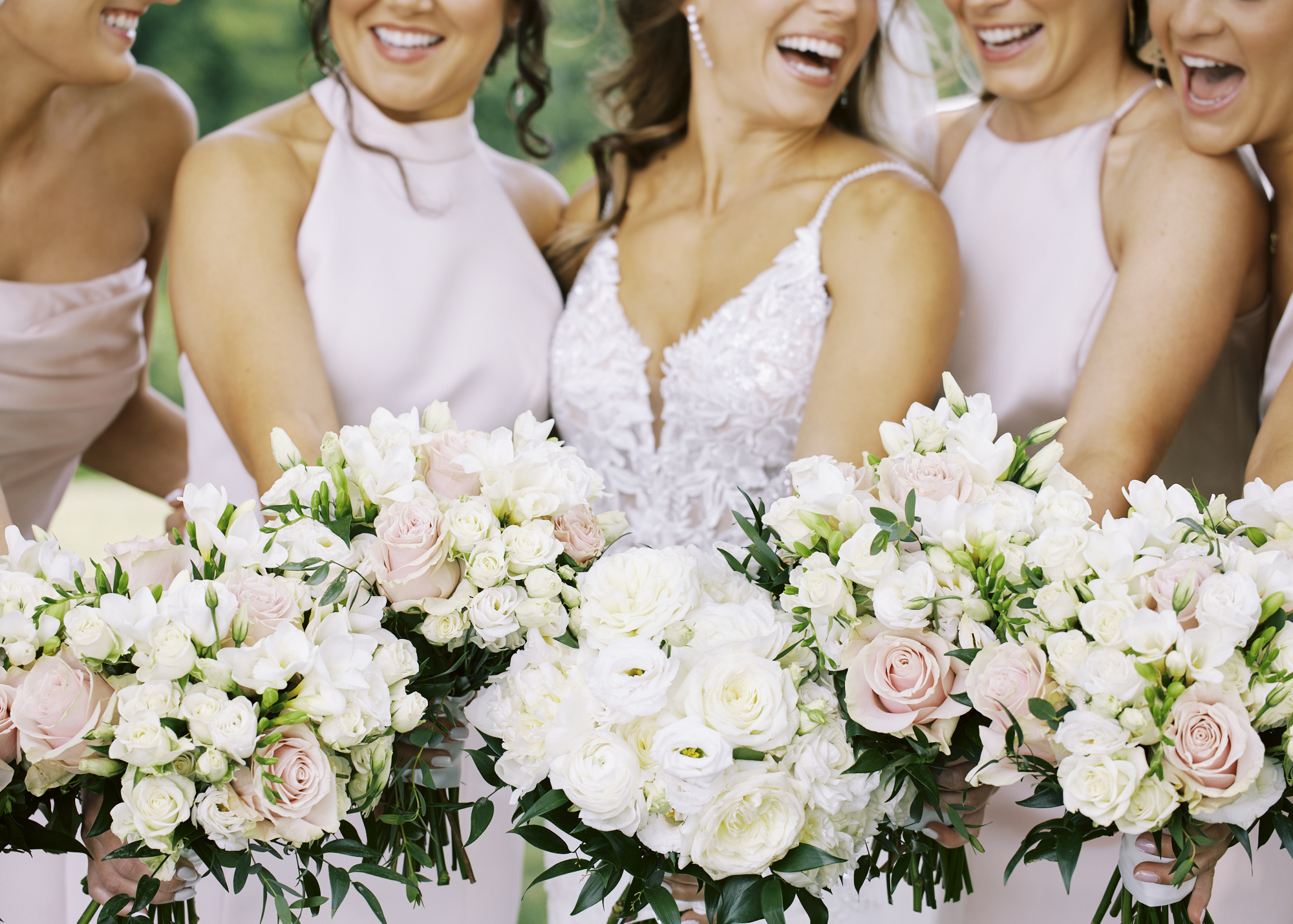 For their June 16, 2023 wedding, the couple wanted an atmosphere that was rustic, elegant, traditional and down-to-earth. The flowers in the wedding party’s bouquets were pink Mondial Roses, white Freesia and spray roses. The flowers in their mix of tall and short centerpieces were white Hydrangea, pink Novia roses, pink Larkspur and white Lisianthus, white Peonies and pink Dendrobium.