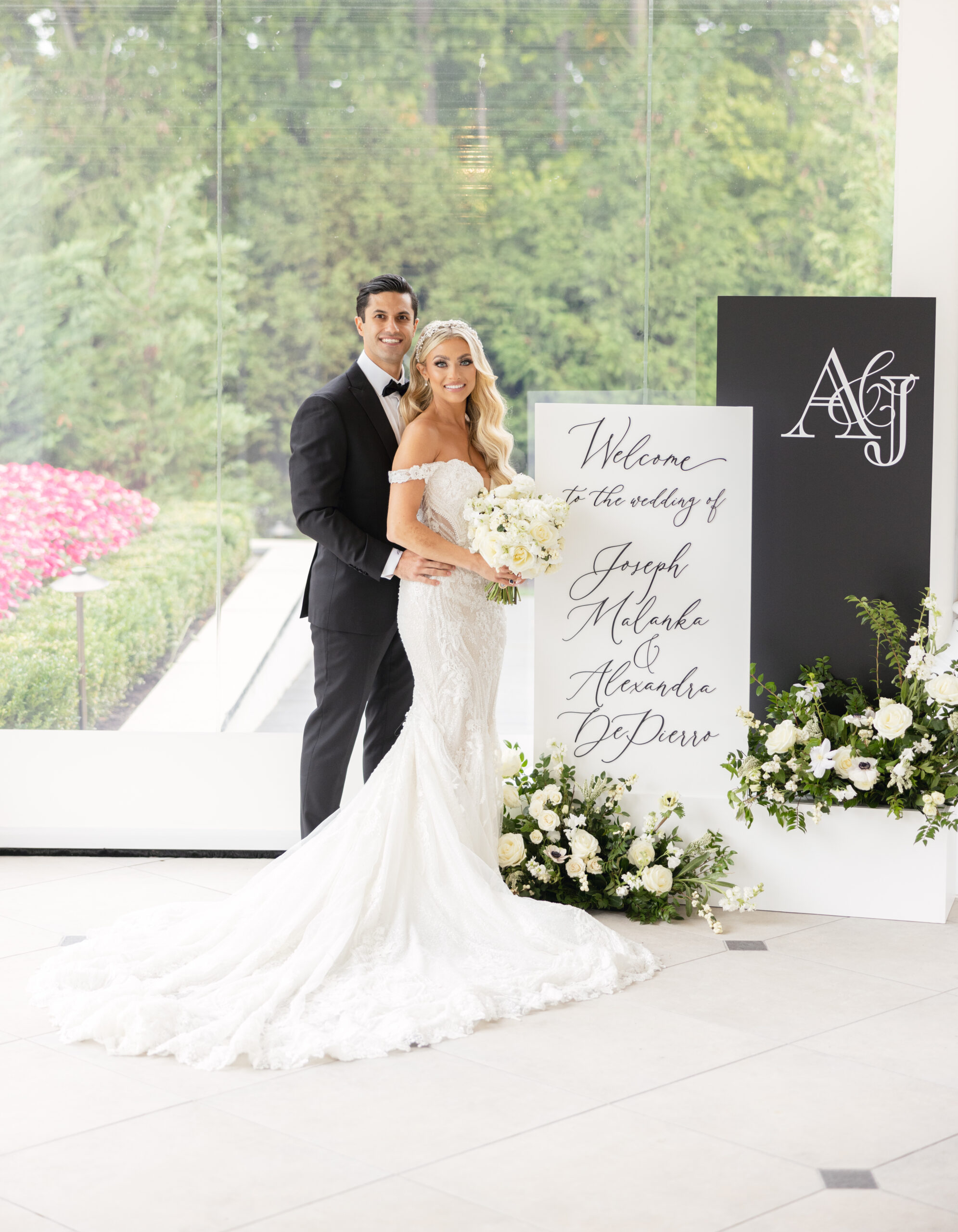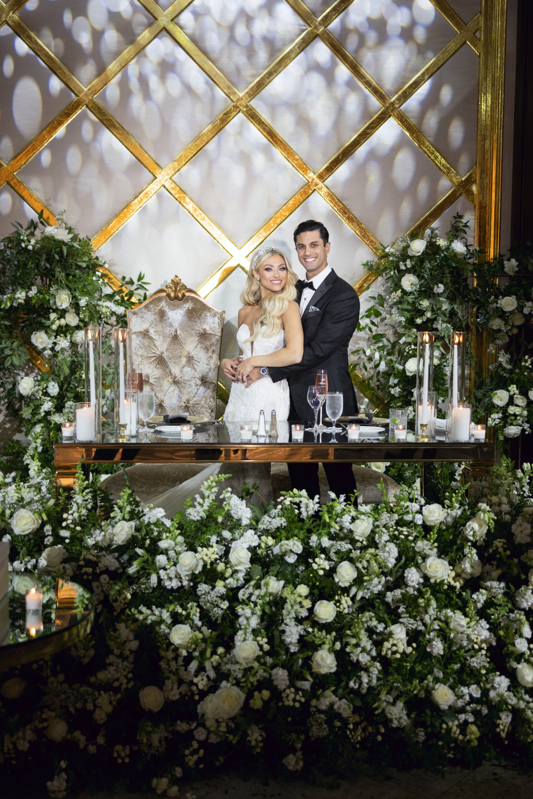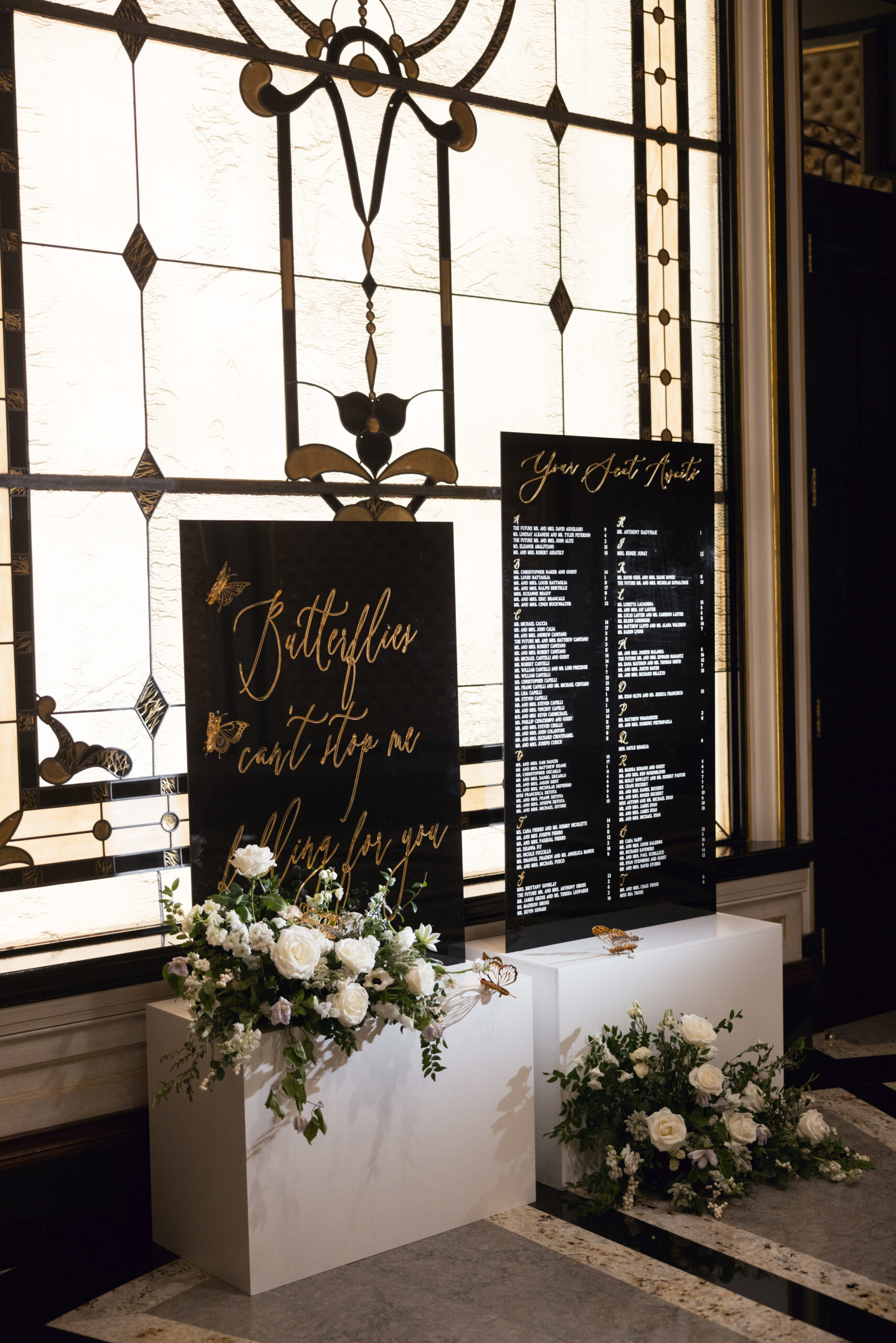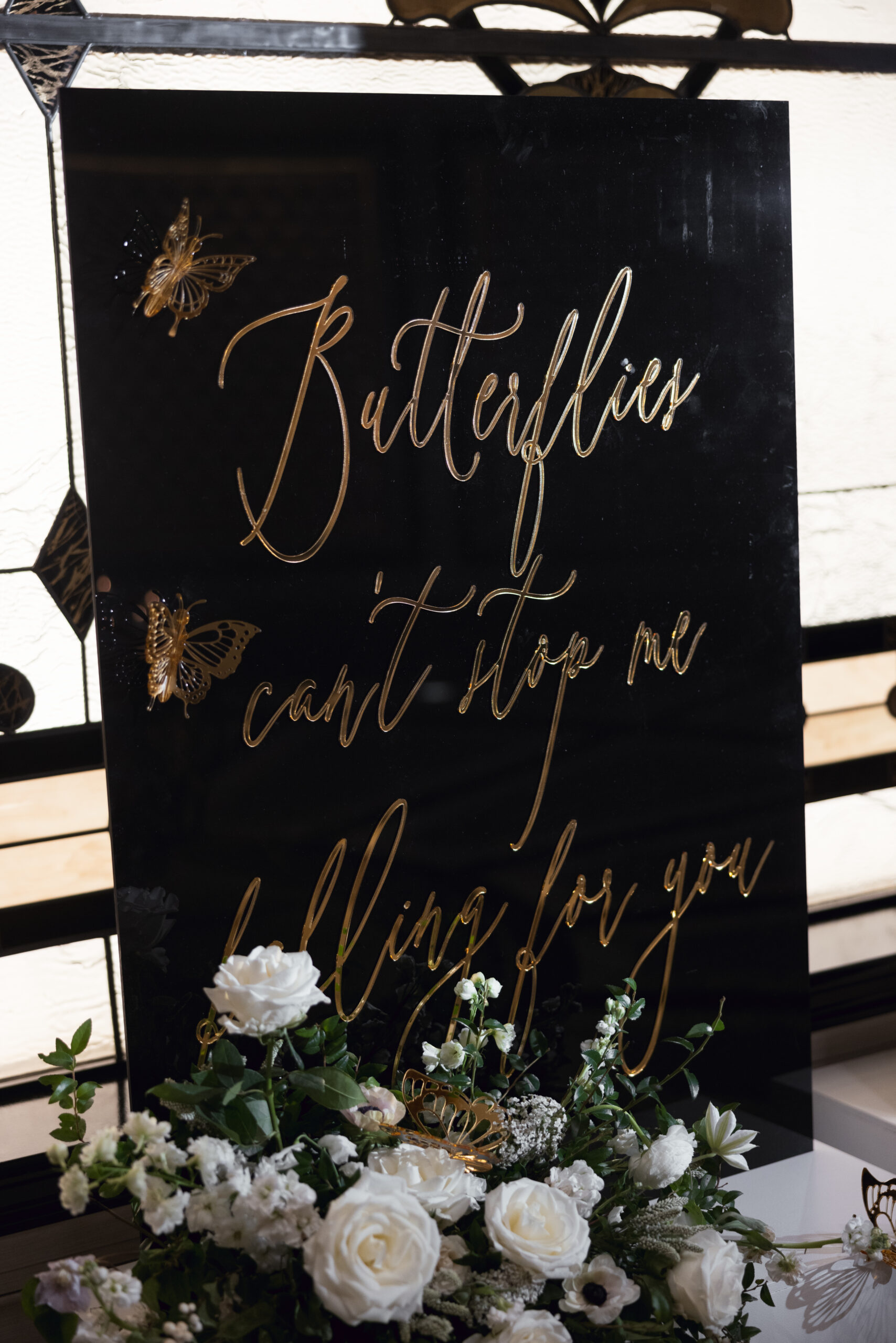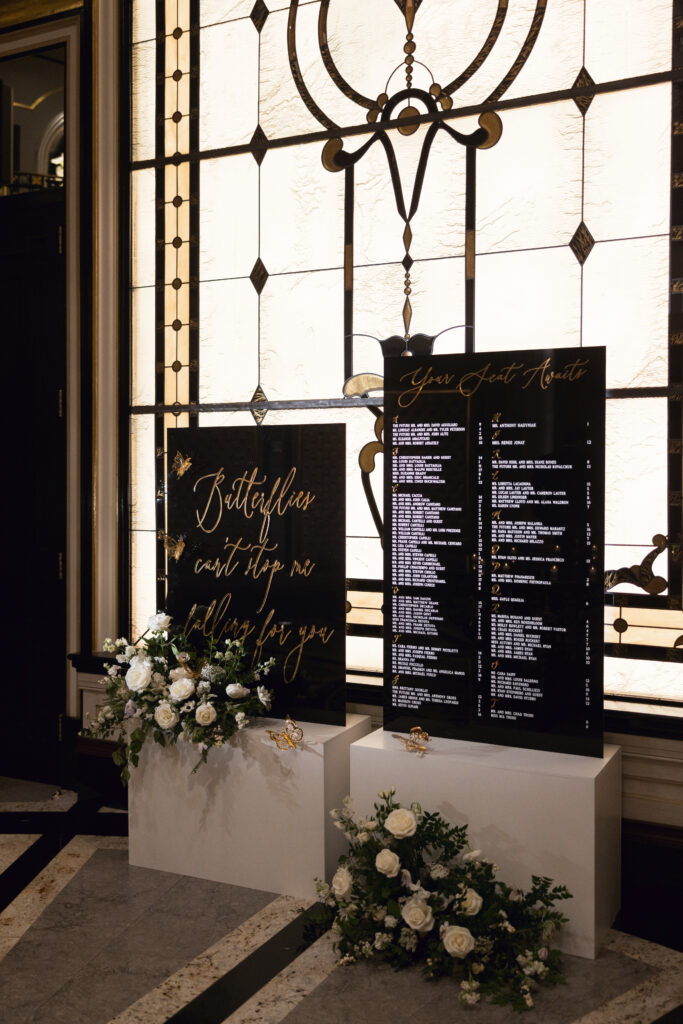 Joe and Alex wanted their September 30, 2022 wedding to feel like they were getting married in their mansion in old school New York. Romantic flowers were chosen to cut the masculine black, gold and white tones of the venue and they added a “grew here” feel as if they were in their own garden. Touches of butterflies also lined the brides veil and signage as a tribute to those who couldn’t be there with them that day. Their first dance song was “I Guess I’m In Love” by Clinton Kane.