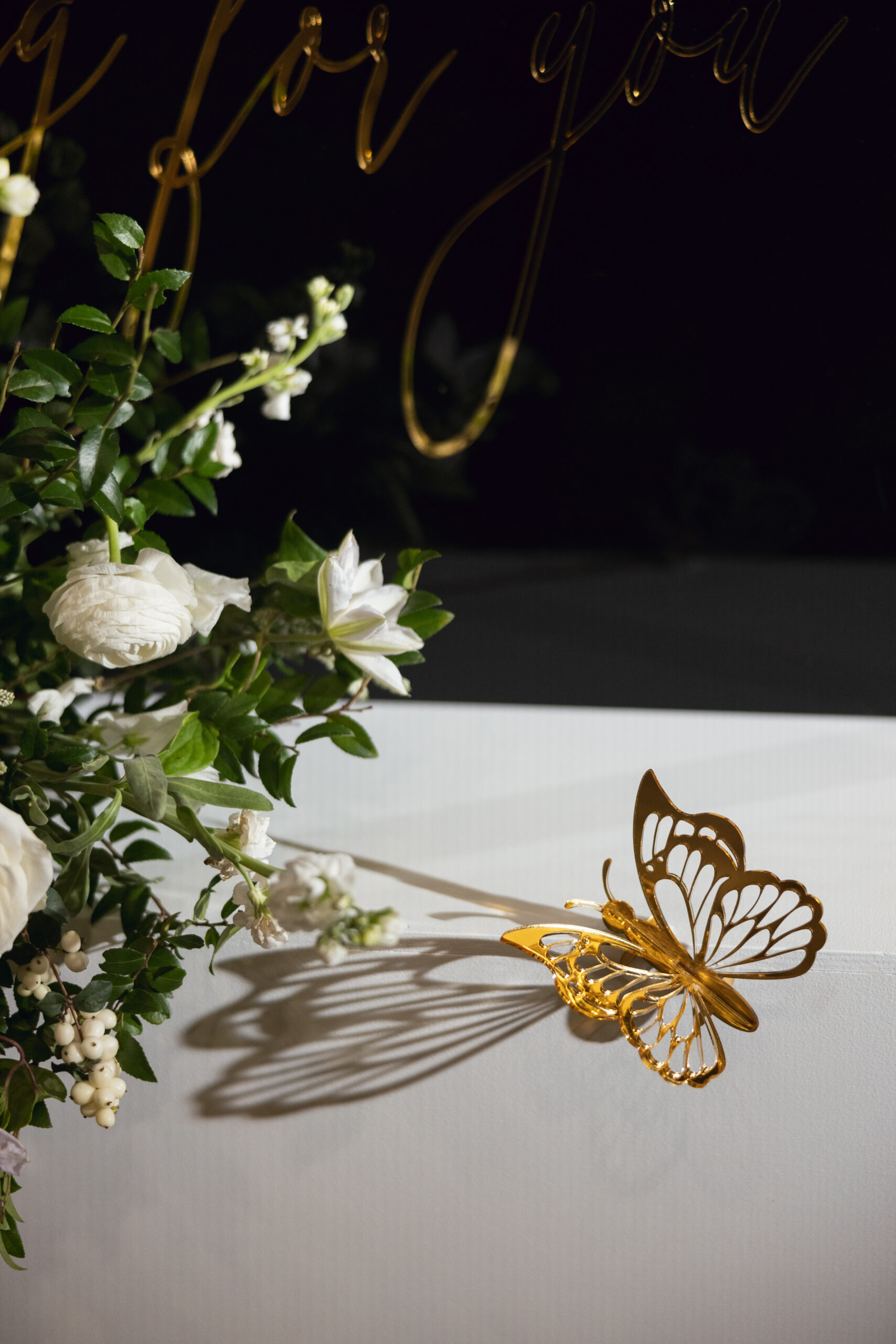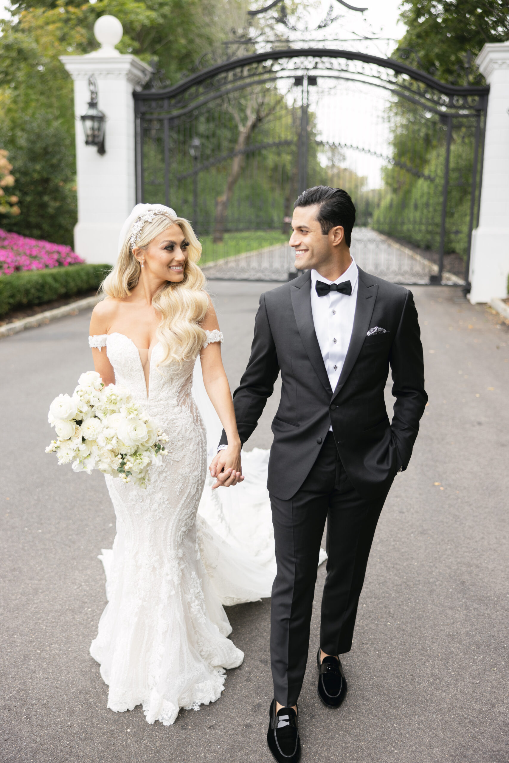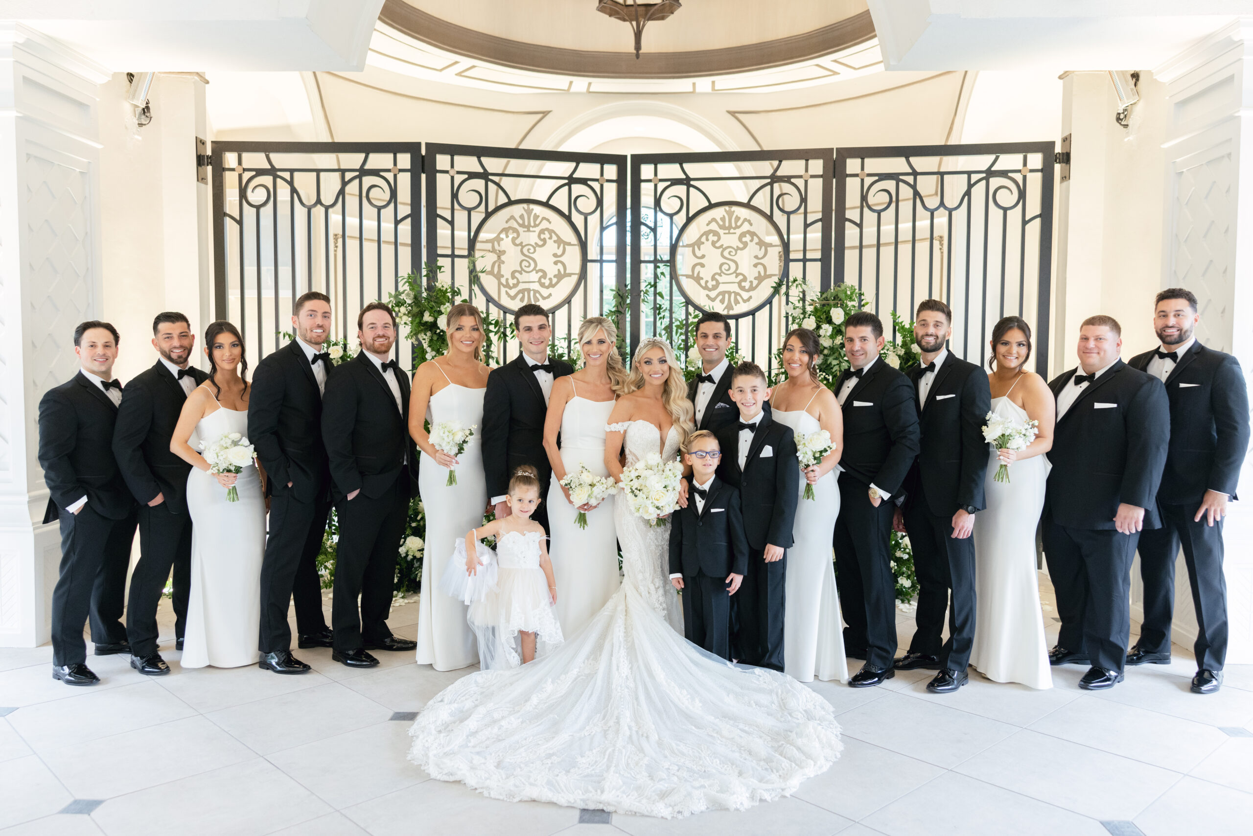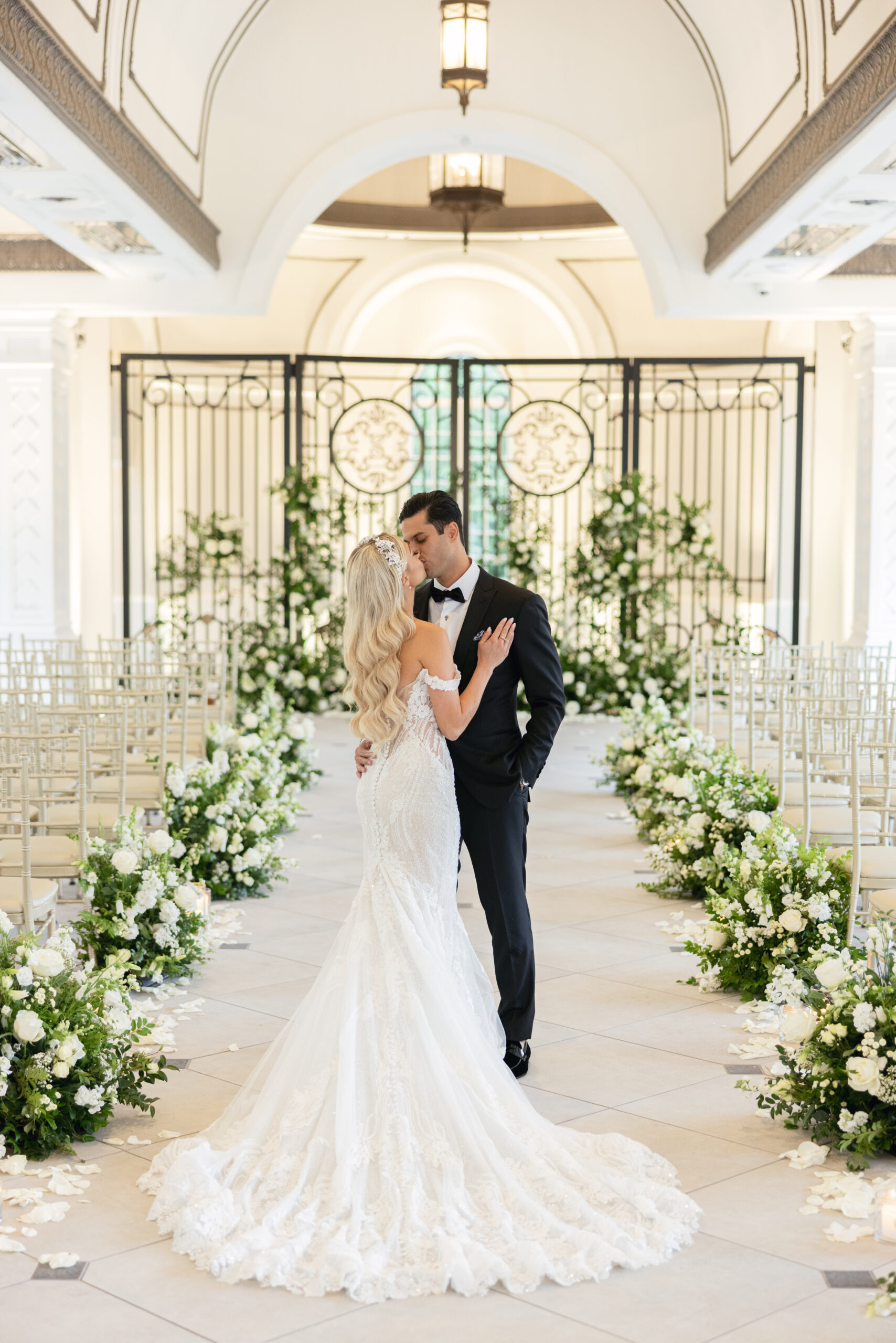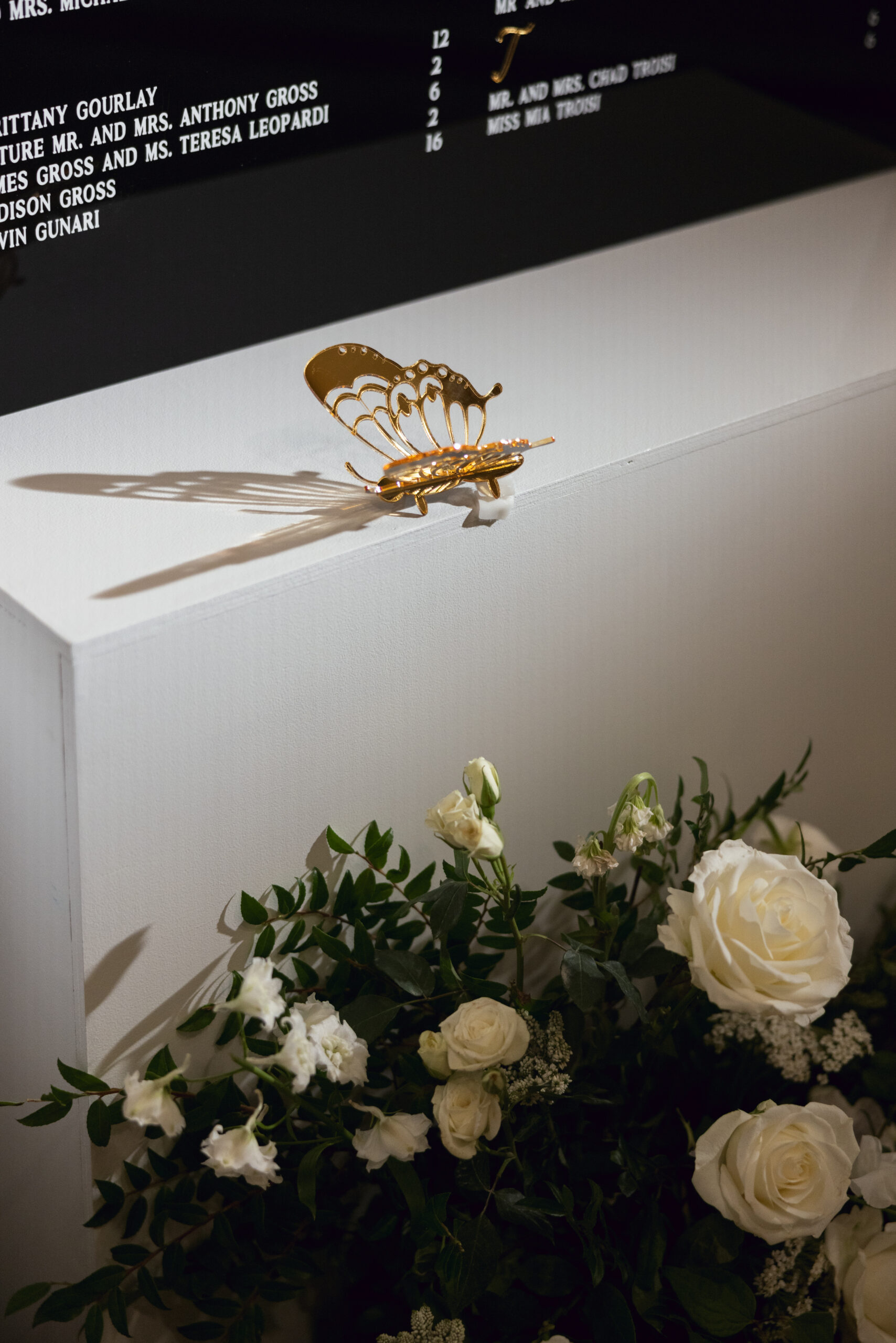 Joe and Alex wanted their September 30, 2022 wedding to feel like they were getting married in their mansion in old school New York. Romantic flowers were chosen to cut the masculine black, gold and white tones of the venue and they added a “grew here” feel as if they were in their own garden. Touches of butterflies also lined the brides veil and signage as a tribute to those who couldn’t be there with them that day. Their first dance song was “I Guess I’m In Love” by Clinton Kane.