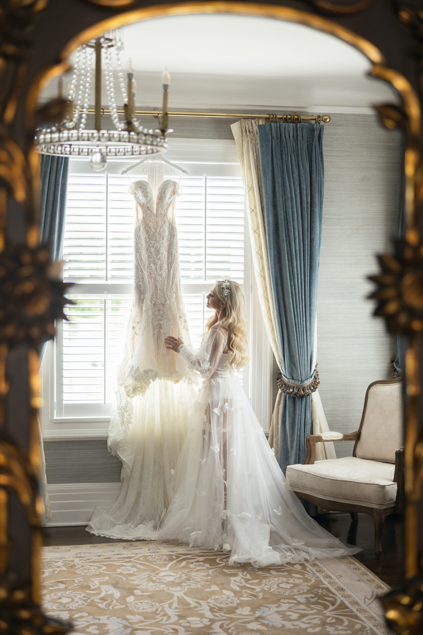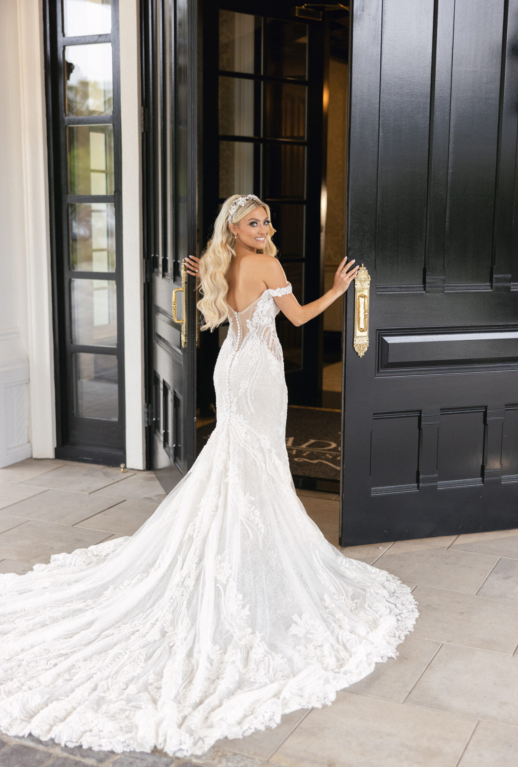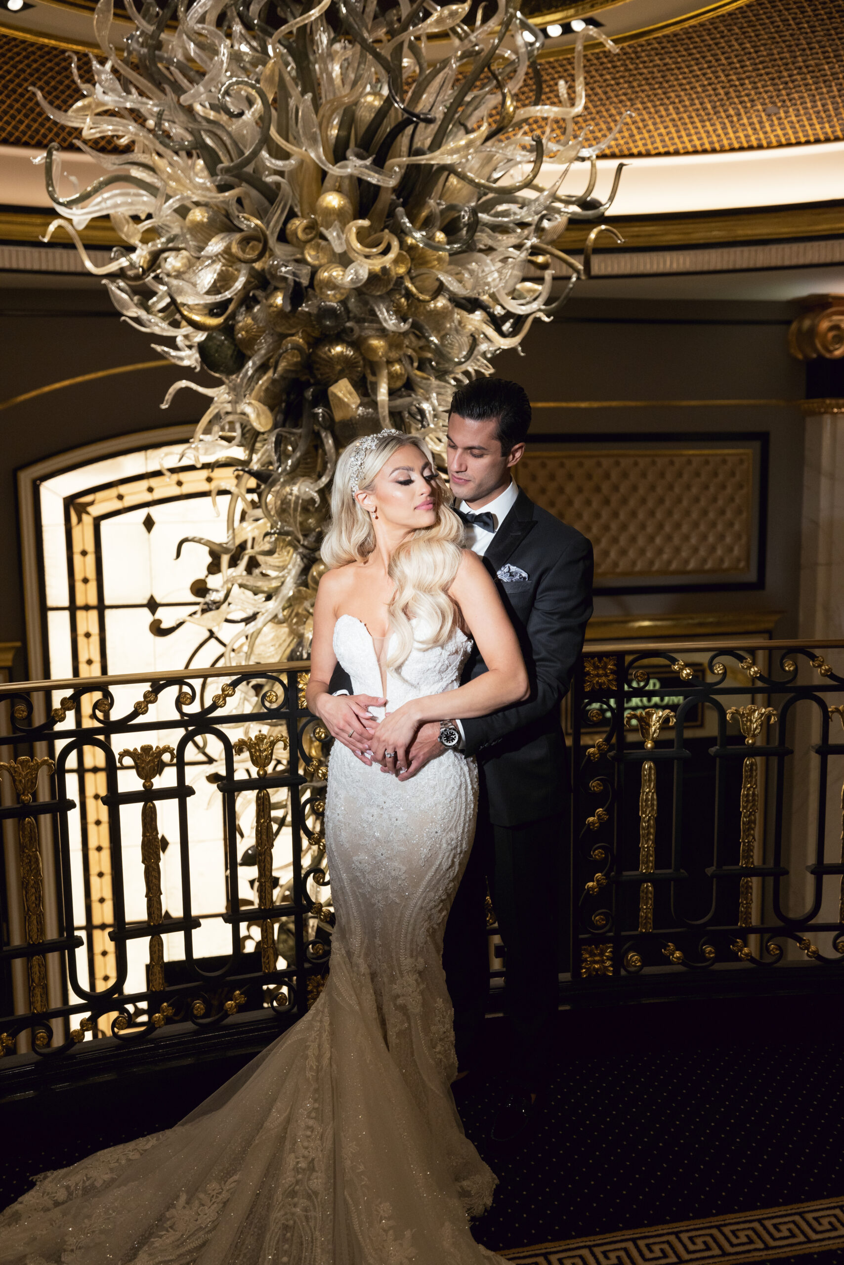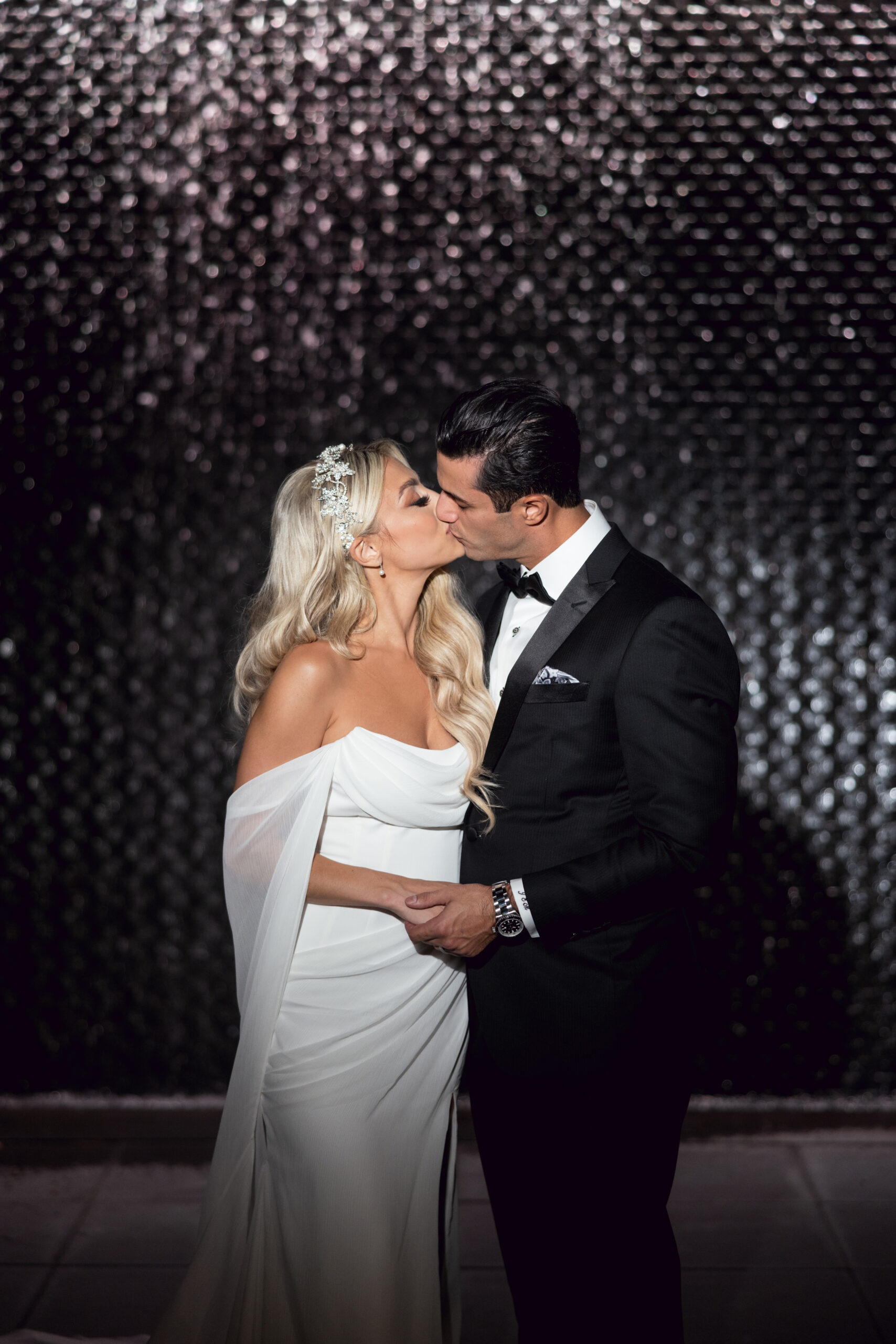 “My Martina Liana gown was the combination of romantic, sexy and classic bride,” says Alex. “The only thing I knew walking into the wedding dress store was that I wanted to glisten as I walked down the aisle. This gown was the one because there was simply no dress that compared. The light flowery detail with beads from top to bottom and long train offered the perfection combination of drama and elegance. It was me in a dress.”
