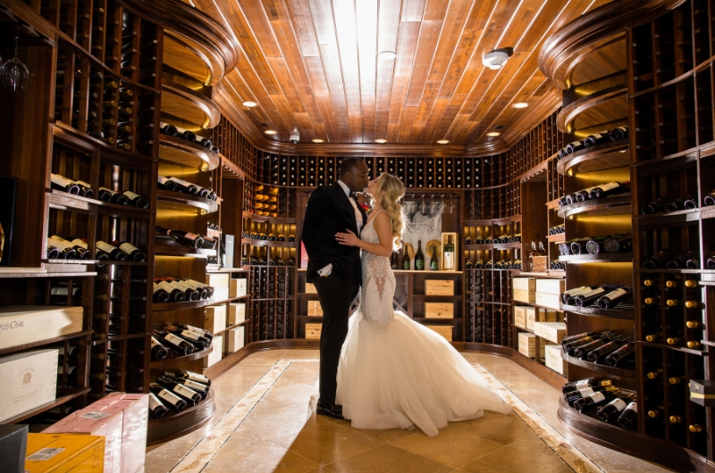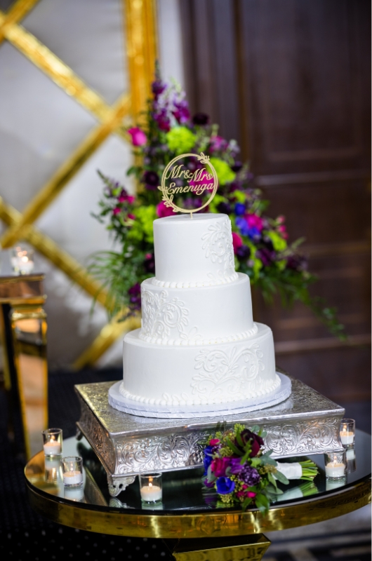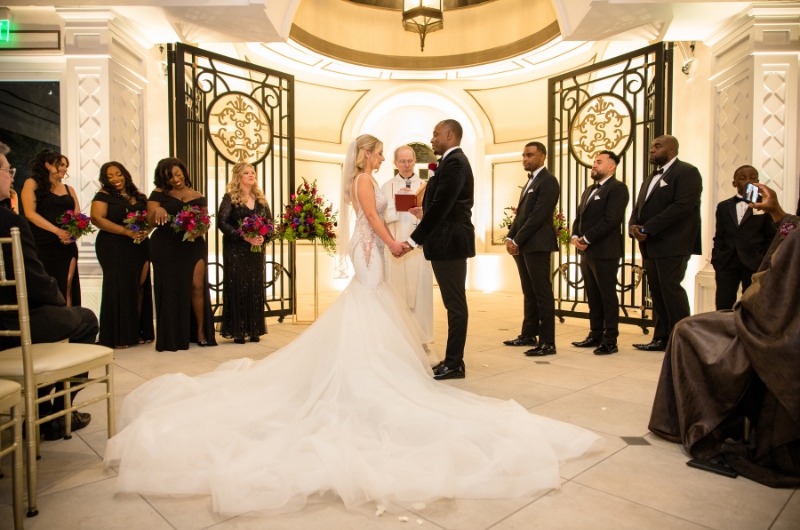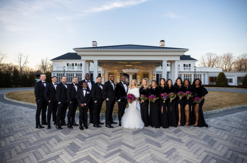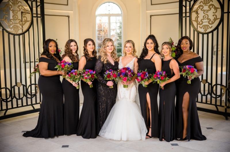 “The theme of our day was surprisingly dark and moody/Great Gatsby,” says Amy. “Our floral arrangements featured dark flowers such as the beautiful black baccara rose and the bluish-purple anemone with pops of pink from ranunculus. My bridesmaids wore black gowns from Azazie in stretch crepe material. My matron of honor wore a fully beaded black gown to stand out. All of the ladies also wore black fur shawls for some outdoor photos. The groomsmen were in classic black tuxedos while Udoka wore a black velvet tuxedo. Tablescapes were black table cloths with scrolling pattern detail, black and gold plates, and a gold napkin. Black and gold were the featured colors throughout the wedding to stick with the classic Great Gatsby theme.”