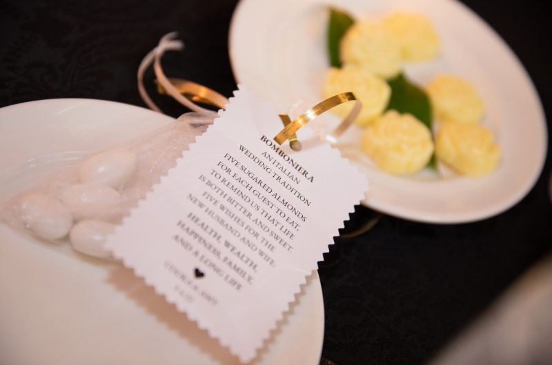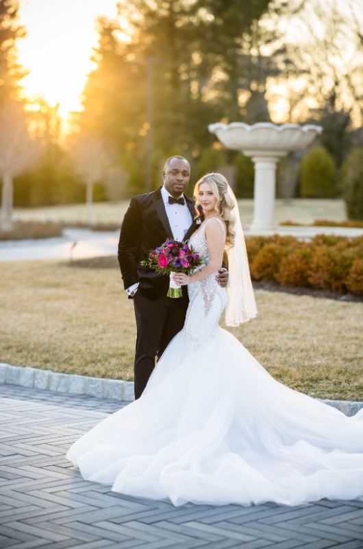 For their March 4, 2022 wedding, the cocktail hour included made to order hand-rolled sushi station, vodka, and caviar pairing station, an enormous antipasto selection, lobster rolls with bell mini beers, tacos with mini margaritas, lamb chops, carving stations, pasta station including lobster ravioli and mushroom risotto, fried rice, dumplings, egg rolls, sesame chicken, fresh oysters, raw bar, coconut shrimp and much more. “We also had a scallop over citrus risotto with a mixed greens appetizer and a lemon sorbet intermezzo,” says Amy. For the main course, there was a choice of Chilean sea bass (potato crusted, over risotto), signature pork chop (Jack Daniels glaze and potato medley), or Chateaubriand (chefs vegetables). “Our wedding cake was vanilla with lemon filling and chocolate with caramel filling,” says Amy. “We had an amazing after-party menu that consisted of fun finger foods and munchies like chicken and waffles, milkshakes with cookies, mozzarella sticks, French fries, cheeseburger sliders, zeppoles, hot donuts, gelato, chicken fingers, corn dogs, and much more.”