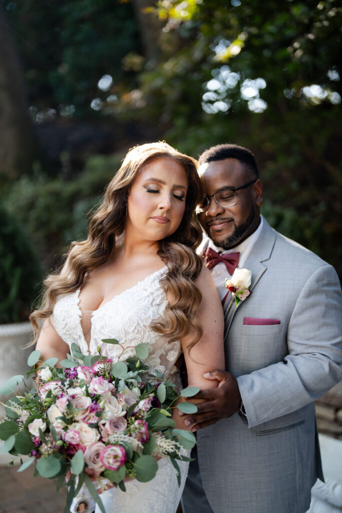 The colors were based on a dark dusty rose/chianti color. The flowers included faith and white roses along with eucalyptus, providing a soft, timeless look with a unique autumn twist.