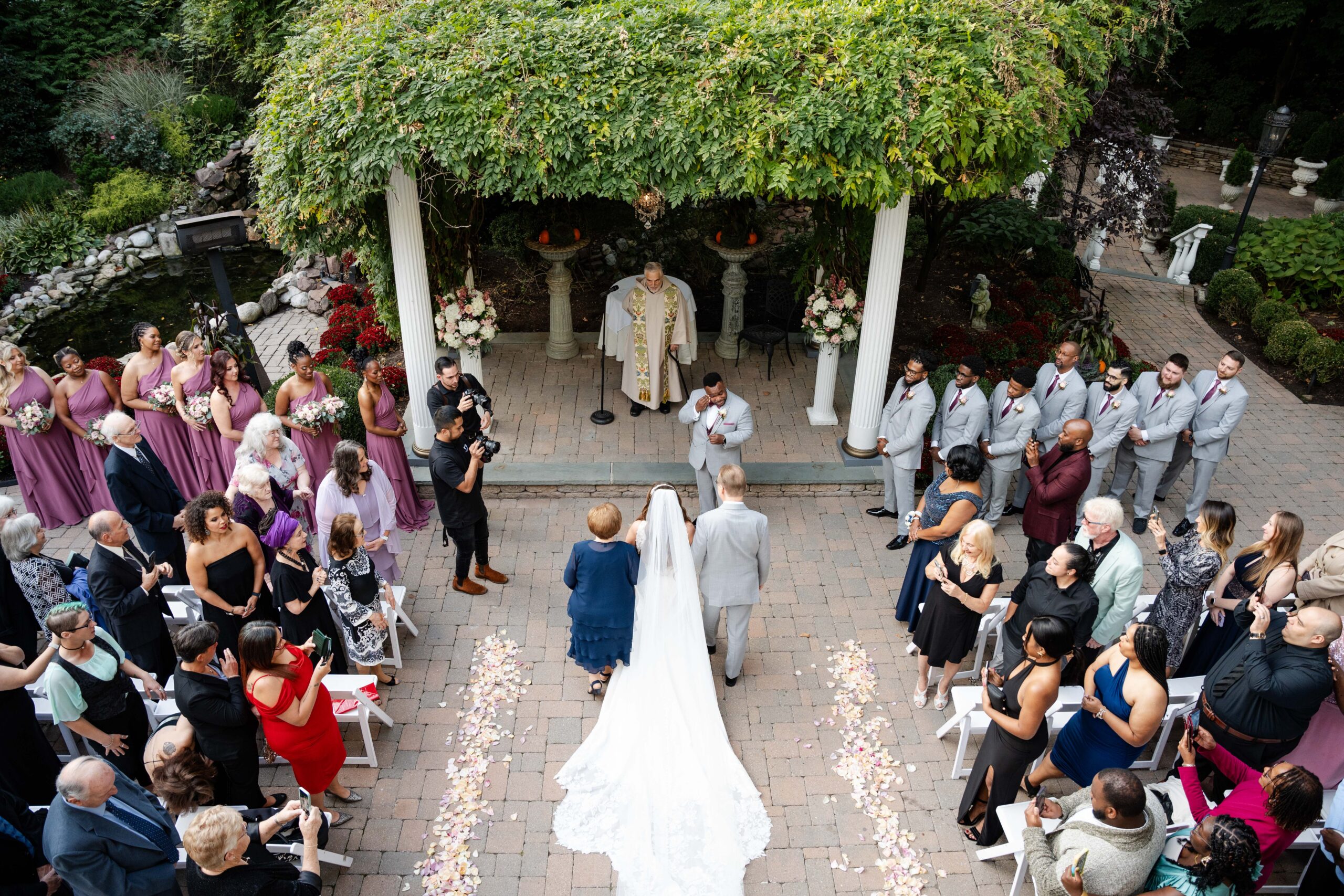 White, rose and beige rose petals adorned the aisle as they were married in the beautiful gardens at Nanina’s in the Park.