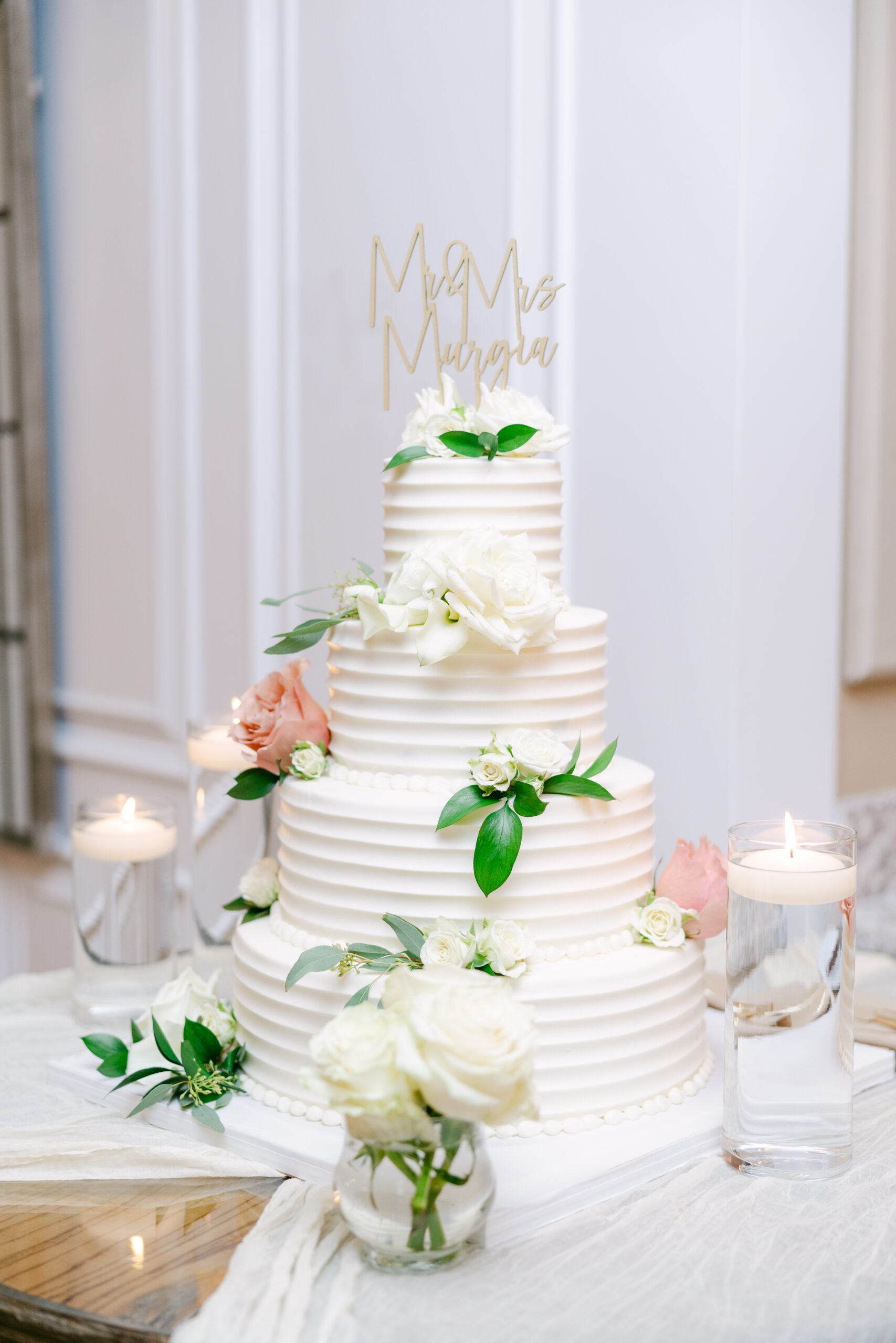 For flowers and decor, they stuck to ivory, taupe, greenery and lots of candles.