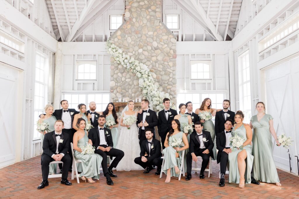 The bride wore the Nirvana gown from Galia Lahav’s couture collection from the NYC flagship. She also wore Manolo Blahnik Hangisi heels and her grandmother’s diamond earrings.The bridesmaids wore various styles of sage gowns from Billy J.