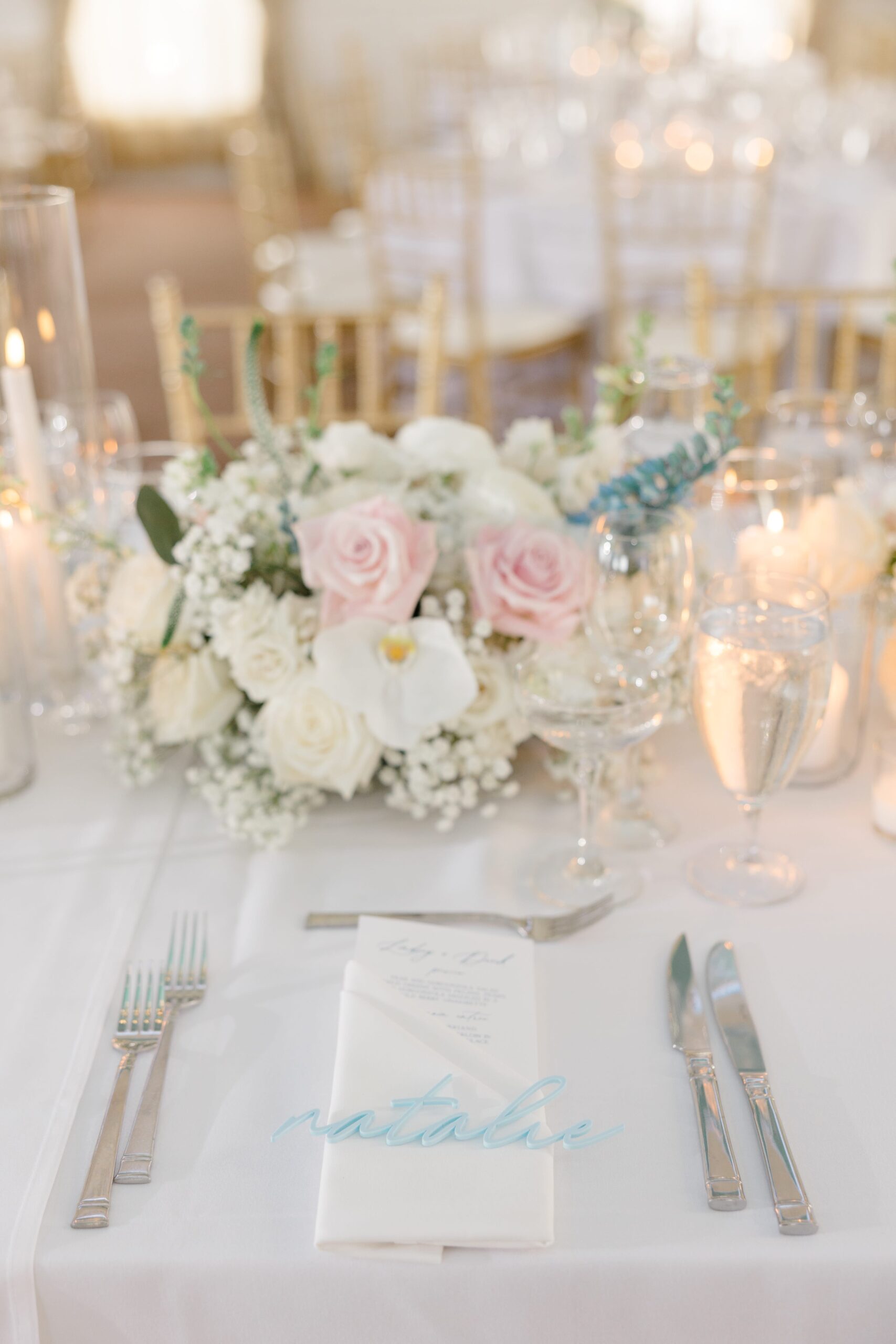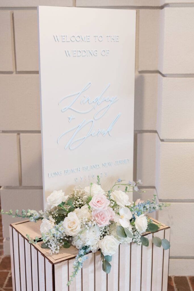 Their signage tied in sage and dusty blue with laser cut name cards for the head table. They had personalized drink stirrers, cocktail napkins and acrylic cocktail place cards.
