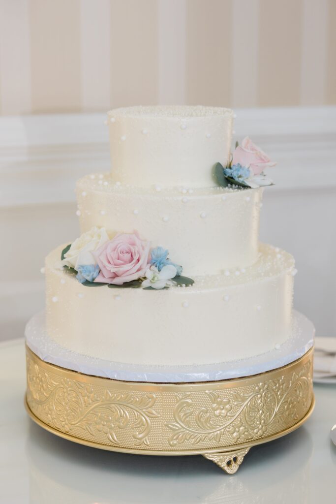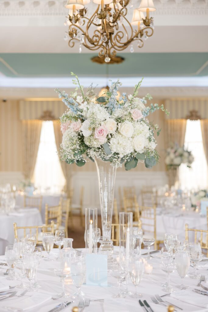 Their color scheme was sage, dusty blue, white, cream and gold accents. Lindsey wanted the climbing fireplace piece in the chapel to be a centerpiece of their photos so she opted for white florals with blue and pink accents.