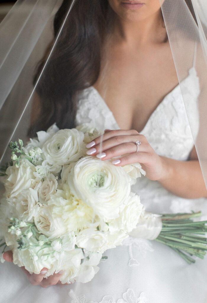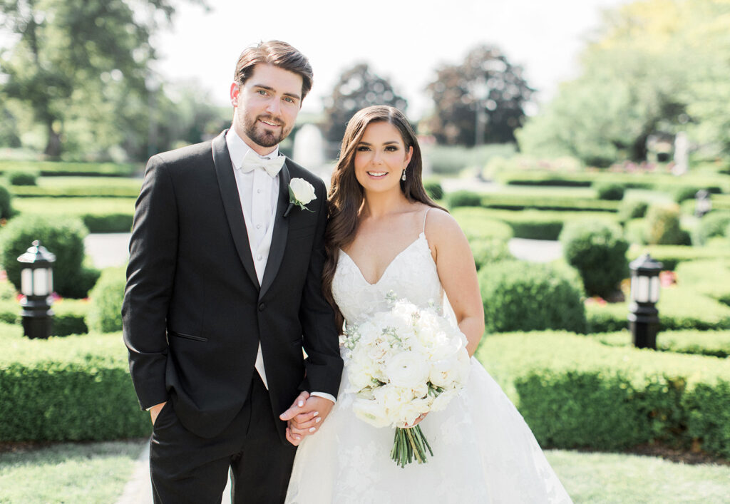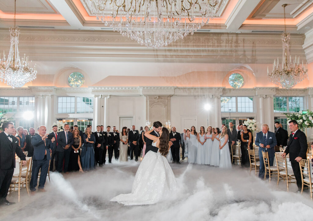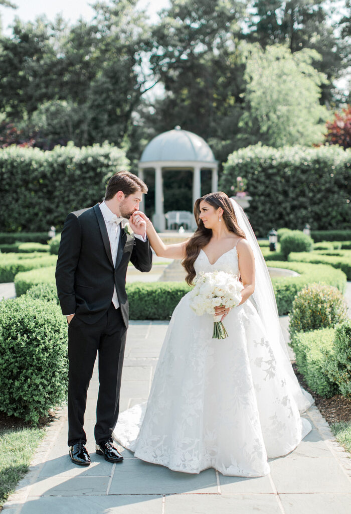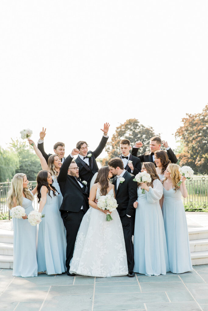 “Our wedding day, June 2, 2023, was the most magical day of our lives,” says Geena. “The overall vision I had for the day was extremely romantic. Candles everywhere, warm lighting in the ballroom, white and blush florals, rose petals and beautiful ivy cascading from our centerpieces. My bouquet was so beautifully made and included the most plush peonies I had ever seen, white ranunculus, and roses. As for our bridal party, I wanted them in Jenny Yoo dresses in the shade Whisper Blue. It was such a perfect spring wedding shade, and they absolutely glowed outside in the gardens and during the reception! Our groomsmen looked incredible in their black tuxedos from Biltmore tuxedos in Ridgewood. Our guests entered the ceremony to a violinist, which I always knew was a huge detail I wanted to have for our ceremony. It added such a romantic feel to that moment. At the end of our wedding, we had French fry bar set up for our guests to grab a late night snack! It was such hit, and people are still talking about the sweet potato fries!”