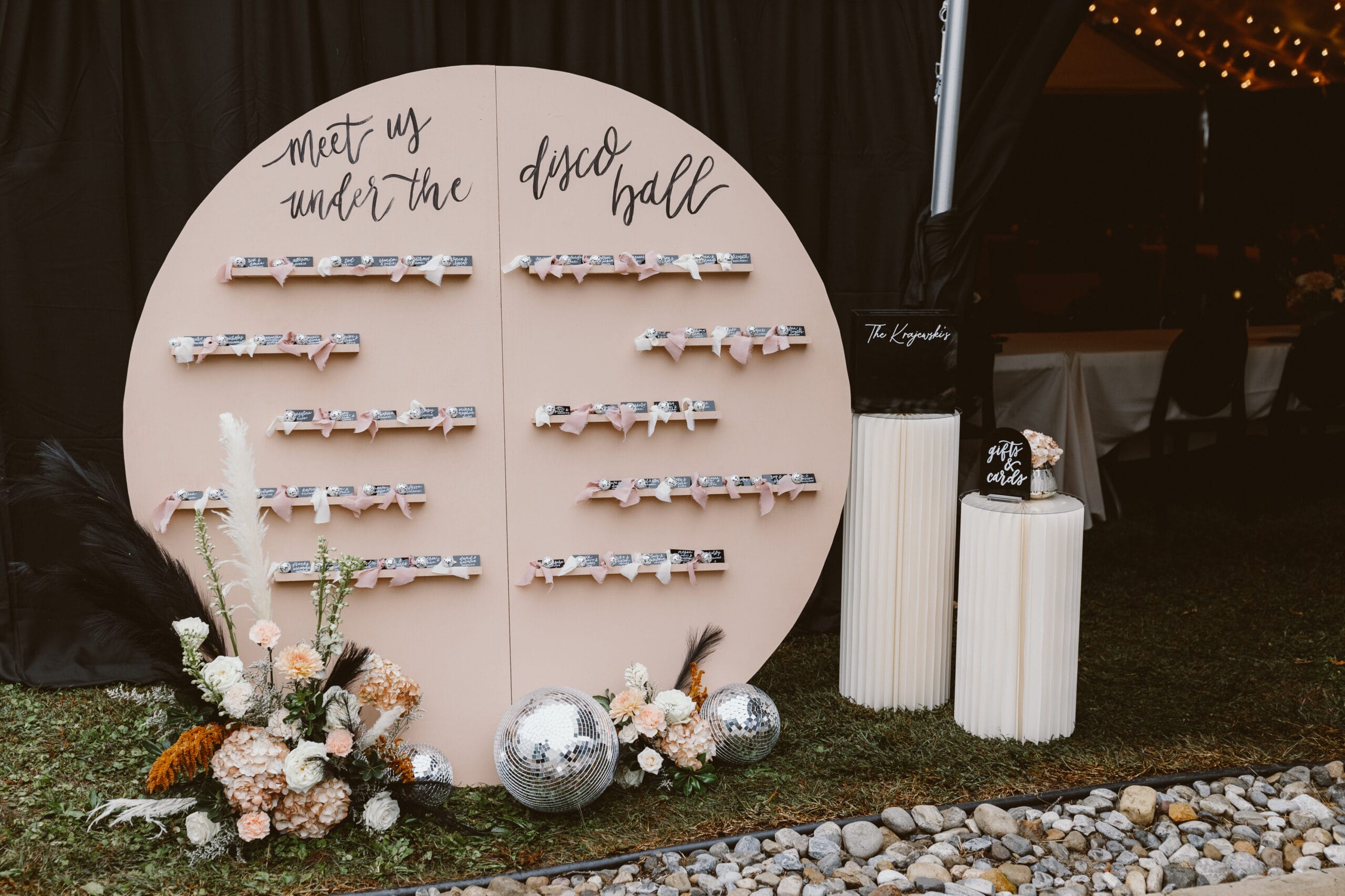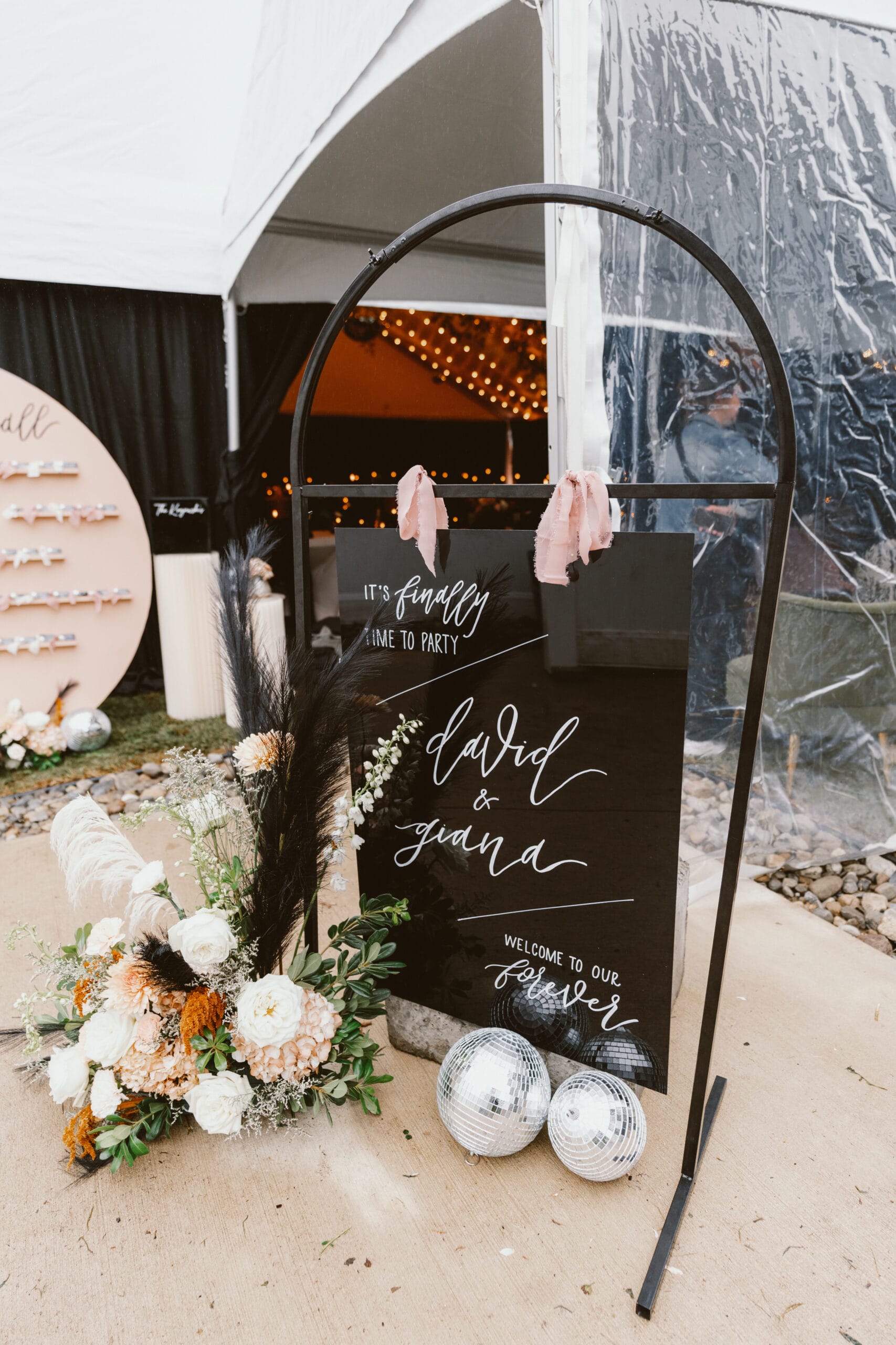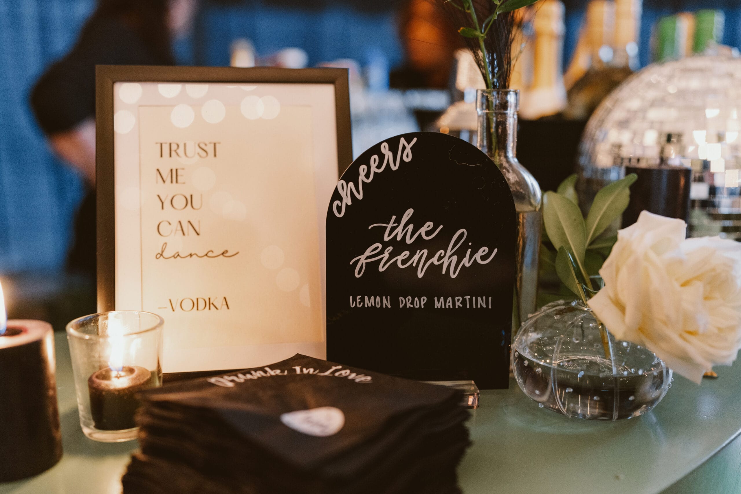 “The disco balls were really one detail that made our whole vision come together,” says Giana, “as well as the menus for the place settings, little signage everywhere, custom beverage napkins, the champagne gun and hundreds of lit black candles.”