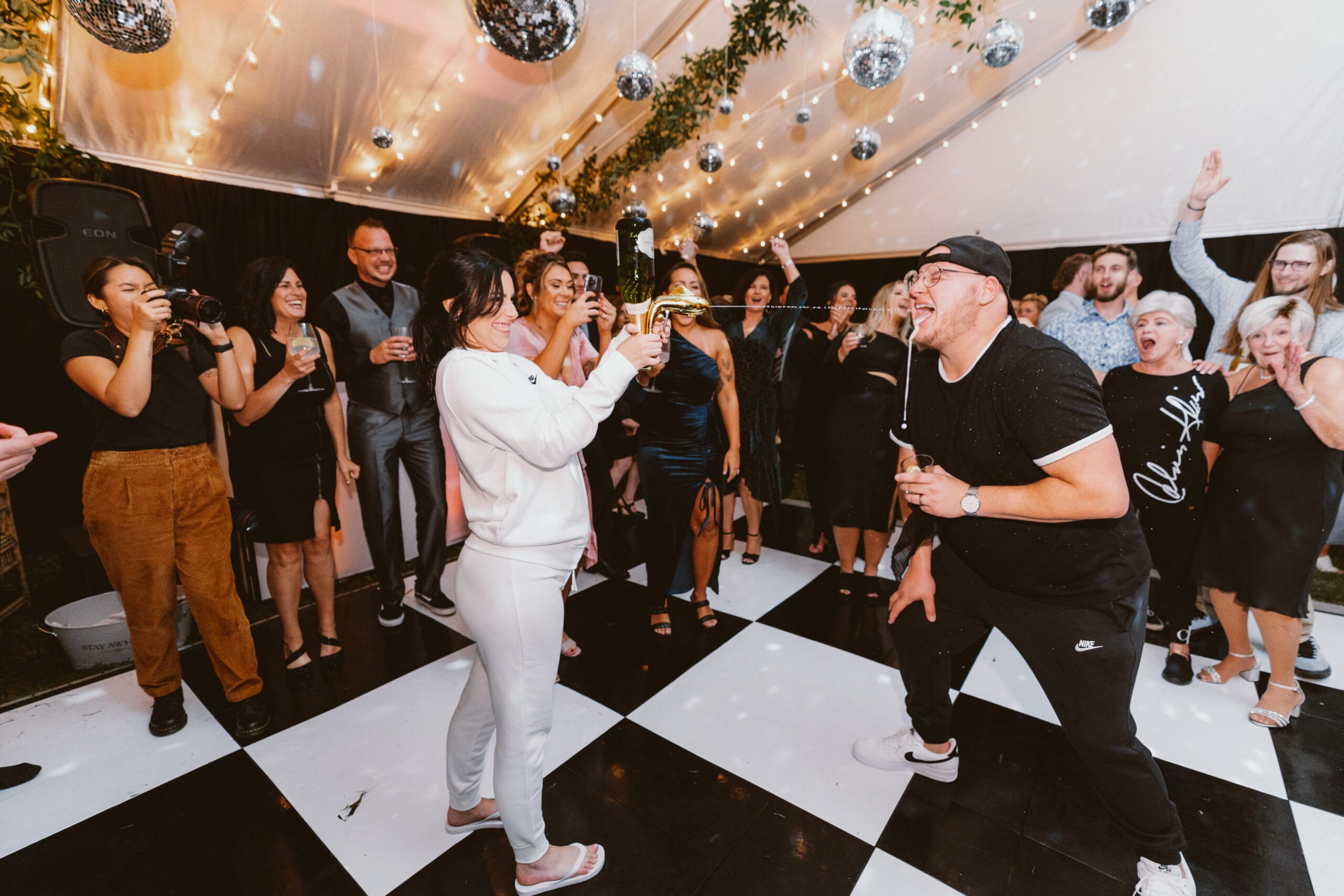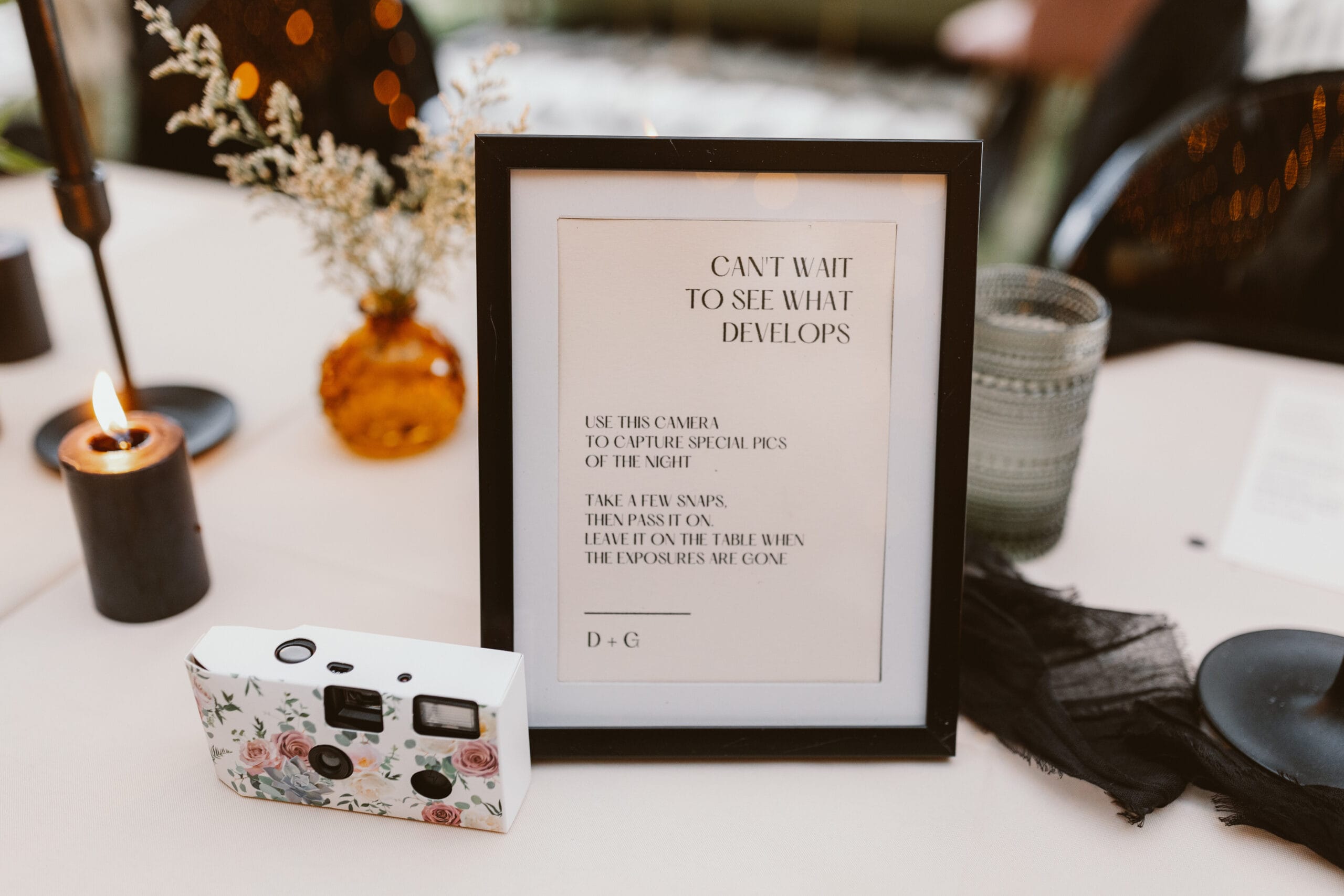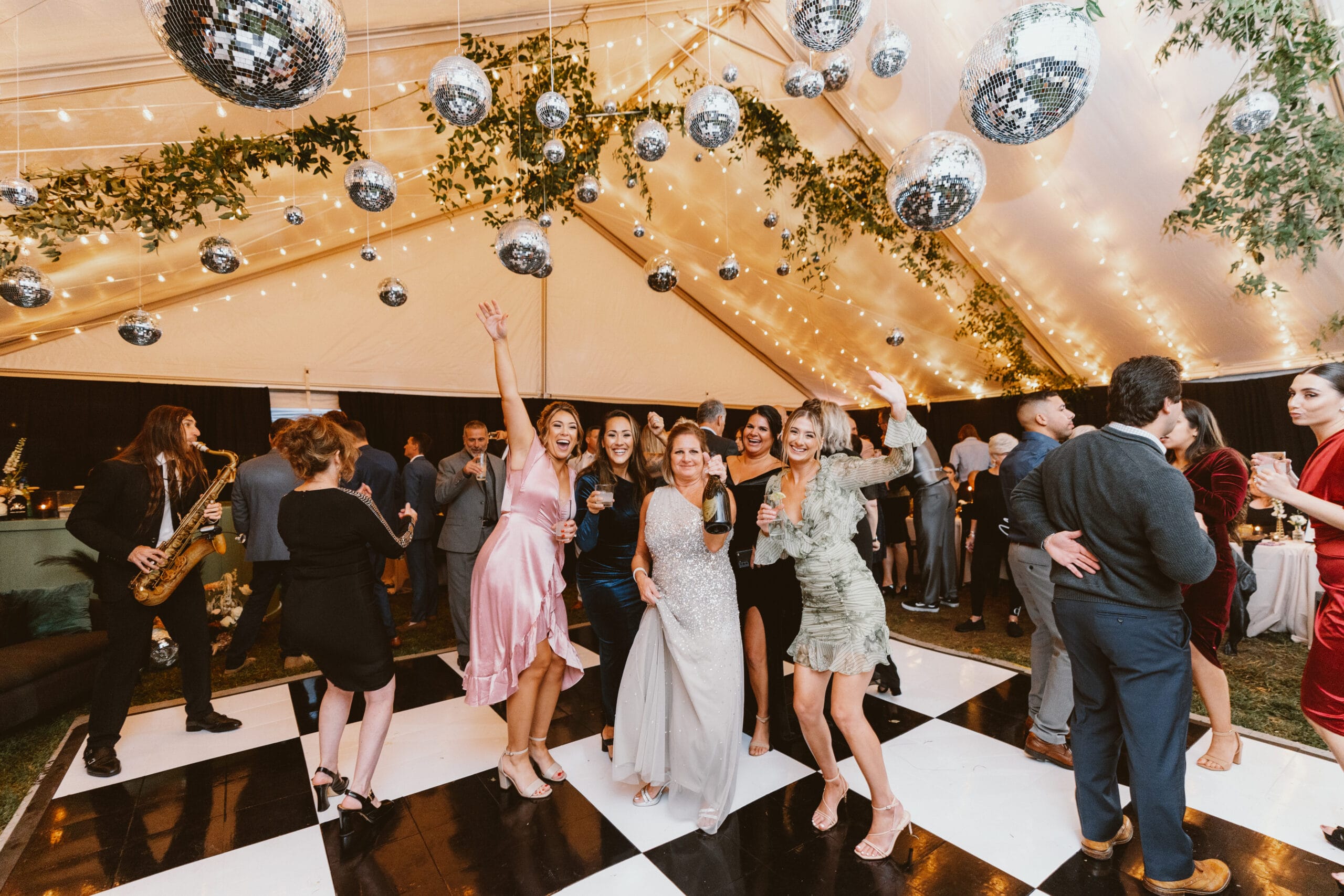 “The disco balls were really one detail that made our whole vision come together,” says Giana, “as well as the menus for the place settings, little signage everywhere, custom beverage napkins, the champagne gun and hundreds of lit black candles.”
