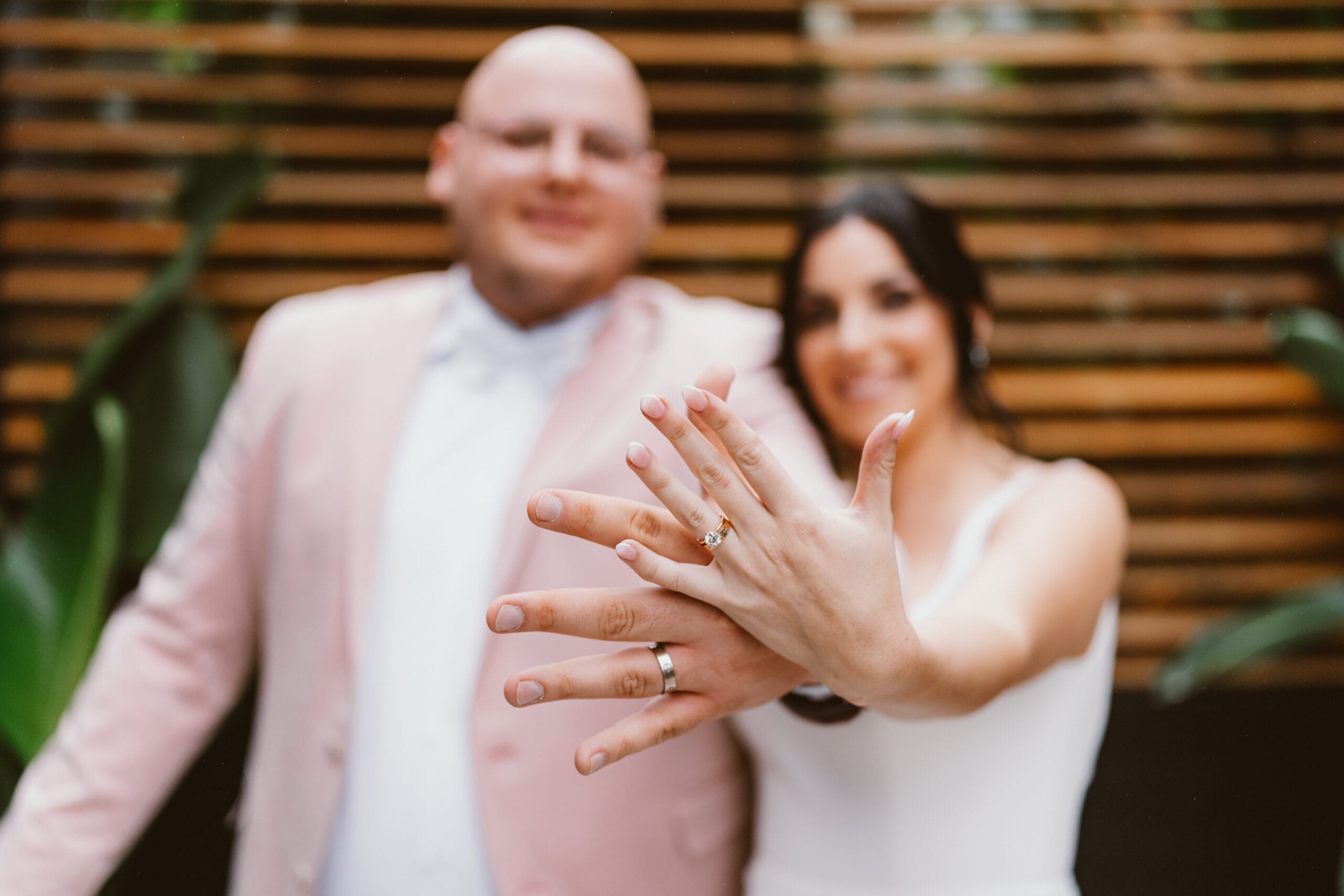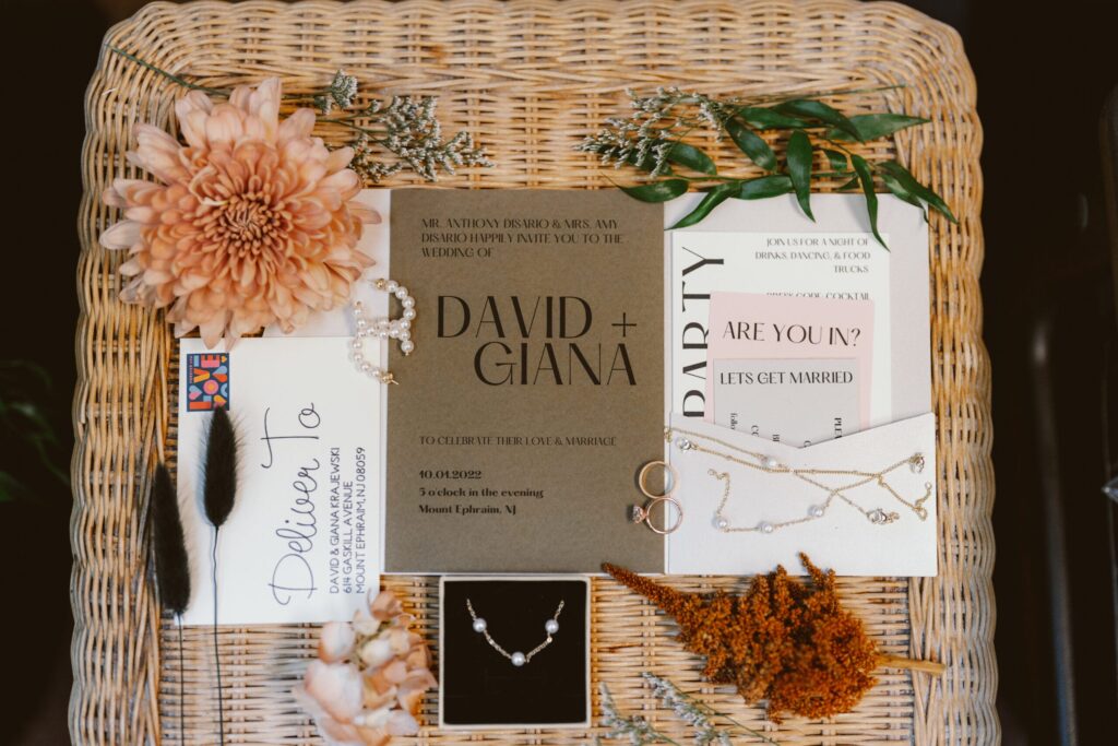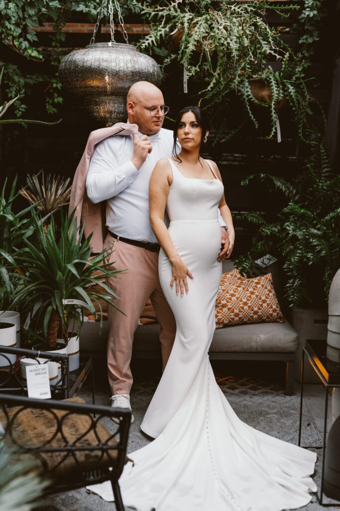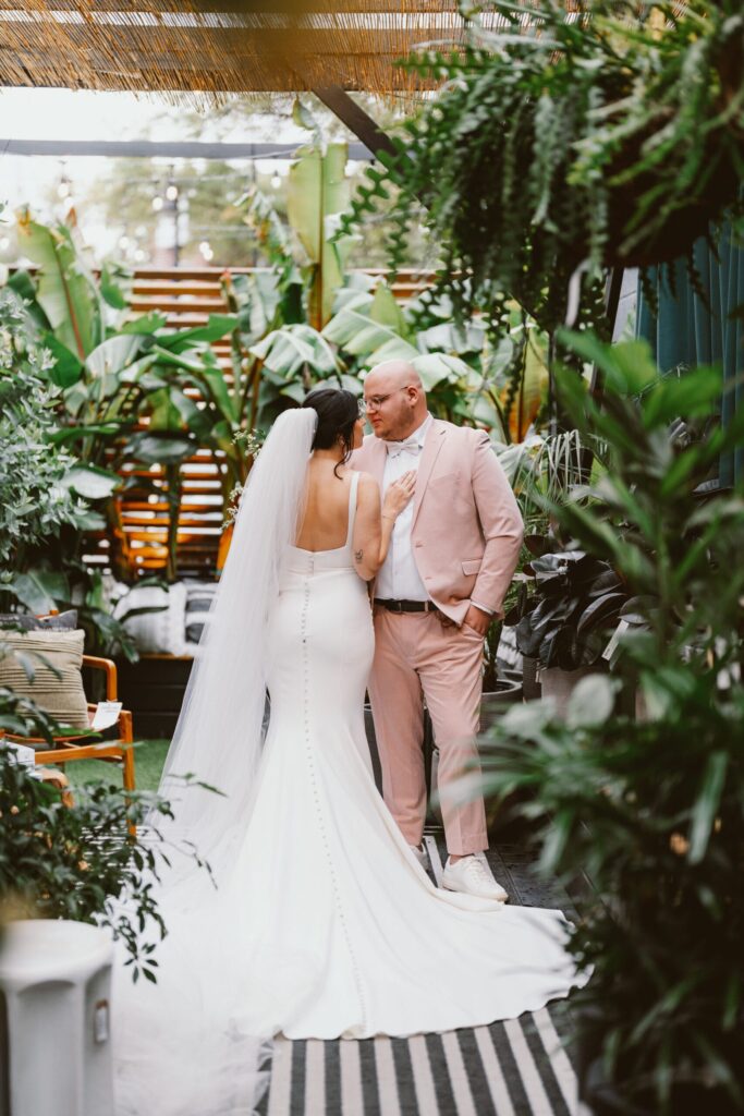 Giana and David wanted a wedding that was “everything but ordinary,” says the bride. The couple had their ceremony at Bespoke Home + Life in Collingswood, a plant and decor shop, before their tented backyard reception. They opted for food truck bites and fun disco ball decor to complete their unconventional NJ wedding vision.