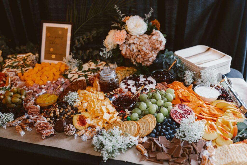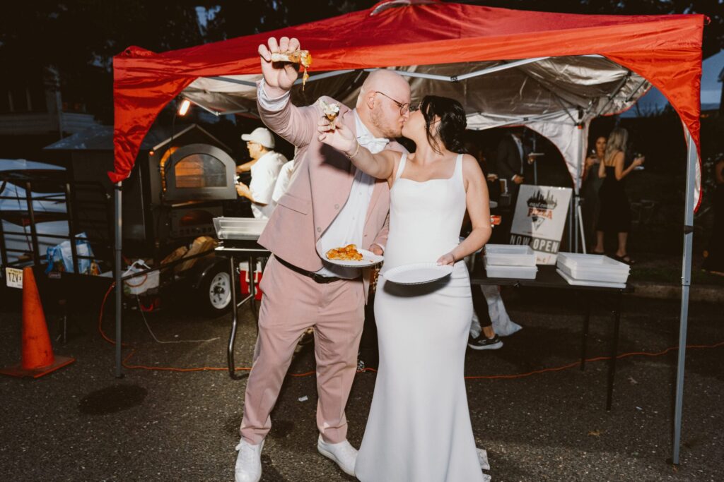 “We decided that we didn’t want it catered like a normal wedding,” says Giana, “so we rented three different food trucks. We had Fork in the Road supply all of our passed cocktail-hour items (seared scallops, classic grilled cheese with tomato soup, cheesesteak sliders, fried chicken slider and a chipotle skirt steak taco). Fork in the Road then made sandwiches for the dinner portion (French onion grilled cheese, crab cake sandwich, pulled pork sandwich with apple slaw, truffle fries and Brussel sprouts). We also has East Coast Pizza provide our guests with personal pizzas (create your own, Margherita pizza, white spinach, buffalo chicken and BBQ chicken). We also had a six-foot long charcuterie table made by A Little Cheesy Board. For dessert, we had Lexylicious provide everyone with homemade ice-cream cookie sandwiches. We knew we wanted our wedding to be more relaxed than other weddings and we wanted to make sure our guests had plenty of options. Our cake was a blueberry velvet cake from Sweet T’s bakery in Haddonfield.”