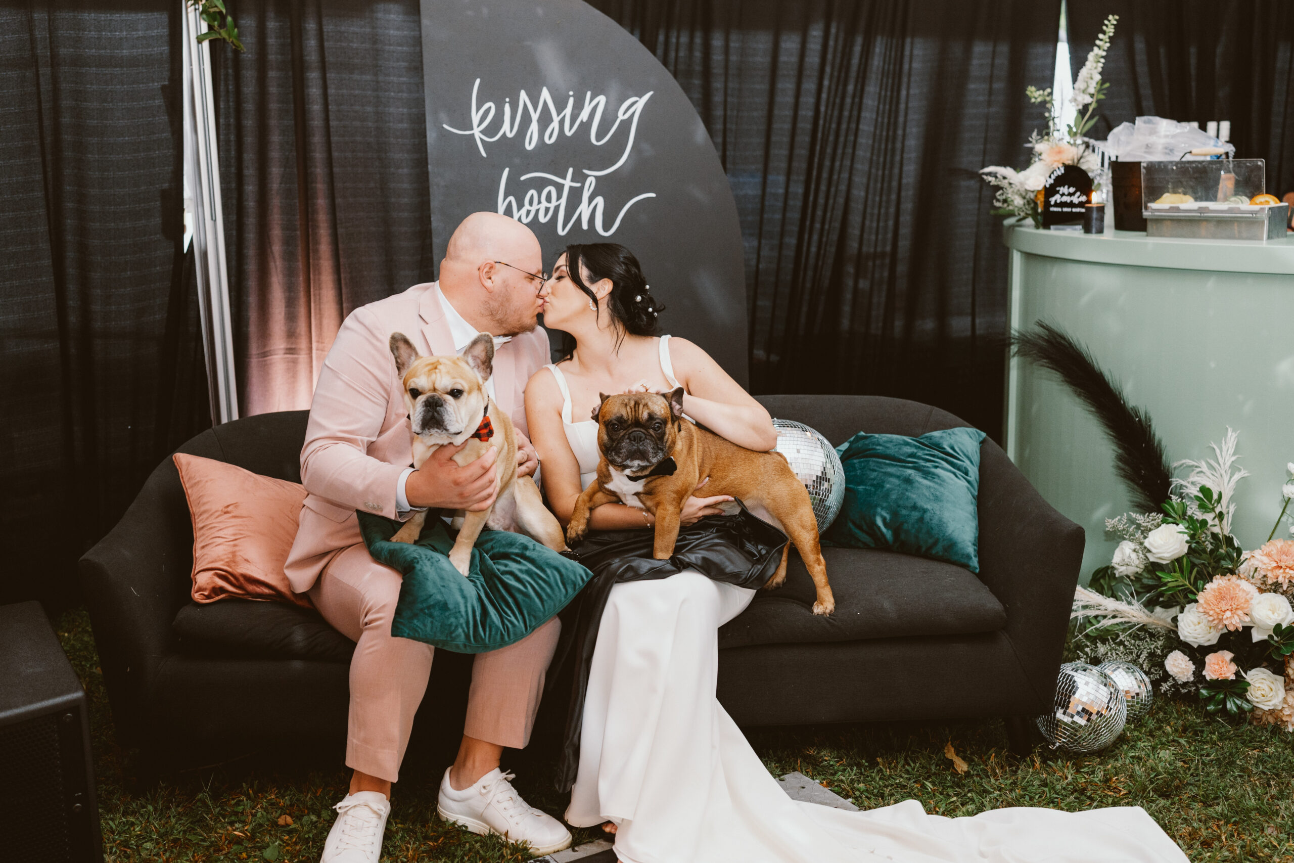 For their October 1, 2022, big day, “our wedding was everything but ordinary,” says Giana. “We wanted to make sure that we did everything nontraditional. We wanted a moody/retro feel. We had our planner incorporate lots of velvet furniture and dark colors. We had all black candles lined on all of the tables along with single bud flower centerpieces. We had the whole tent wrapped in black curtains to give it an intimate feel. I think we had a total of 100 disco balls. We had a custom round bar painted in a green color to fit our mood of the wedding.”
