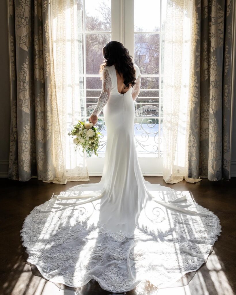 Julia thought she wanted sparkle and lace, but when she put on the Pronovias Luna gown, she just knew. “It was simple, elegant and felt like me,” she says.