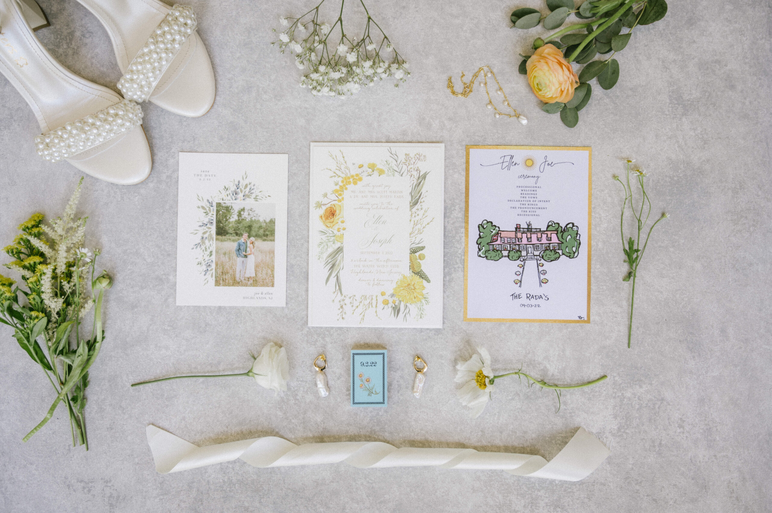 Their wedding planner Jennifer Tolento made the wedding planning process easy. At the Water Witch, you have to bring in all of your own vendors. “So picking who I wanted was a lot of work,” says Ellen. “Jennifer pulled it all together and it was incredible to see how the vendors all worked so seamlessly on the day. Planning the flowers with Flowerful Events was really fun because what girl doesn’t love flowers! She truly saw my whimsical and delicate wildflower vision and seeing her make it come to life was amazing.”