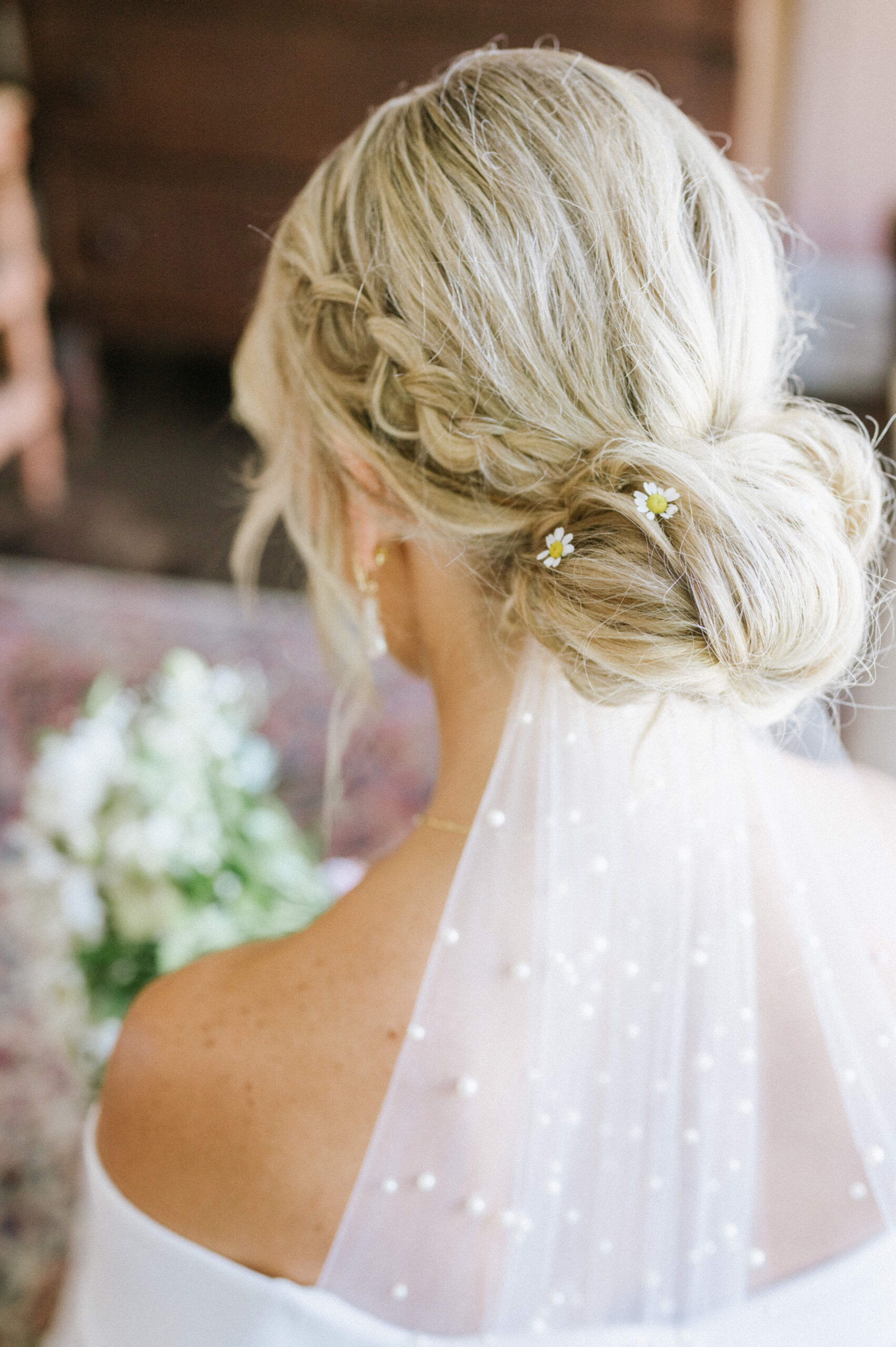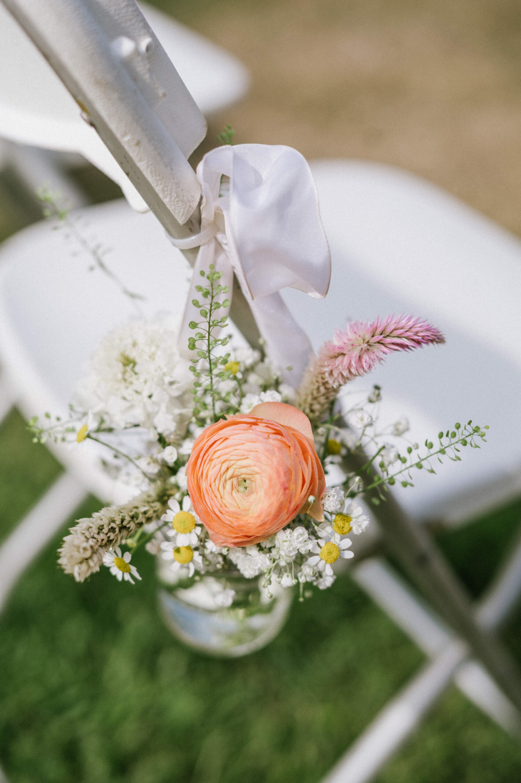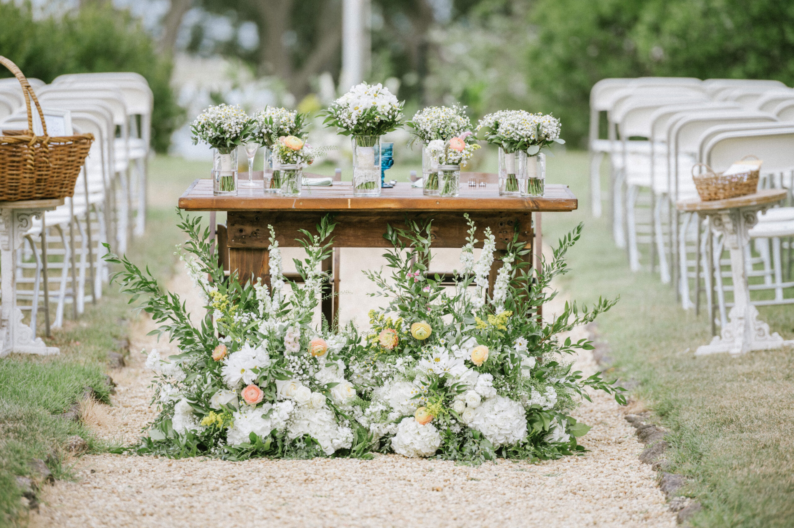 “I wanted a bohemian feel to my wedding, but still with a level of chicness. I love an eclectic look, so the various colored goblet glasses were perfect. The yellow sun, green trees, blue ocean, and brown Water Witch club colors that were the backdrop and feel of our wedding, inspired my color palette,” says Ellen. They both love nature, and Ellen loves butterflies, so she wanted to add wildlife in some way. “I have always dreamed of a wedding with wildflowers, and even wearing some in my hair,” says Ellen. “I love the delicate look of chamomile flowers. I felt like a bohemian princess with them perfectly places around my braid and bun.” She adds, “It was important for me to have field flowers that were native and in season. It was amazing because a swallowtail butterfly was blessing the day and flying from flower to flower as our florist was setting up, and even as I was walking down the aisle. My butterfly and wildflower dreams came true. Butterflies wouldn’t be attracted to my flowers if they weren’t native to our area!”