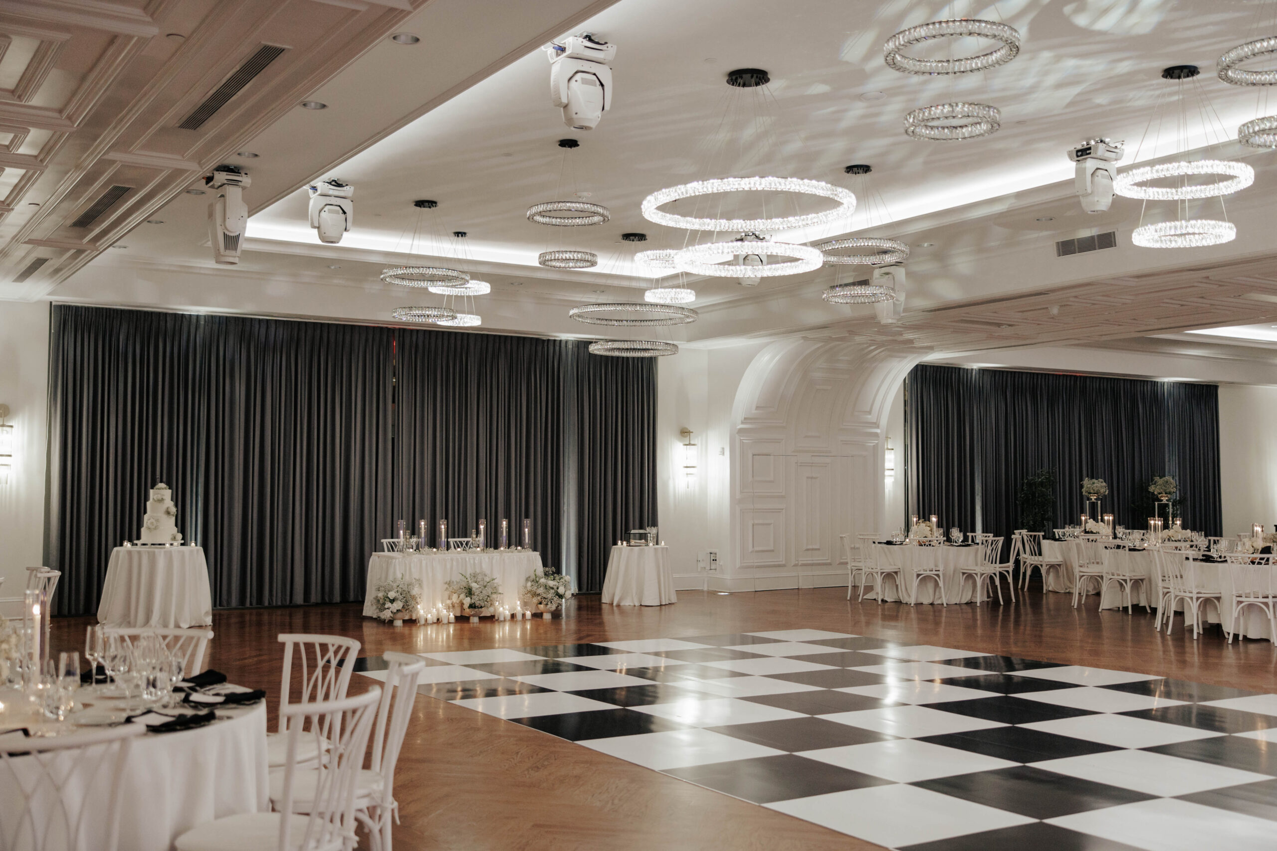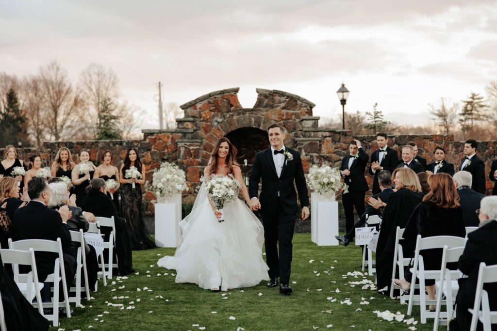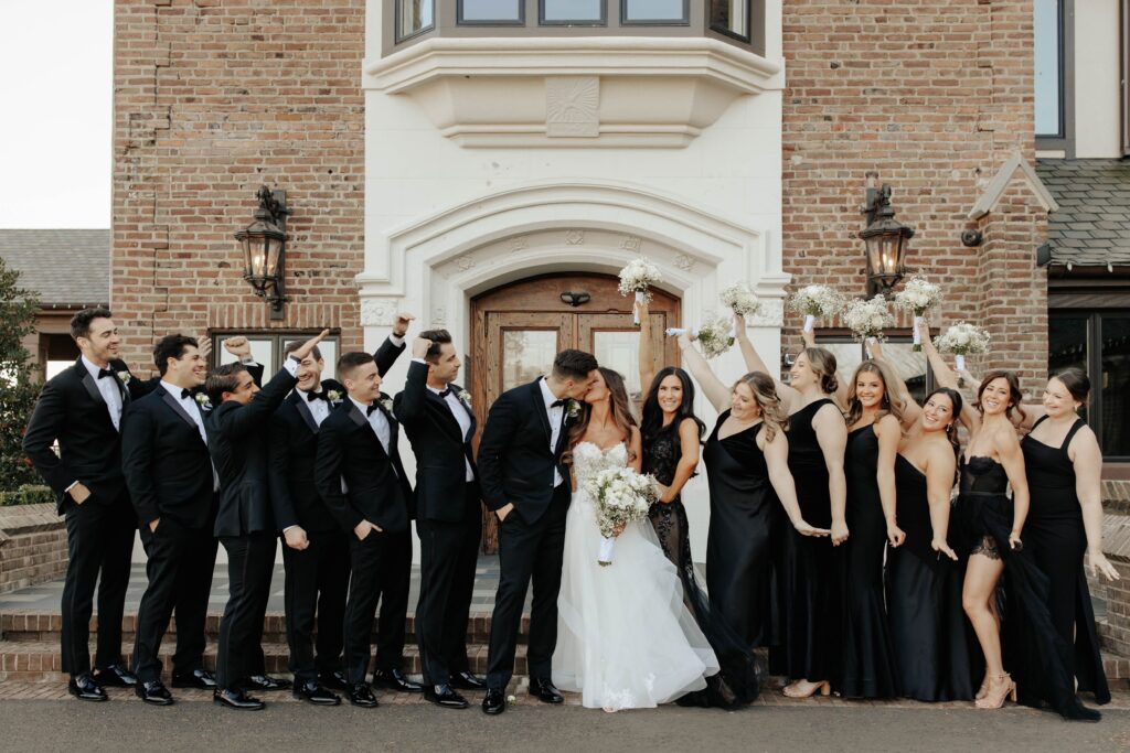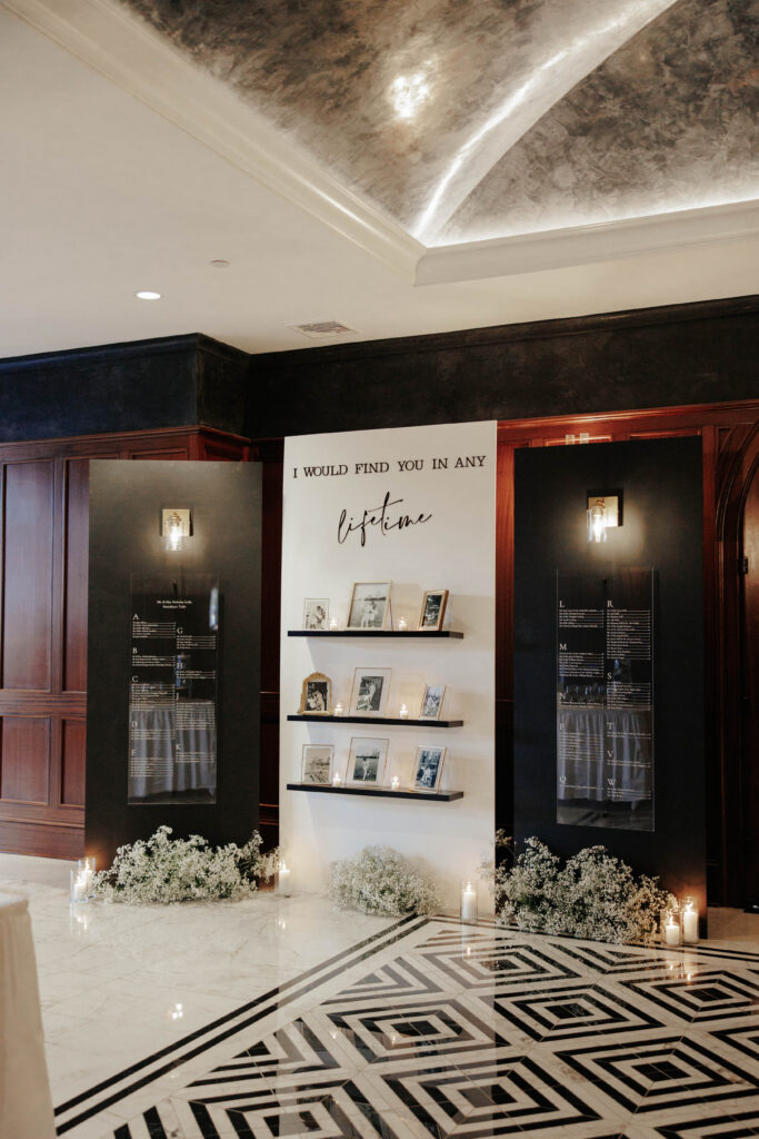 “We wanted to create an elegant and romantic atmosphere, so we decided to have both our bridal party and guests dressed in black,” says Lauren. “It perfectly complemented our black-and-white theme and added to the sophisticated vibe we envisioned for the celebration.”