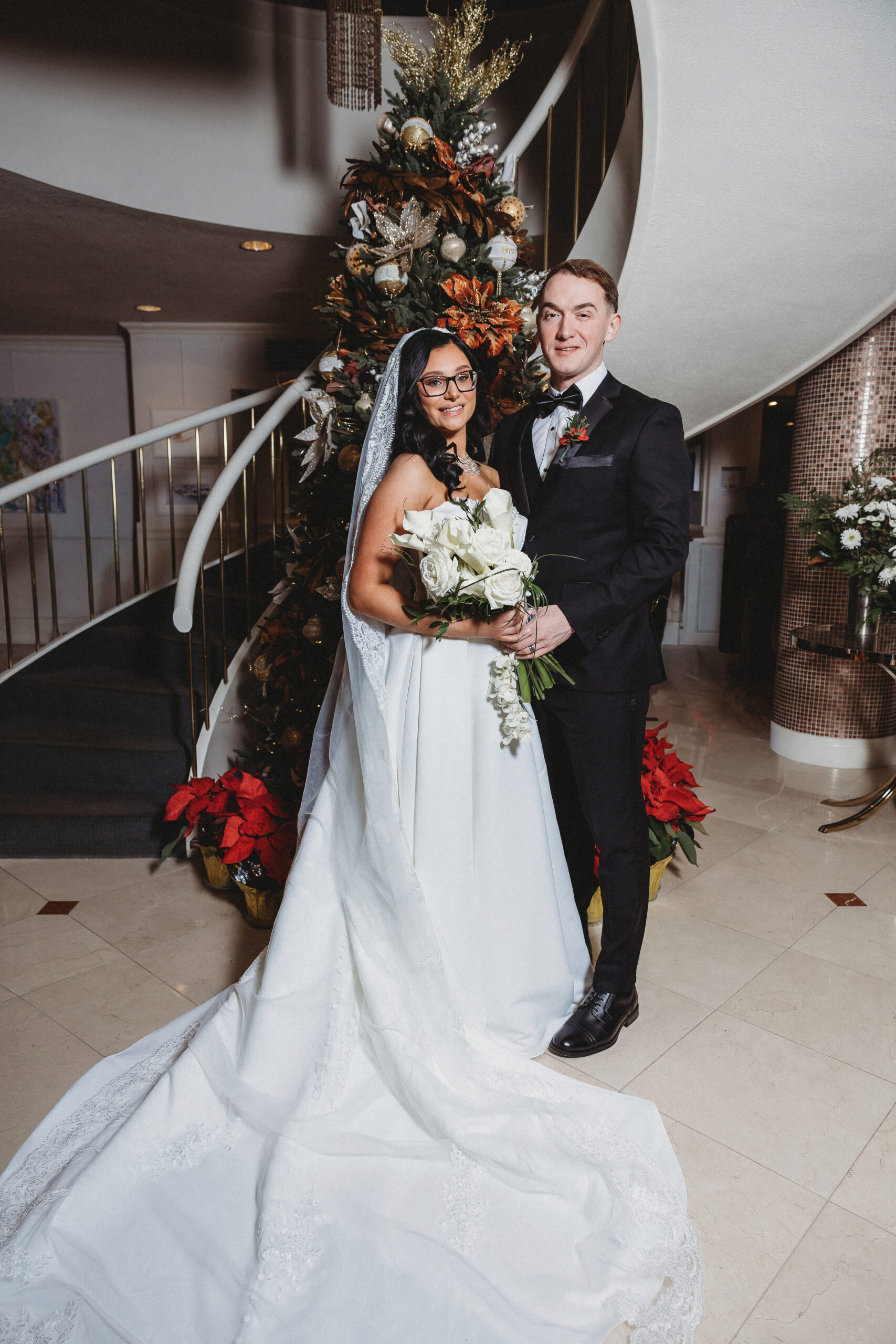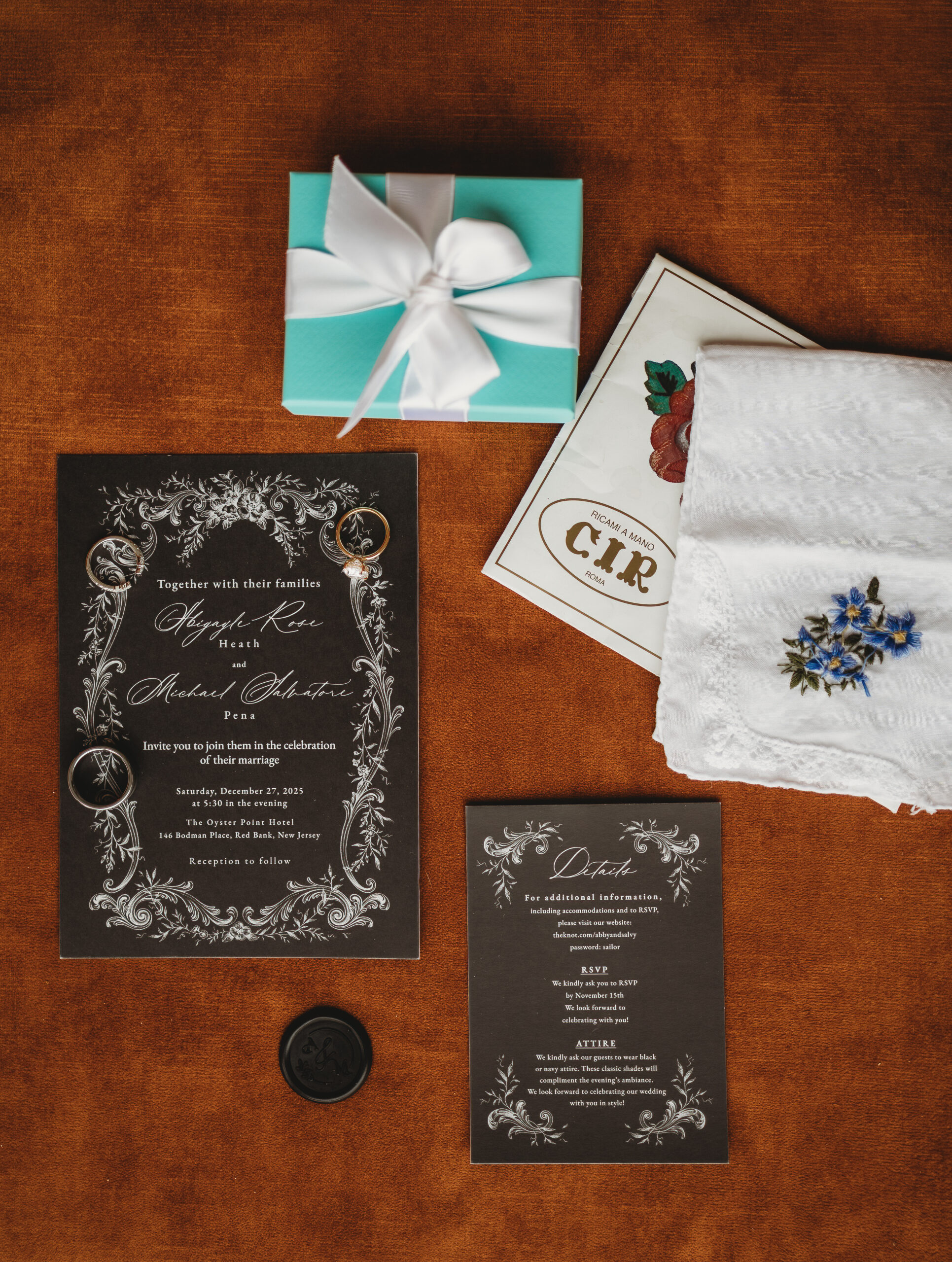 Abigayle and Michael’s love story is not your typical one. They met at a bar, then spent four years apart—connected by letters and longing while Michael served in the Navy as a combat medic—before finally closing the gap for good. For their December 27, 2025 wedding, they chose The Oyster Point Hotel in Red Bank, New Jersey, drawn to its sweeping 360-degree water views and newly renovated ballroom. The day was elegant and deeply personal: a black, white, and gold palette, white roses and eucalyptus, groomsmen in their navy dress blues, and a private vow exchange before the ceremony that gave the couple a quiet moment together before the celebration began. In lieu of favors, the couple made a donation to the Wounded Warriors Foundation—a fitting tribute to the journey that brought them here. Arlene Romero Photography captured their big day.