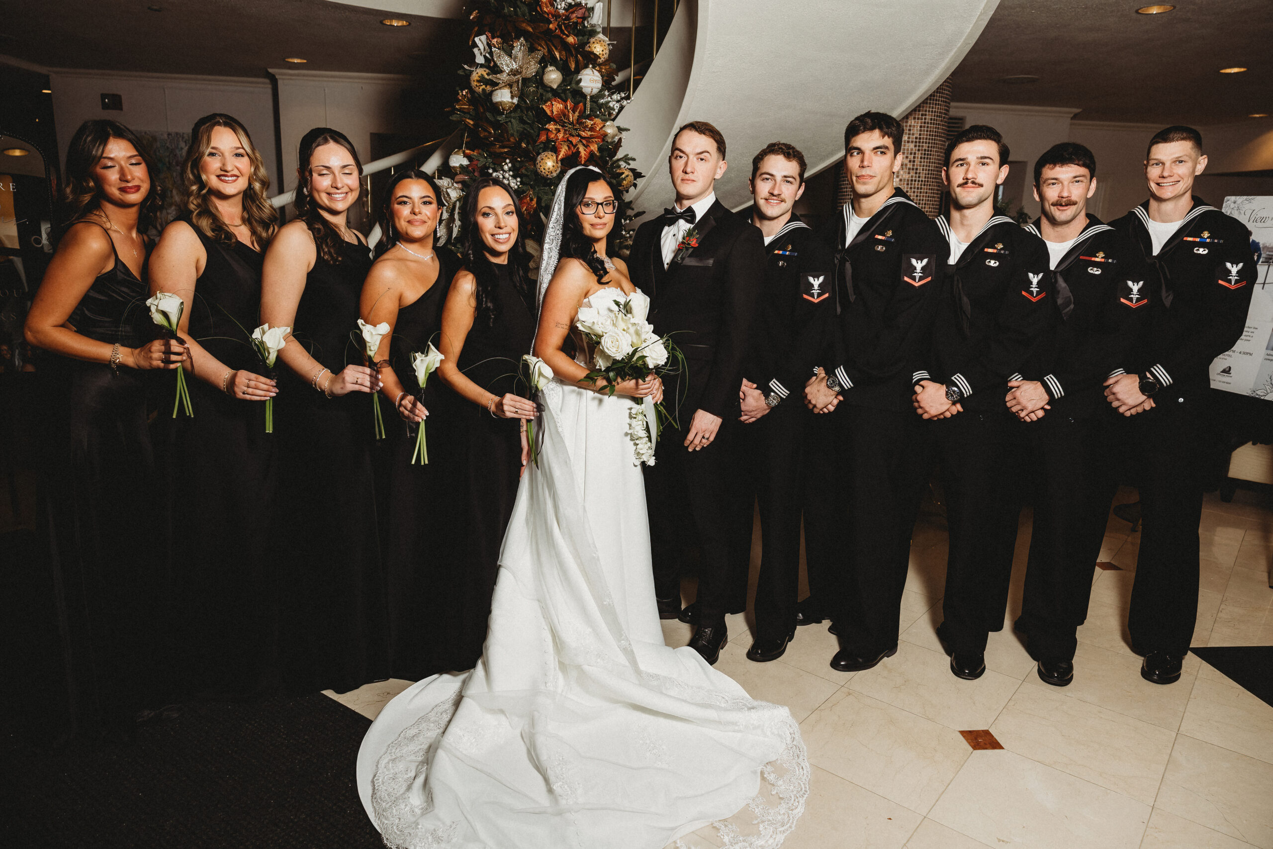 “All guest were requested to wear black or navy. The bridesmaids were all in black dresses of their choosing. The groomsmen were in their navy dress blues.”