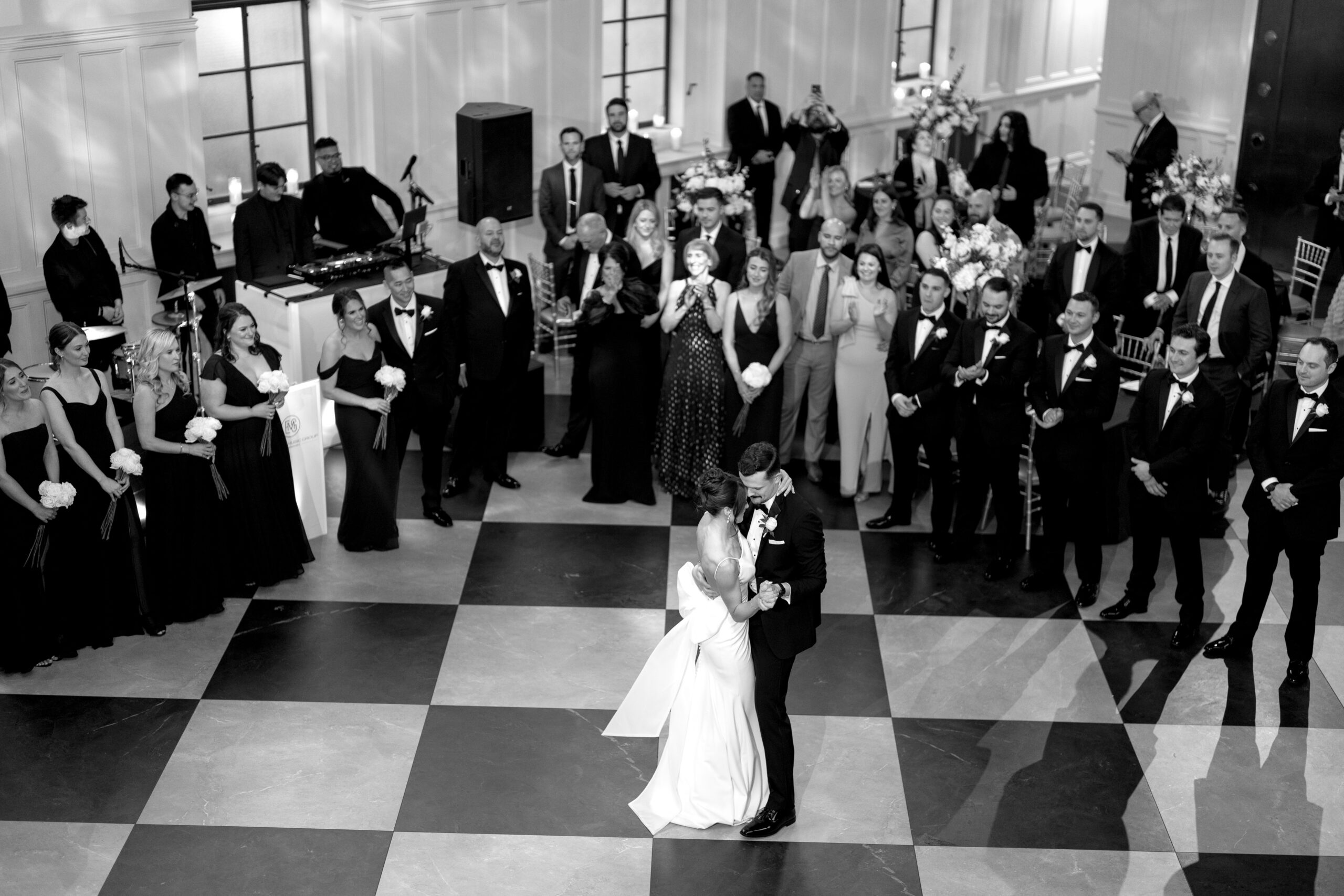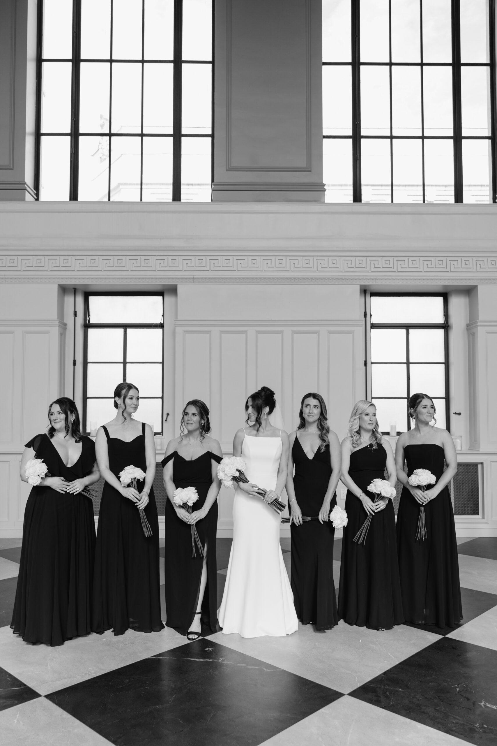 “Our celebration stayed true to a simple and timeless black-and-white theme,” says Julie. “The bridesmaids wore black Jenny Yoo gowns, while the men looked sharp in classic tuxedos.”