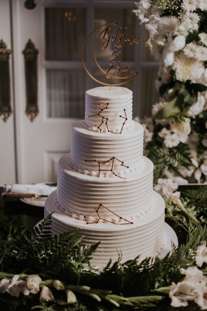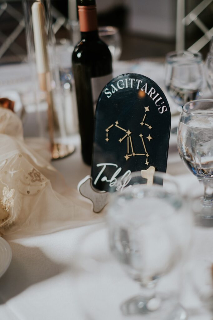 Gillian’s passion for astrology sparked the couple’s celestial-themed wedding at Addison Park, which featured a moon arch, newspaper-format programs titled The Celestial Times, and navy and gold accents to fit the mood. Another special detail was their “getaway car” photo shoot, which featured some of their favorite photos. The classic car that Gillian’s dad restored was a white 1975 Buick Riviera convertible with a red interior.