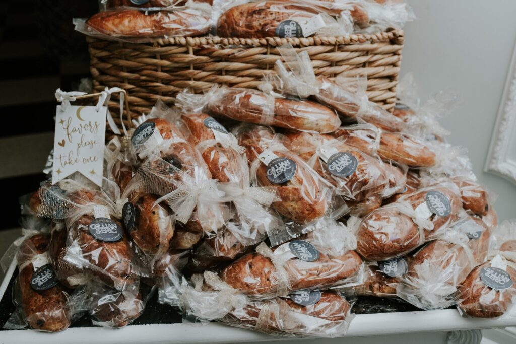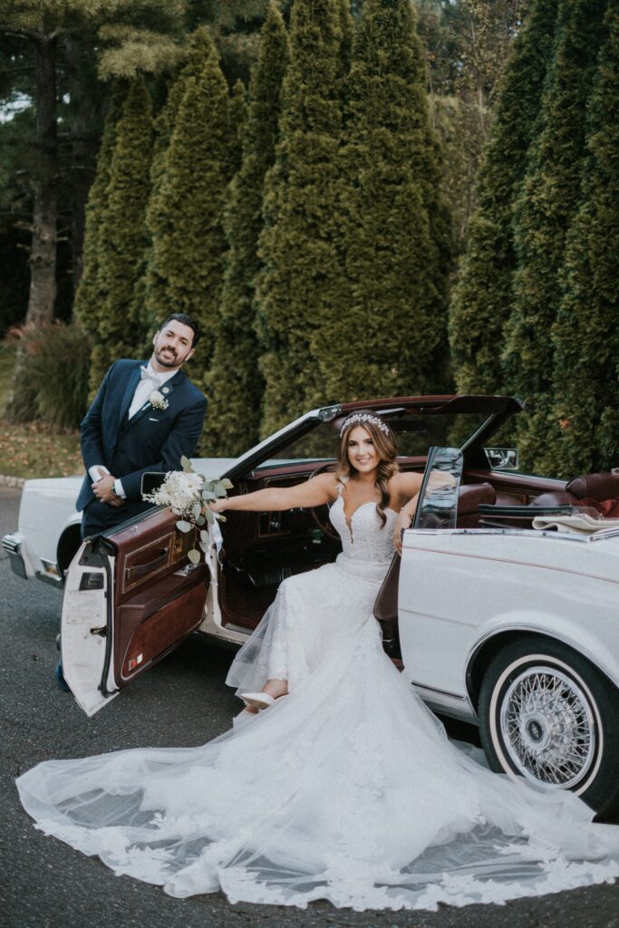 “My absolute favorite part of our wedding was our personalized vows,” says Gillian. “They truly were heartfelt, and so many of our guests told us they could feel our love radiating from the words we spoke to each other.” The couple plans to create an art piece with those sentimental vows. Another keepsake is their “getaway car” photo shoot, which featured some of their favorite photos. The classic car that Gillian’s dad restored was a white 1975 Buick Riviera convertible with a red interior.