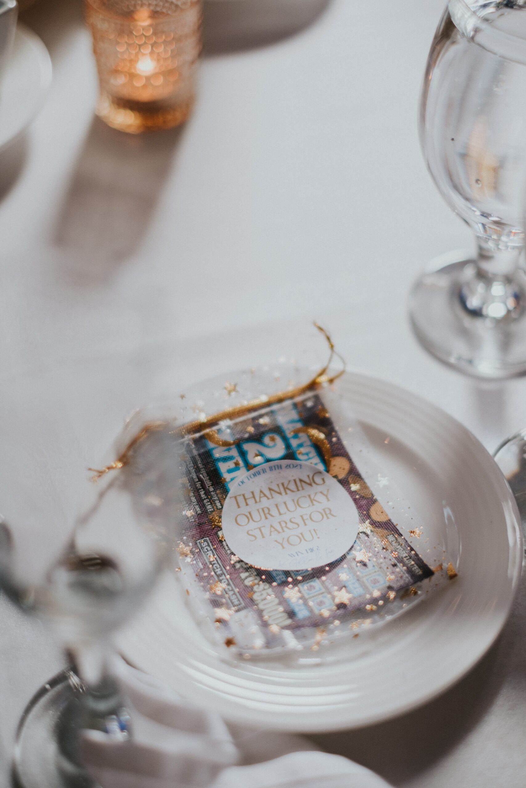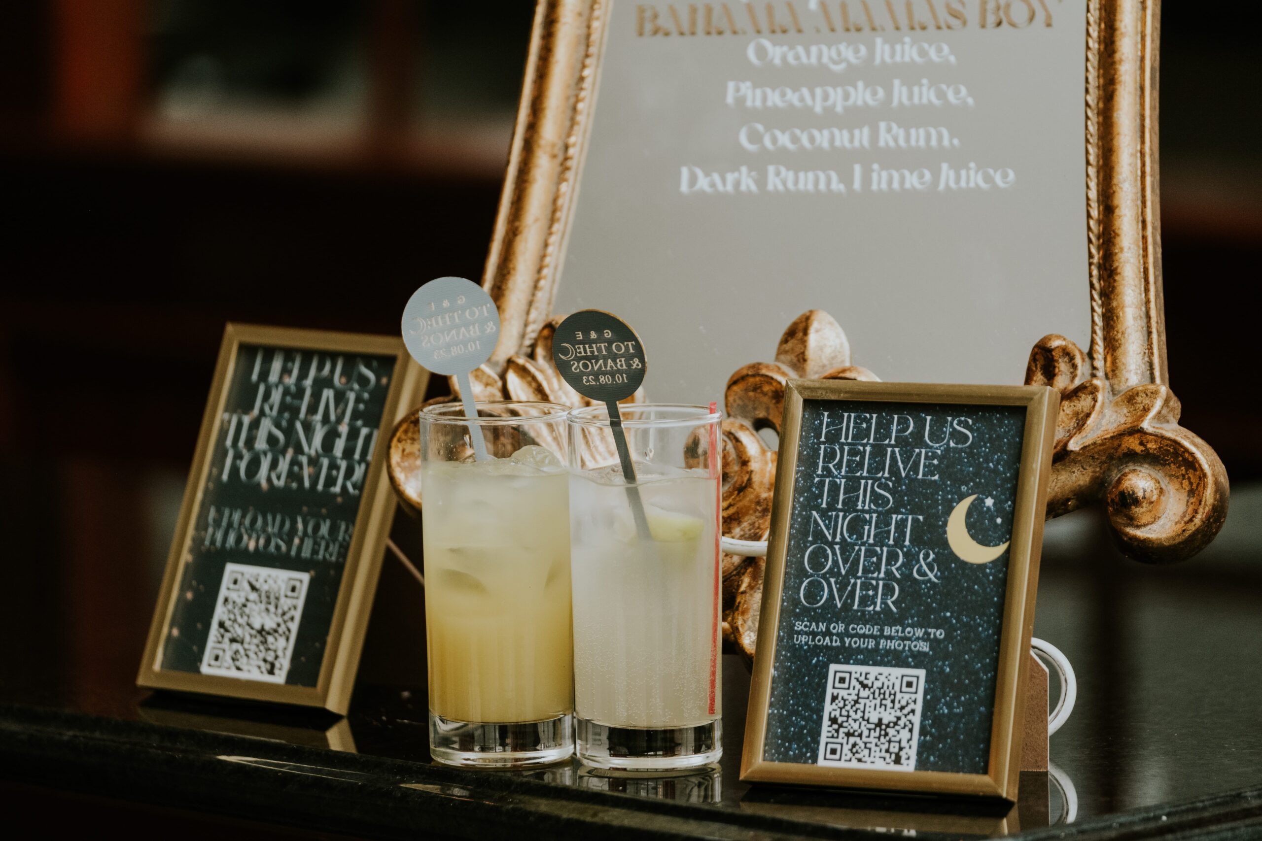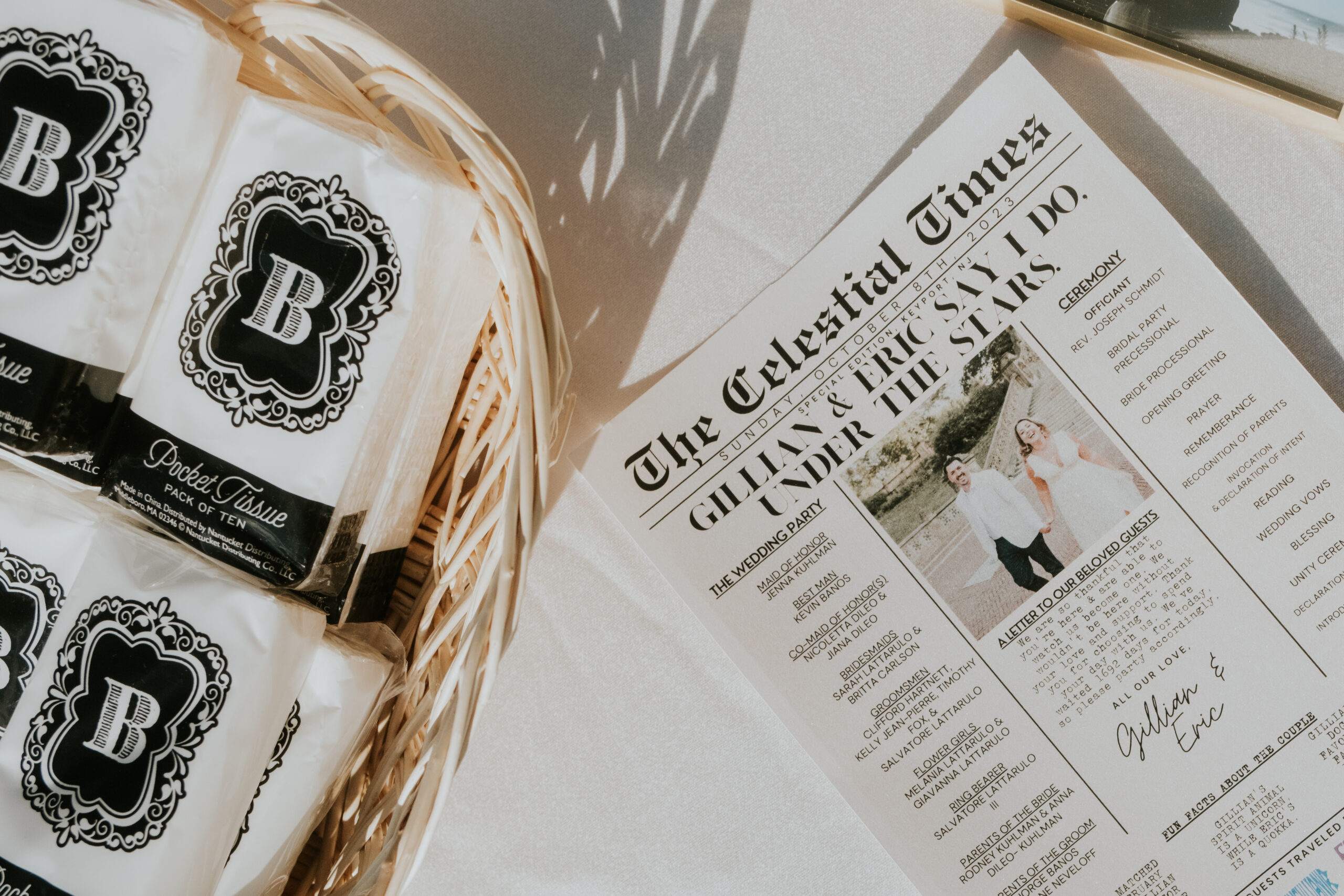Gillian’s passion for astrology sparked the couple’s celestial-themed wedding at Addison Park, which featured a moon arch, newspaper-format programs titled The Celestial Times, and navy and gold accents to fit the mood. Another special detail was their “getaway car” photo shoot, which featured some of their favorite photos. The classic car that Gillian’s dad restored was a white 1975 Buick Riviera convertible with a red interior.