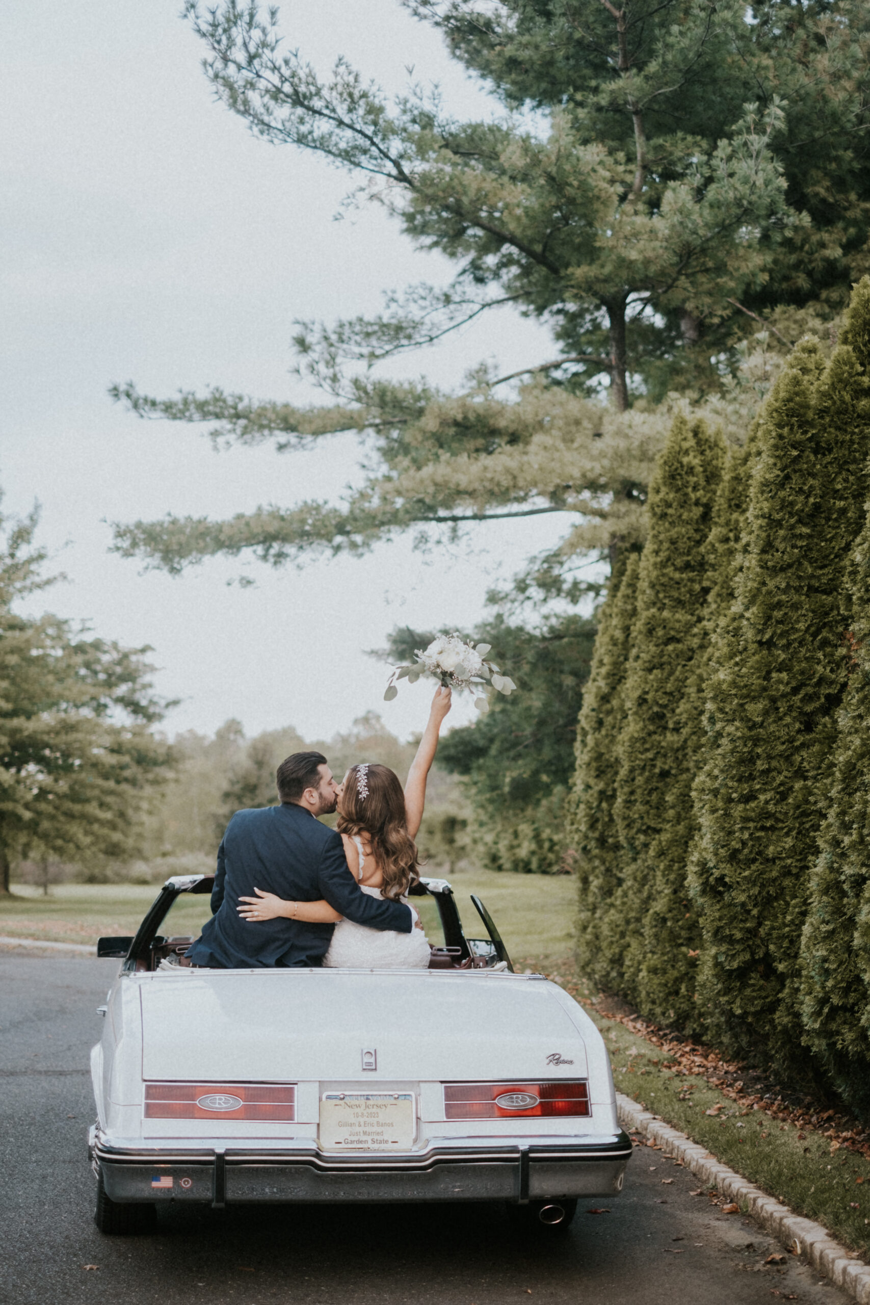 “My absolute favorite part of our wedding was our personalized vows,” says Gillian. “They truly were heartfelt, and so many of our guests told us they could feel our love radiating from the words we spoke to each other.” The couple plans to create an art piece with those sentimental vows. Another keepsake is their “getaway car” photo shoot, which featured some of their favorite photos. The classic car that Gillian’s dad restored was a white 1975 Buick Riviera convertible with a red interior.
