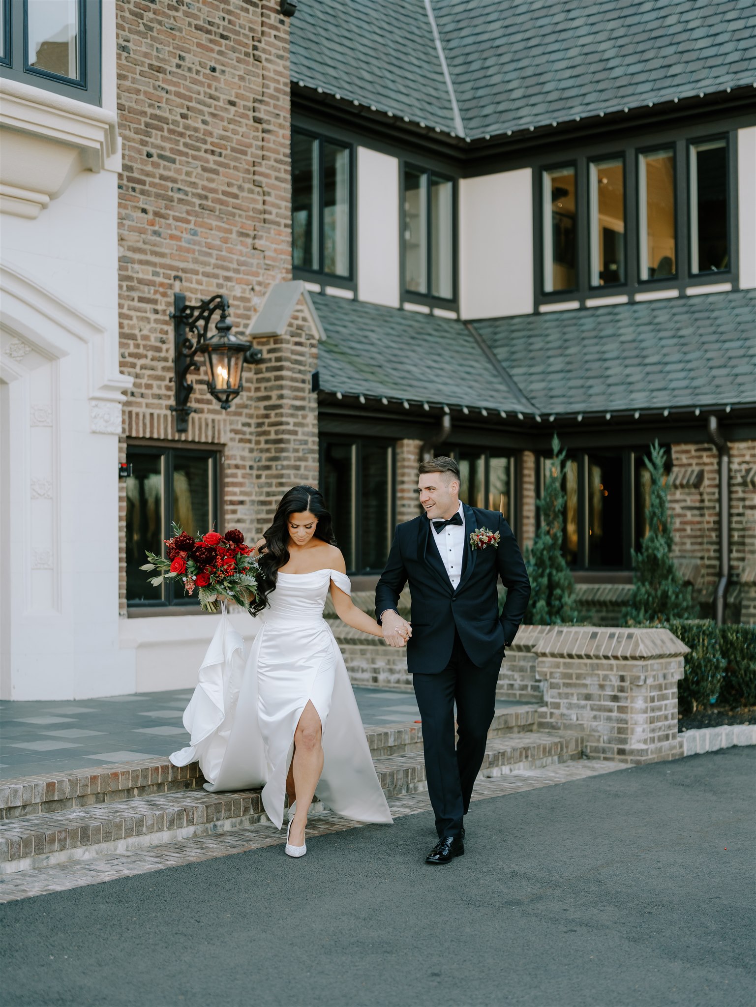 “The floral arrangements were romantic and rich, featuring dancing blooms of crimson and ruby reds, lush textured greenery, and delicate berry accents that tied the winter wonderland palette together.”