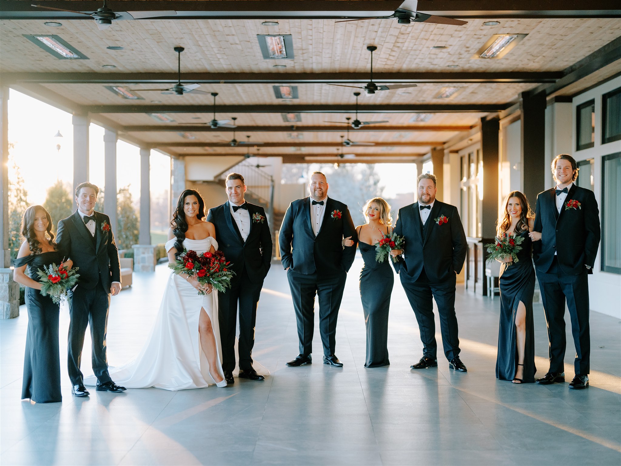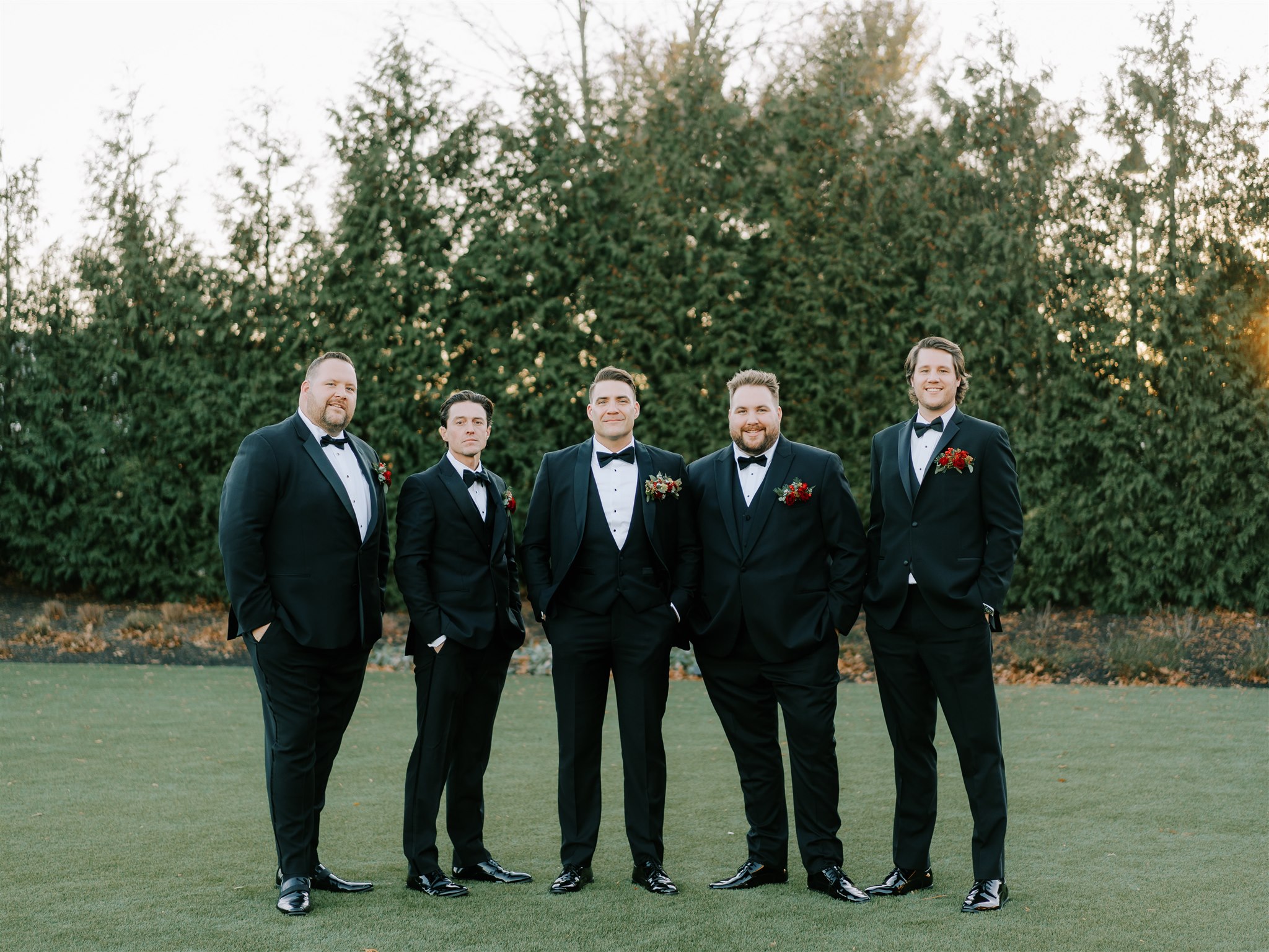 The groomsmen completed the look in classic black tuxedos, perfectly complementing the elegant, black-tie feel of the evening and adding to the timeless holiday glamour of our celebration.