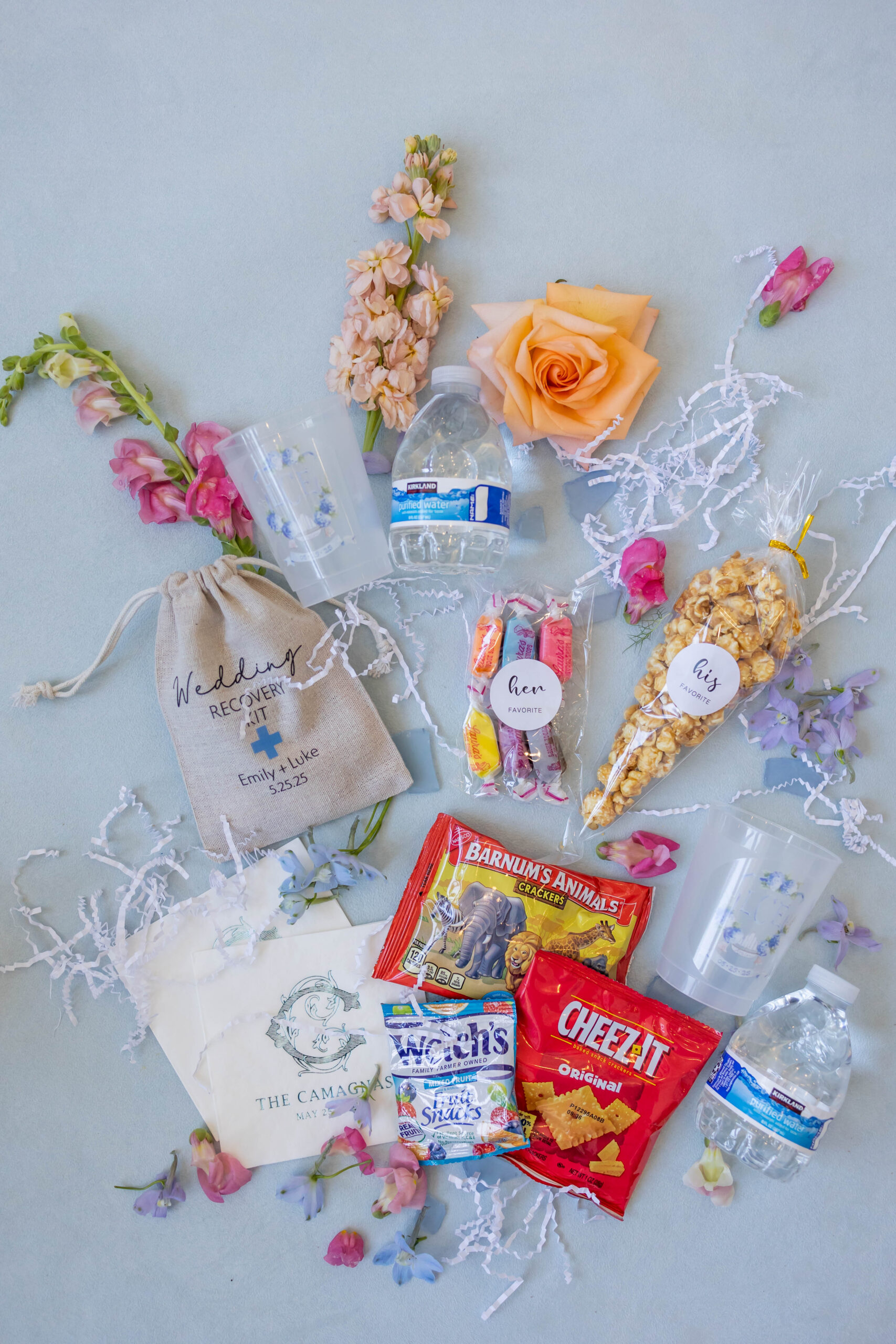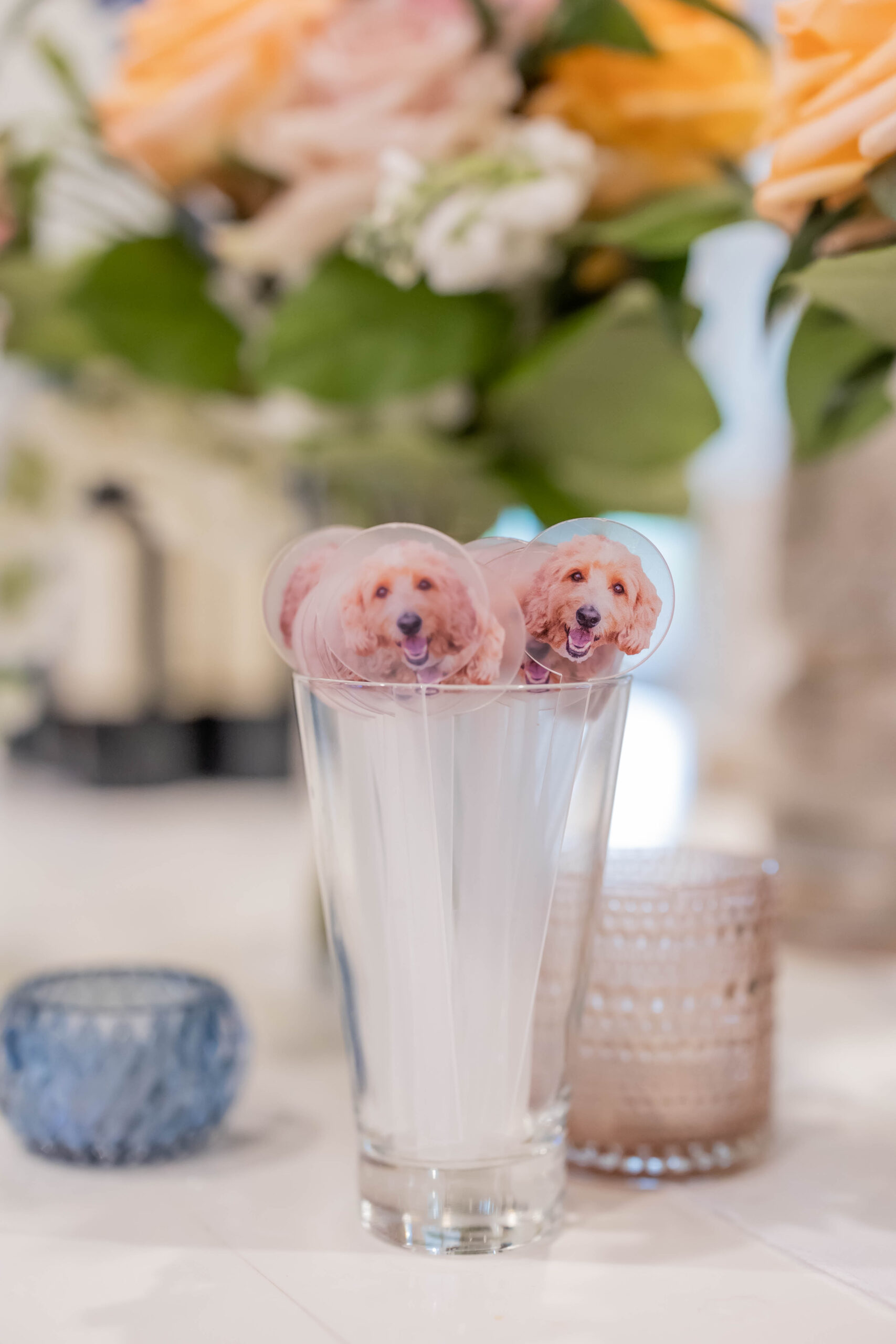 The couple’s mini goldendoodle, Buddy, posed for photos with the duo in a pup tux, and his presence was felt throughout the day with the Buddy Spritz as a signature cocktail and drink stirrers featuring his sweet face.
