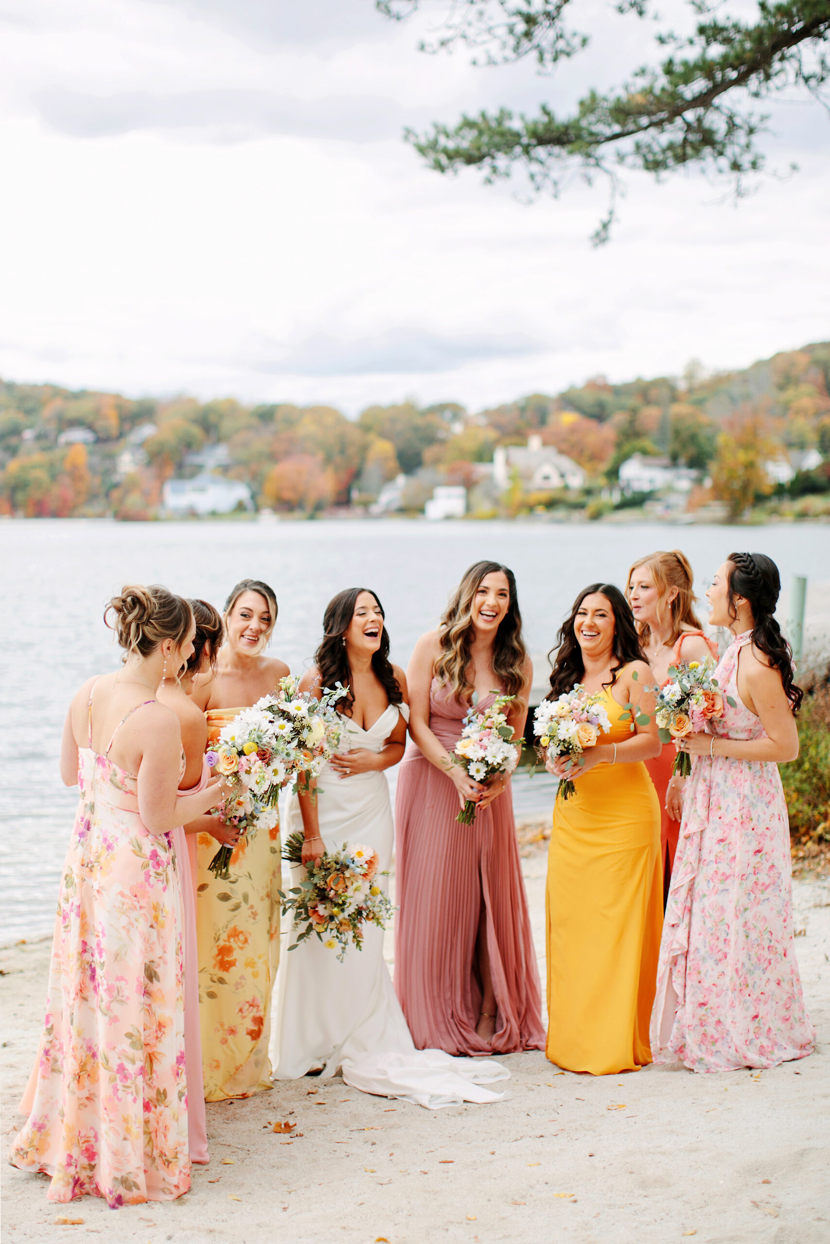 Becca’s bridal party look was one of her first sources of inspiration. She spent weeks pouring over styles, colors, and patterns trying to create a perfectly coordinated mismatched look. Each lady wore a different dress style, with a focus on textures: ruffles, drapery, ruching, cap sleeves, etc. Each dress was a different color, playing in the coral/mustard yellow/burnt orange families and extending even into some mauve and dusty pink. Her 3 matron of honors wore floral patterned dresses, completing the whimsical mix and match theme.