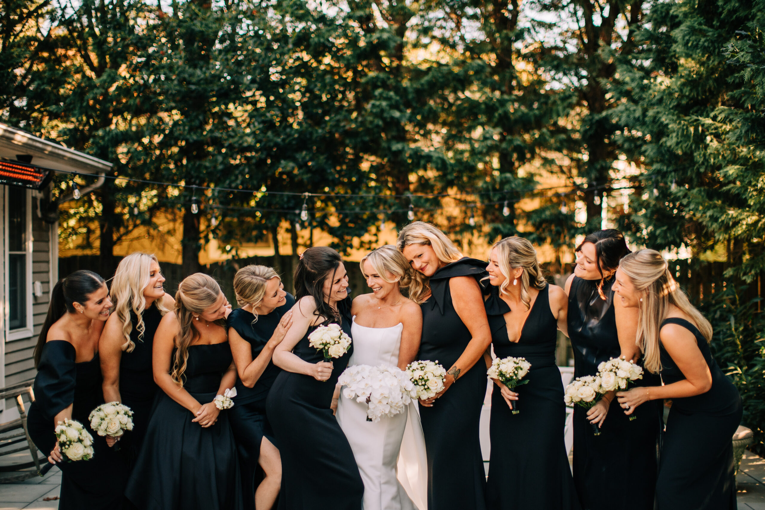 The bride wore an Amsale dress. The bridesmaids donnedall different black dresses that they each picked out to suit them best. The tuxedos were from Boyd’s in Philadelphia.
