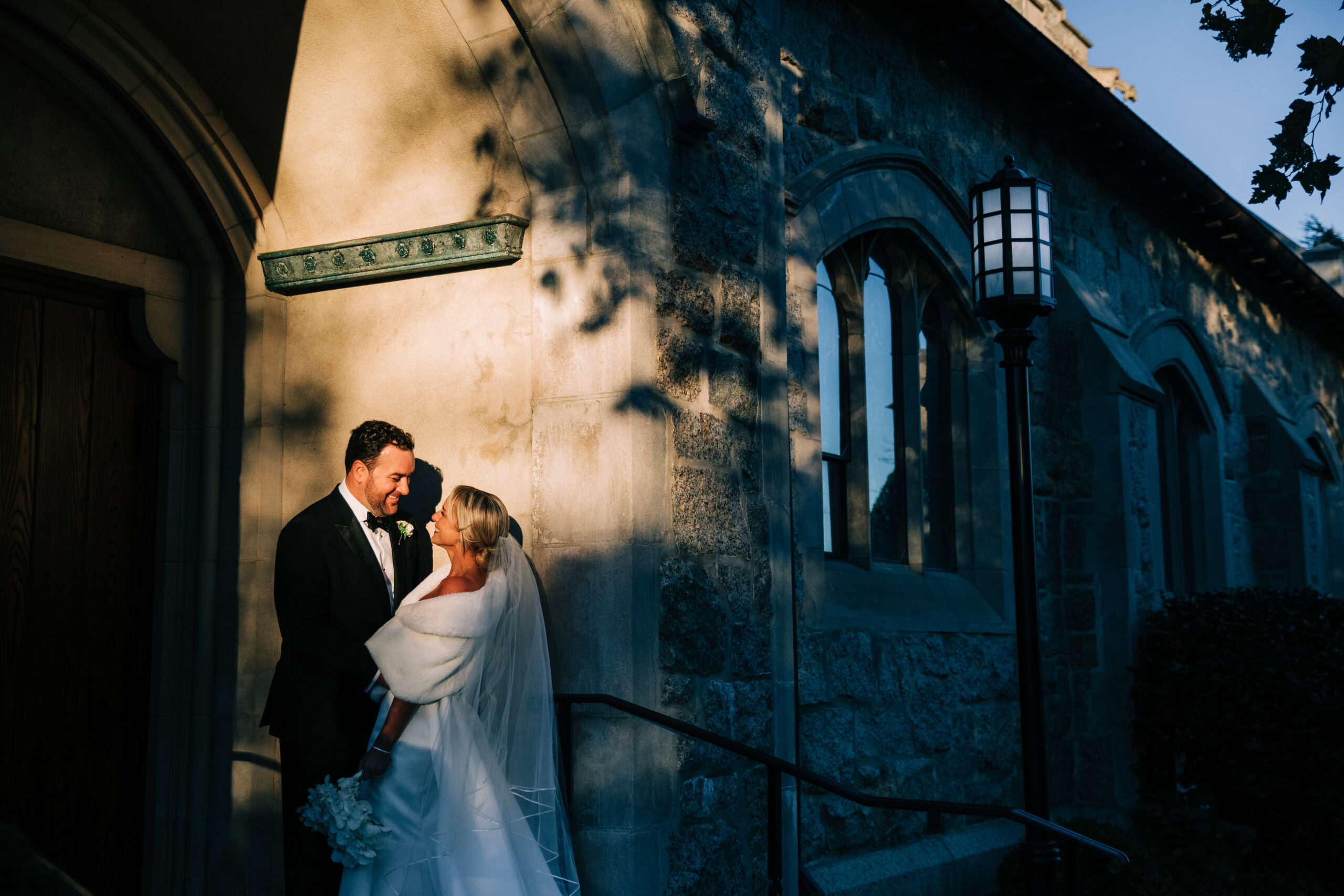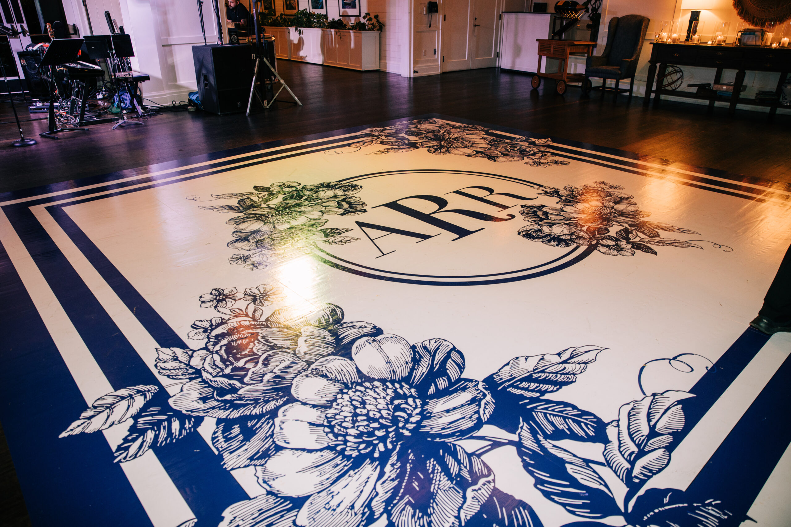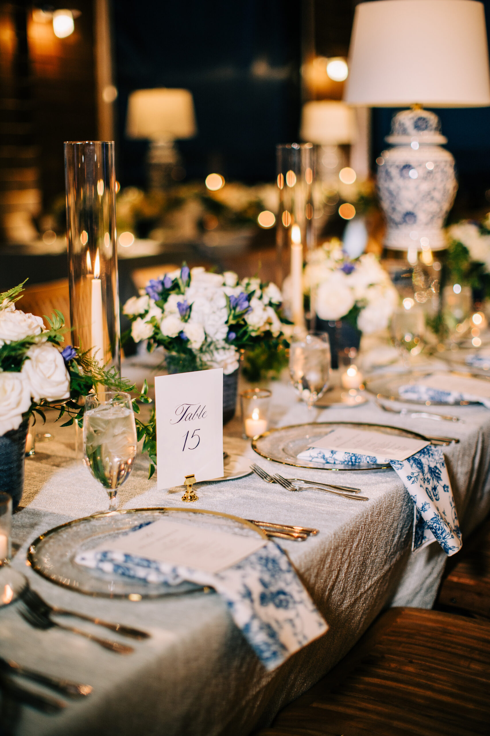 “Dim lighting, an abundance of candles, and blue-and-white accents perfectly complemented the cedar shake building.”